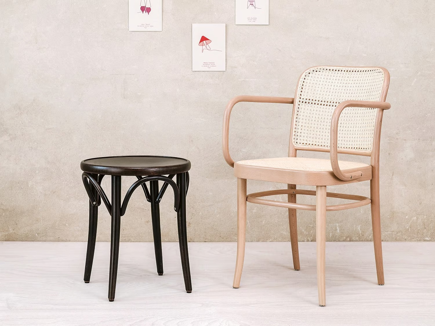 The 811 Chair with armrests, crafted by Ton A.S., draws inspiration from a 1930 design by Josef Hoffmann, merging Art Nouveau influences with straightforward forms. This chair showcases a geometric aesthetic, reflecting the traditional manual bending techniques honed in Bystrice pod Hostynem since 1861. Ideal for dining tables, conference rooms, and cafés, it features an upholstered seat paired with a woven cane backrest, offering both comfort and style. Its durable construction makes it suitable for educational institutions and event venues. The chair's stackable design ensures easy storage, making it a practical choice for spaces requiring flexible seating arrangements. This piece seamlessly integrates into modern design tables and settings, providing ergonomic support and versatile use.