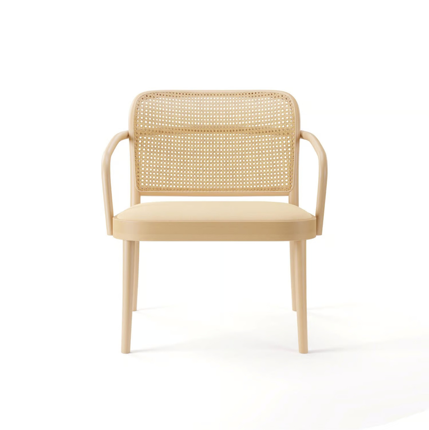 The 811 Easy Chair with armrests offers a blend of timeless elegance and modern functionality, making it an ideal choice for hotels, cafés, lounges, and waiting rooms. This compact piece of furniture features an upholstered seat, providing a comfortable seating solution for any space. Its ergonomic design ensures support and relaxation, while the option for custom upholstery allows for personalized style. The 811 model's classic shapes can be paired with either upholstery or cane weaves, offering versatility in design. Perfect for residential interior designers seeking luxury armchairs, this piece complements modular sofas and other modern lounge furniture, fitting seamlessly into both large and small spaces.