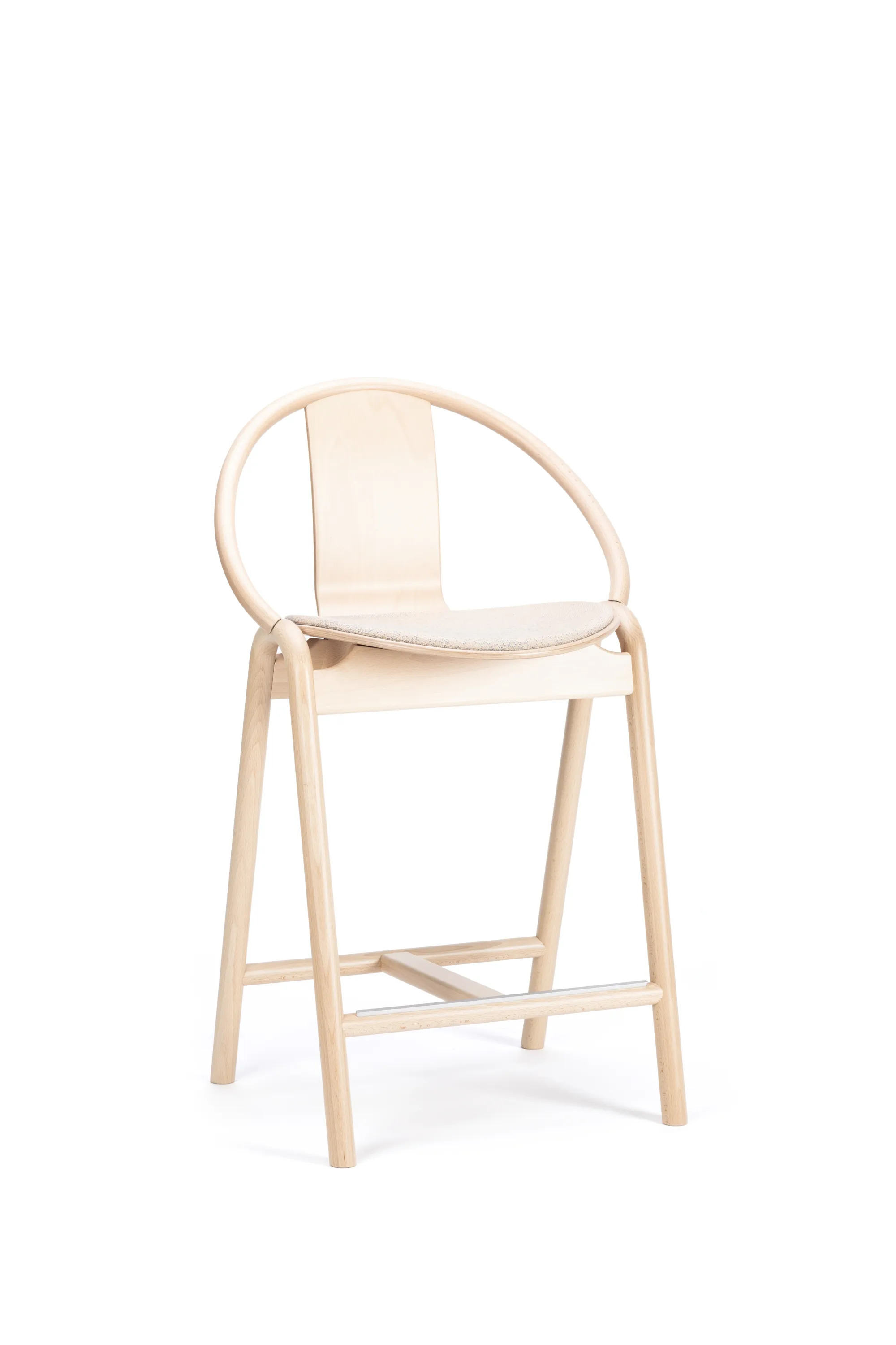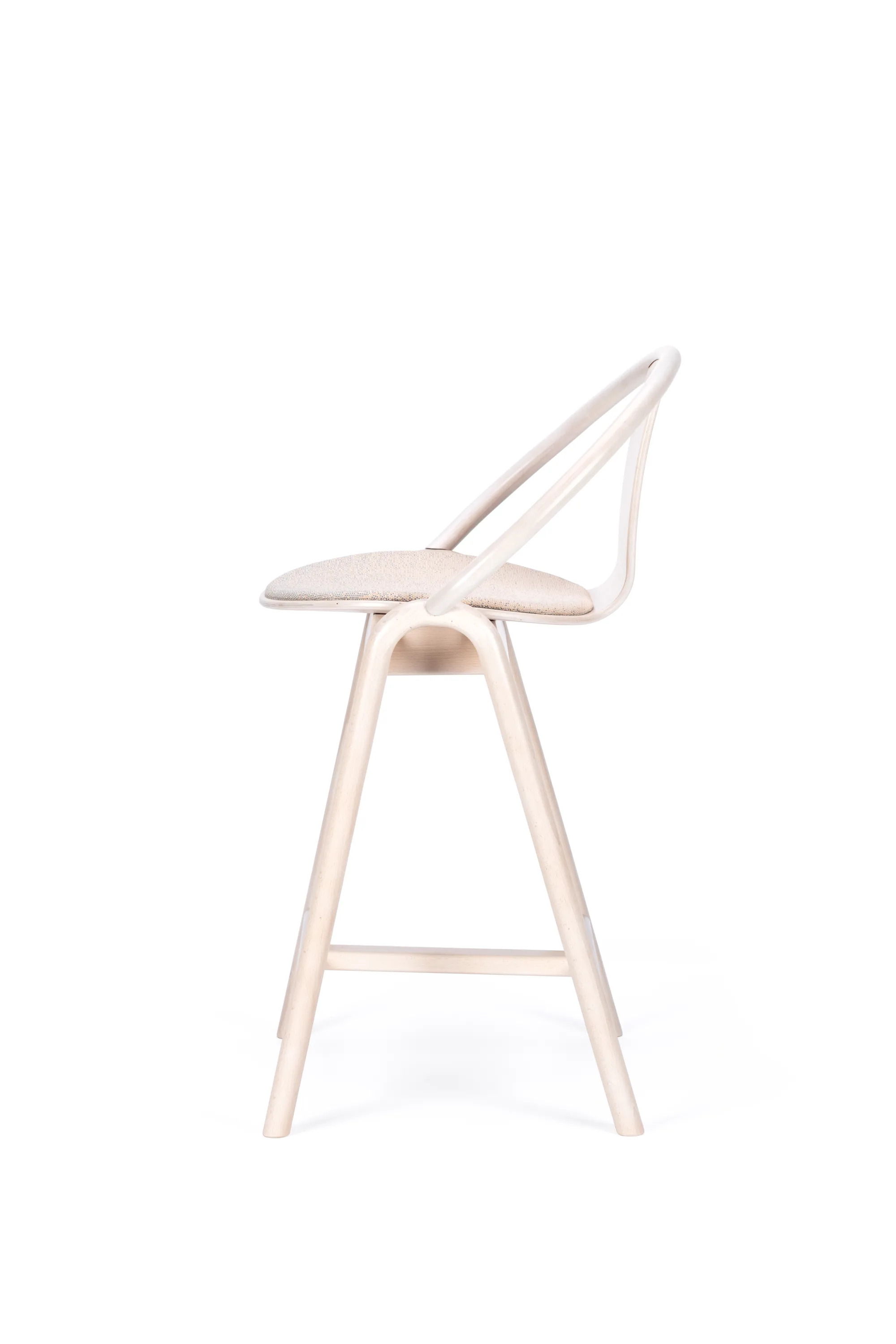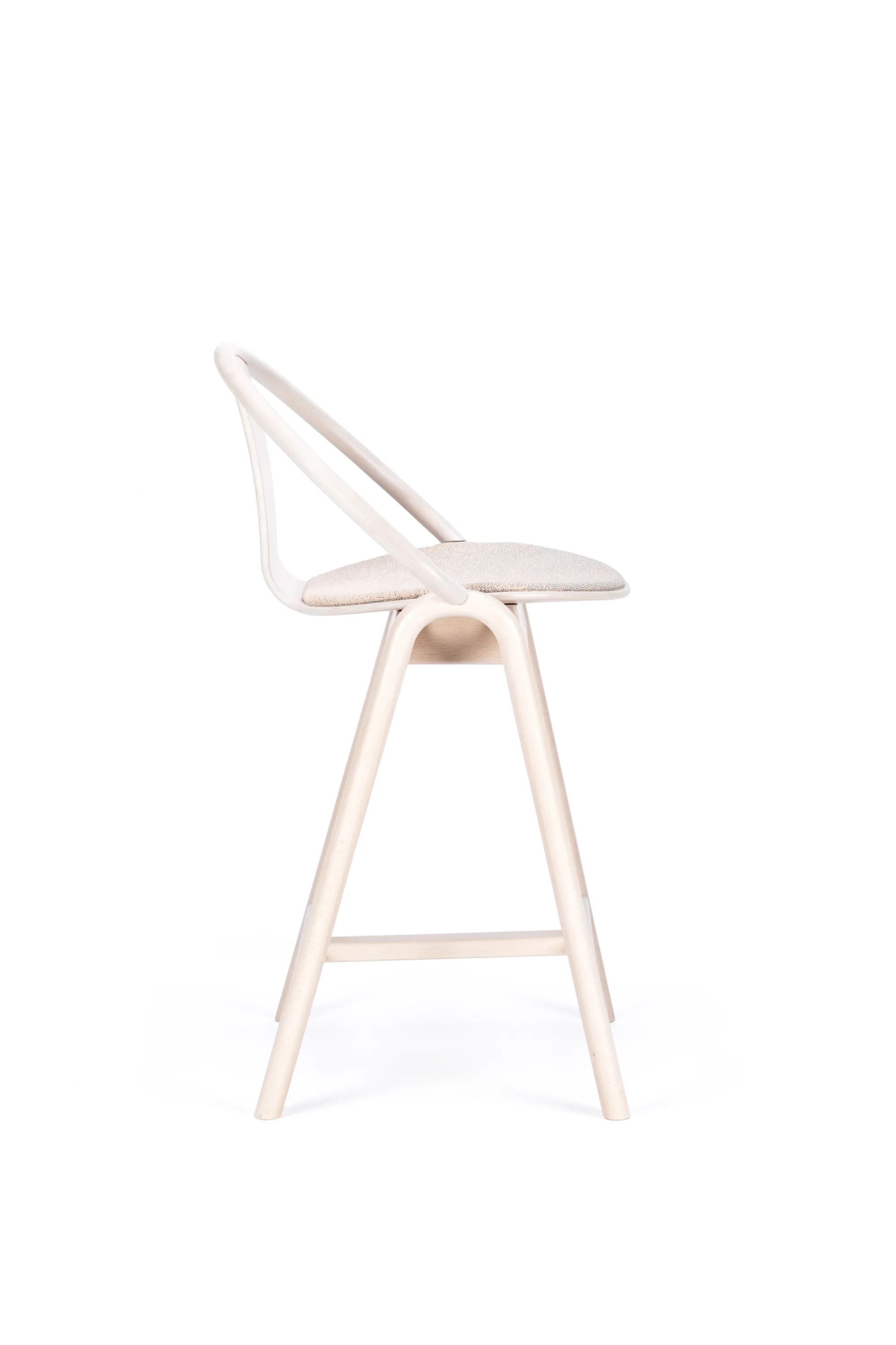 The AGAIN stool, designed by Alex Gufler, is a versatile seating solution ideal for restaurants, conference rooms, coworking spaces, cafés, event venues, and educational institutions. This wooden barstool features an integrated footrest and an upholstered seat, available in fabric or leather. The collaboration with ROHI introduces the Milkyway upholstery fabric, offering a unique pattern that varies slightly across chairs, enhancing its appeal in larger groupings. Available in two heights and various wood finishes, the stool combines modern design with ergonomic comfort. The collection showcases TON's expertise in wood bending, achieving a form typically seen in metal furniture. The design incorporates bent wooden rods and a lightweight, curved plywood seat, ensuring durable seating without visible joins, making it a perfect addition to dining tables and café settings.