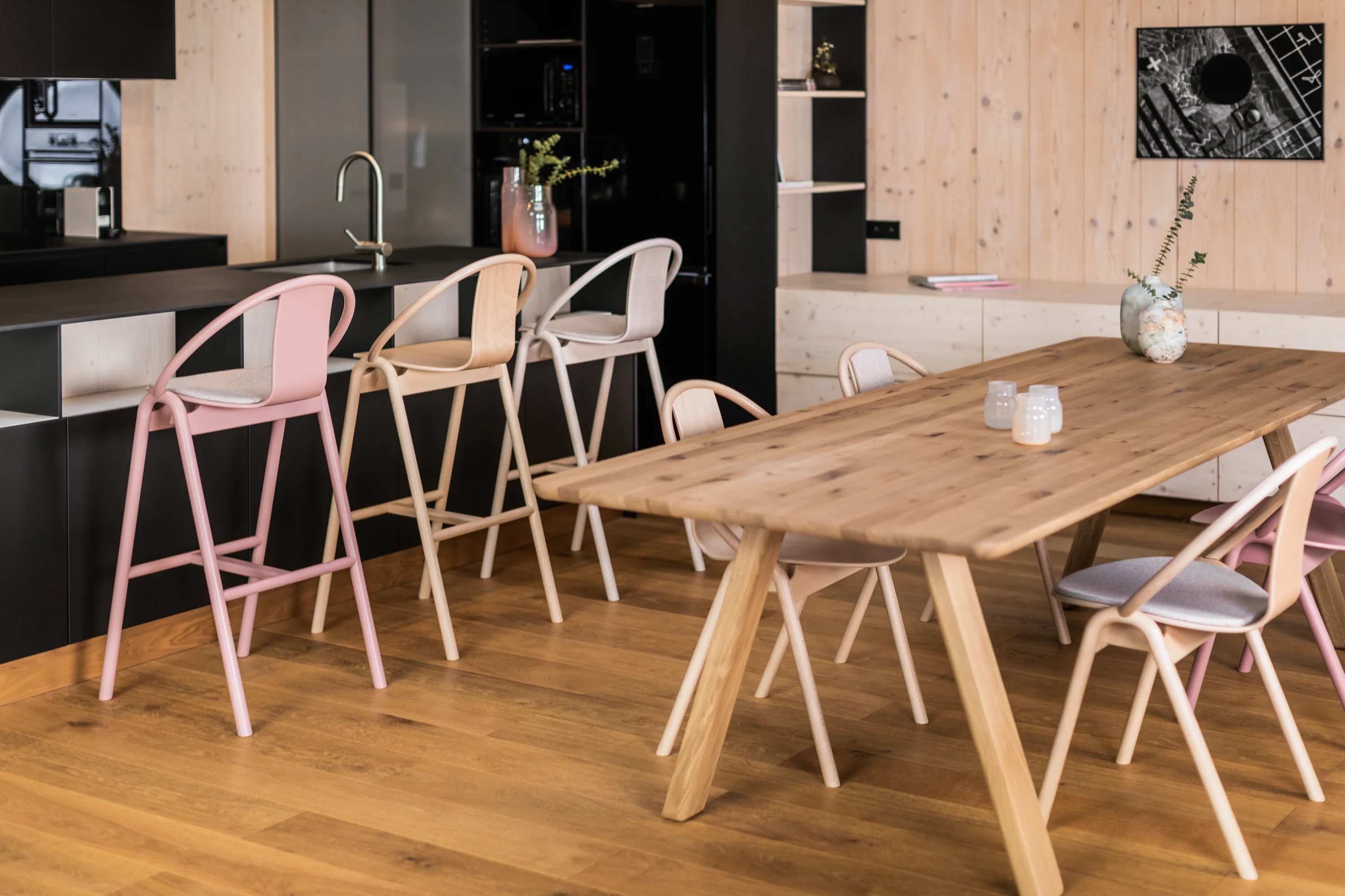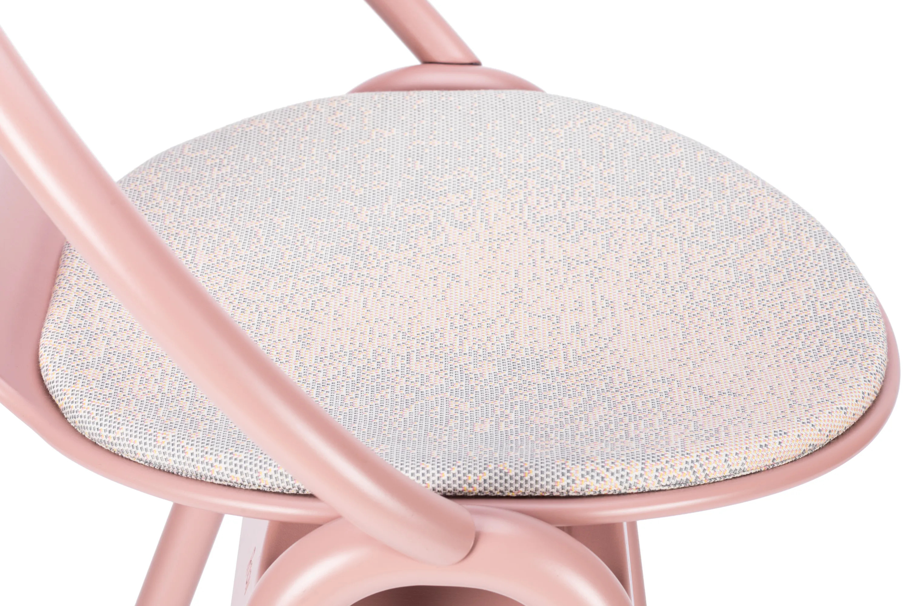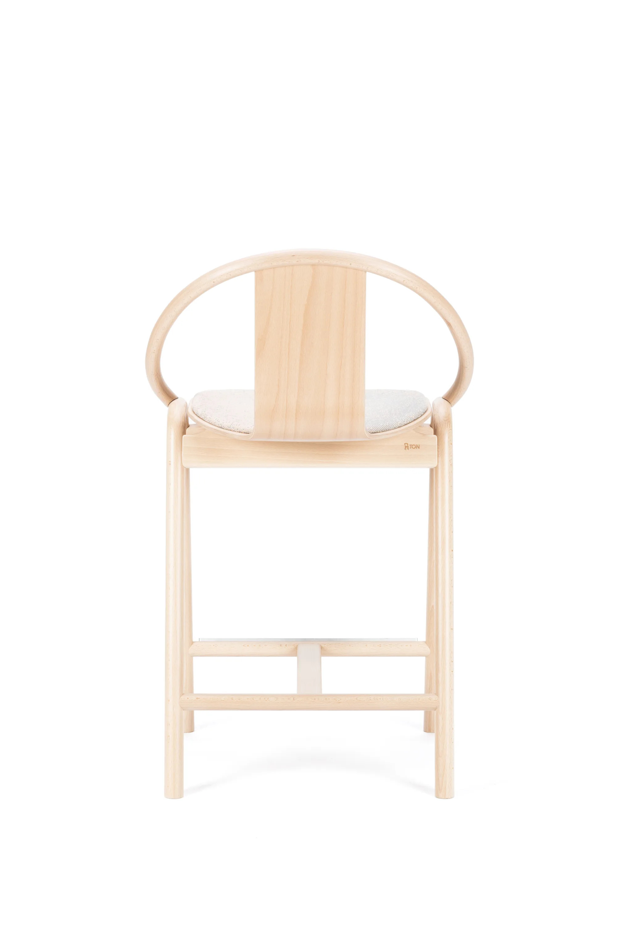The AGAIN stool, designed by Alex Gufler, is a versatile seating solution ideal for restaurants, conference rooms, coworking spaces, cafés, event venues, and educational institutions. This wooden barstool features an integrated footrest and an upholstered seat, available in fabric or leather. The collaboration with ROHI introduces the Milkyway upholstery fabric, offering a unique pattern that varies slightly across chairs, enhancing its appeal in larger groupings. Available in two heights and various wood finishes, the stool combines modern design with ergonomic comfort. The collection showcases TON's expertise in wood bending, achieving a form typically seen in metal furniture. The design incorporates bent wooden rods and a lightweight, curved plywood seat, ensuring durable seating without visible joins, making it a perfect addition to dining tables and café settings.