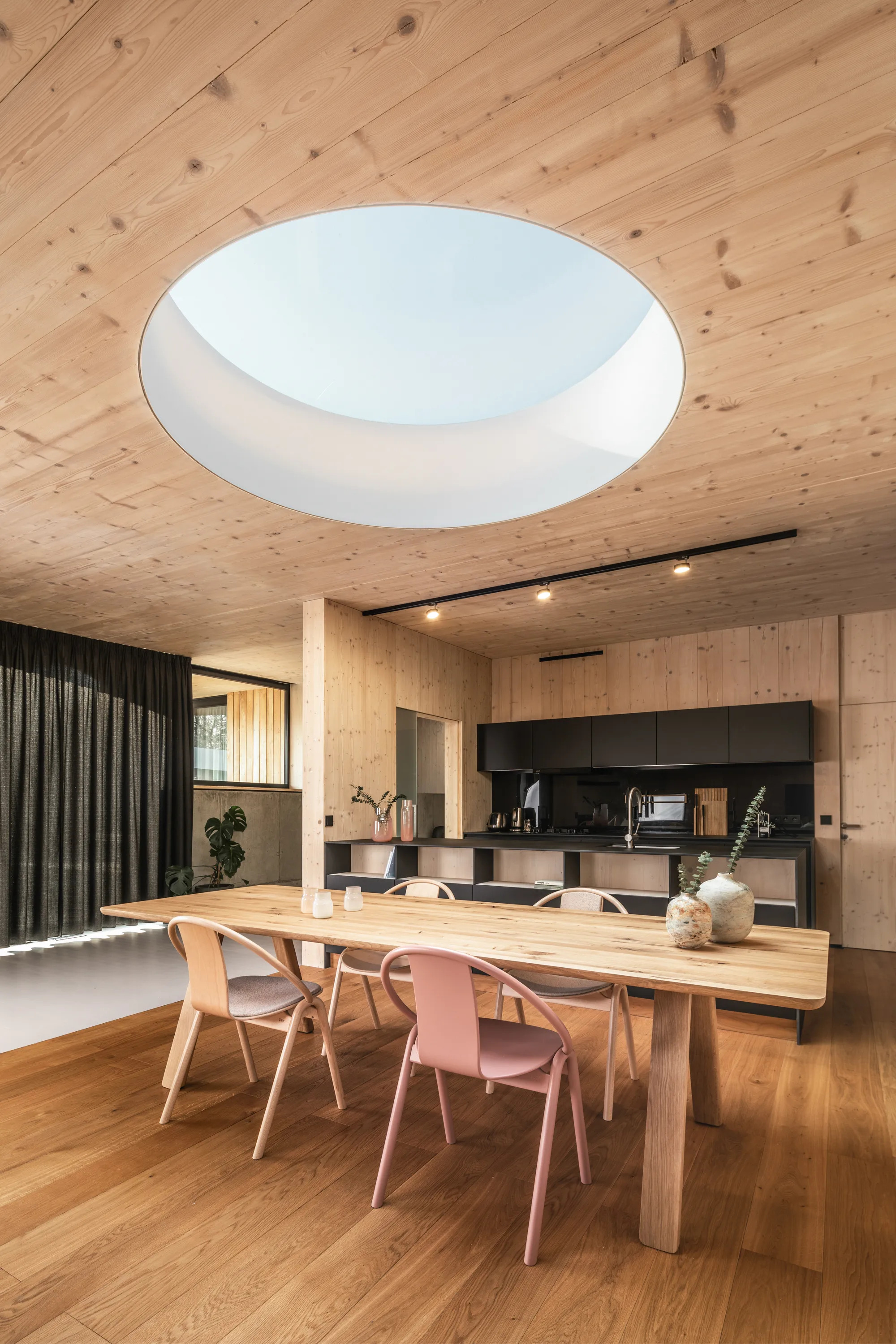 The AGAIN upholstered chair is a versatile seating solution ideal for restaurants, conference rooms, coworking spaces, cafés, event venues, and educational institutions. Designed by Alex Gufler, this stackable chair combines modern design with ergonomic comfort, featuring a gently curved plywood seat and backrest upholstered in premium wool fabric. The collaboration with ROHI introduces the Milkyway fabric, offering a unique pattern that varies subtly across chairs, enhancing visual appeal in larger groupings. Available in various wood finishes, the chair's construction showcases TON's expertise in wood bending, ensuring durability and strength. With a stackability of up to four chairs, it provides practical and space-saving options for dining tables and conference room furniture.