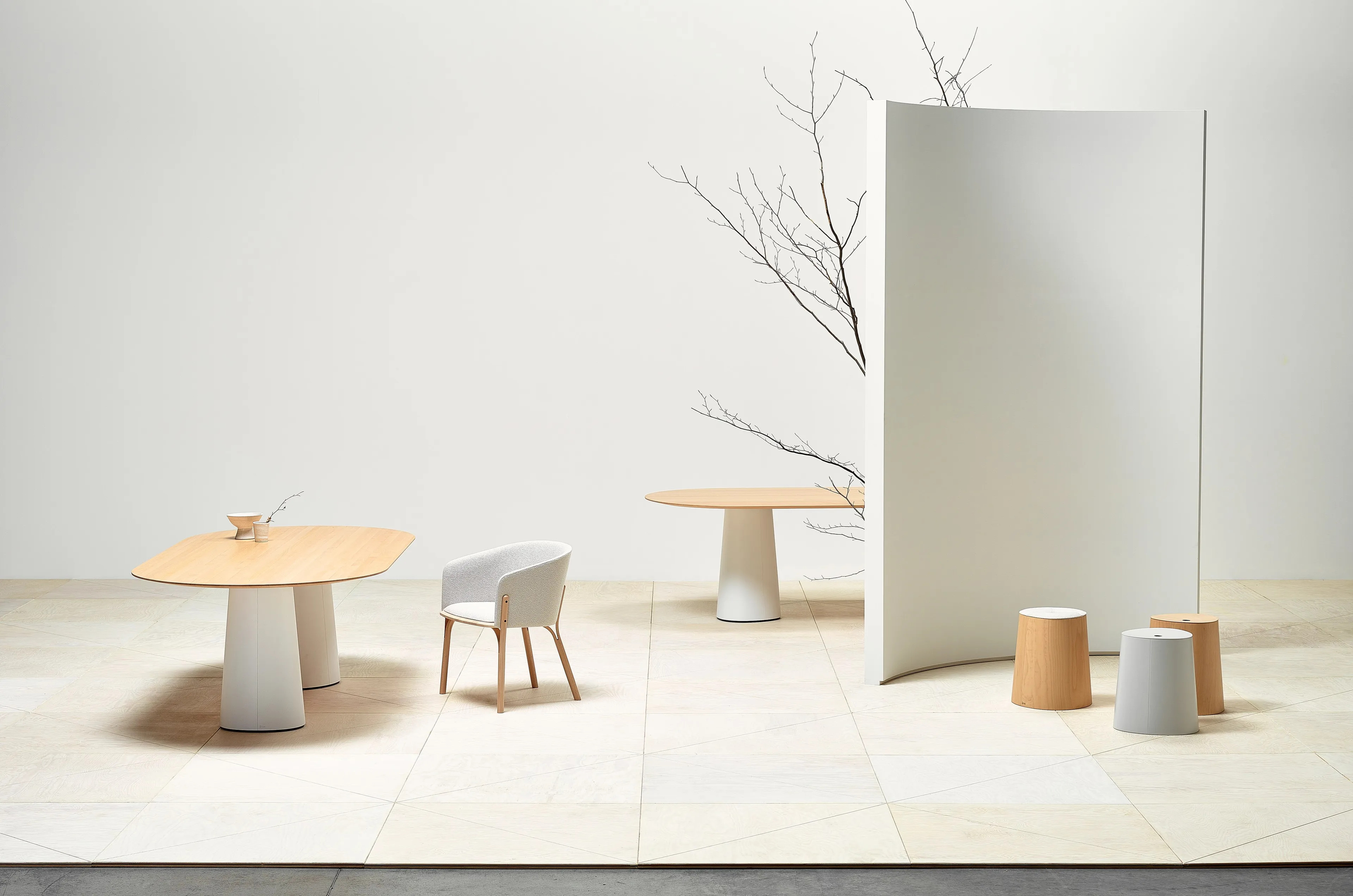 P.O.V. 464 is a versatile wooden table designed for diverse environments such as restaurants, conference rooms, coworking spaces, cafés, and educational institutions. Standing at 73 cm high and 40 cm wide, its dual bases ensure stability and support for a spacious tabletop. This model offers compatibility with three distinct tabletop shapes, enhancing its adaptability. The P.O.V. collection is characterized by its modular design and organically shaped base, available in two heights, three base types, and six tabletop shapes, offering nearly 70 variations. This flexibility makes it an ideal choice for various settings. The collection also includes stackable café chairs, providing durable and ergonomic seating options. Crafted from beech, oak, or American walnut, the tables and chairs are available in a range of finishes, ensuring a modern design that complements any interior.