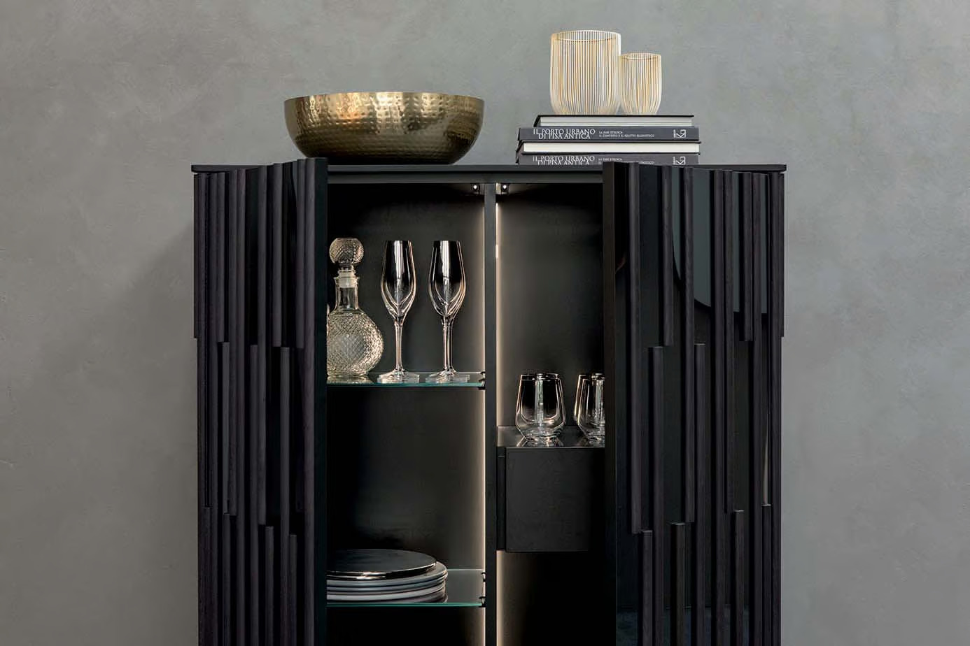 The DROPS Highboard offers a sophisticated storage solution for various environments, including offices, boutique shops, hotels, libraries, and coworking spaces. This modular storage furniture features solid wood elements meticulously crafted to enhance the mirror-effect doors, providing a sleek and modern aesthetic. The elegantly shaped and rounded top complements its minimalist design, while the metal frame with gold-finish inserts adds a touch of luxury. Ideal for space-saving storage systems, this versatile piece serves as an excellent option for lockable office cabinets, retail shelving solutions, and hotel room storage. Its durable construction ensures longevity, making it a reliable choice for both professional and personal settings.
