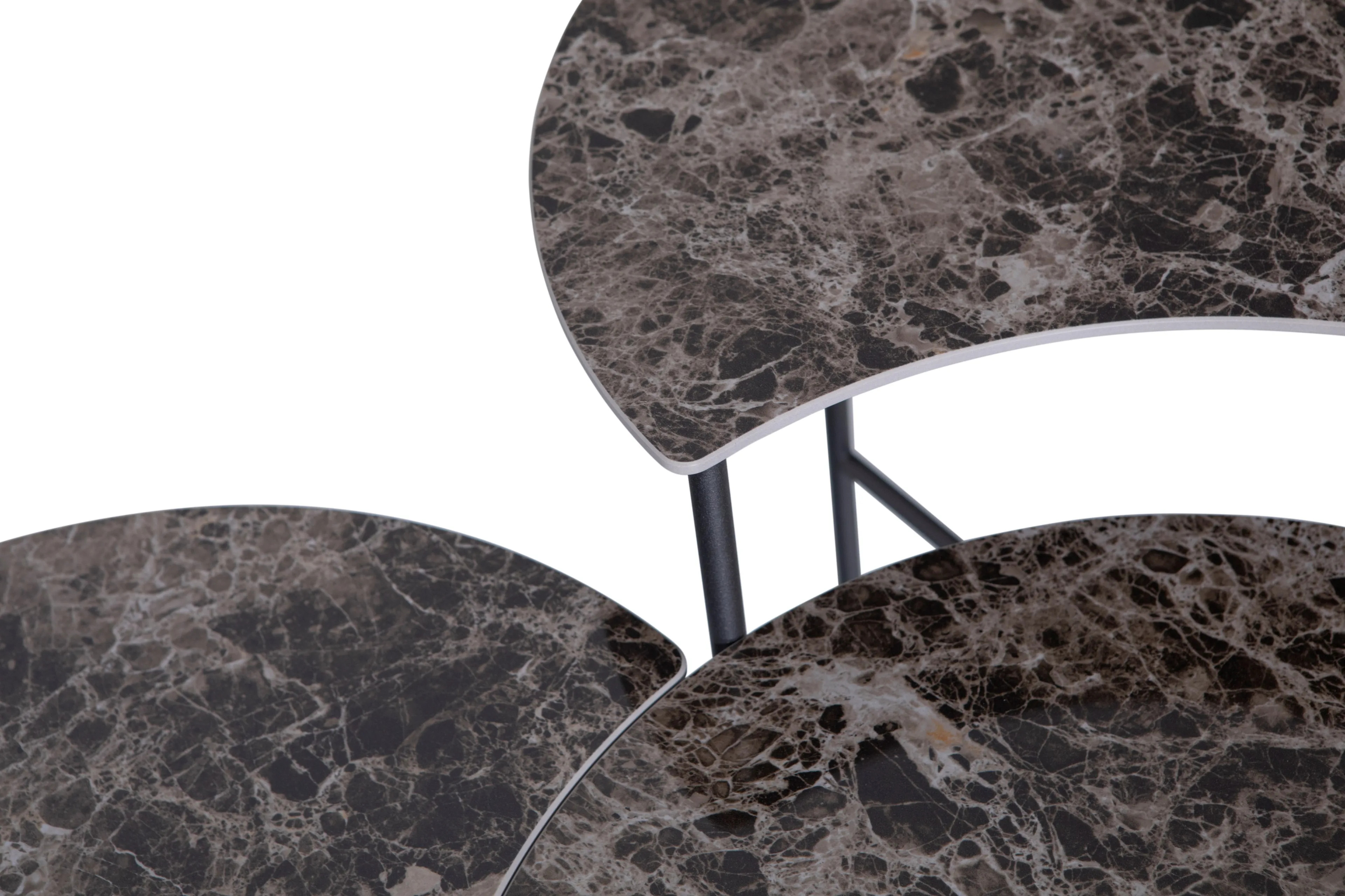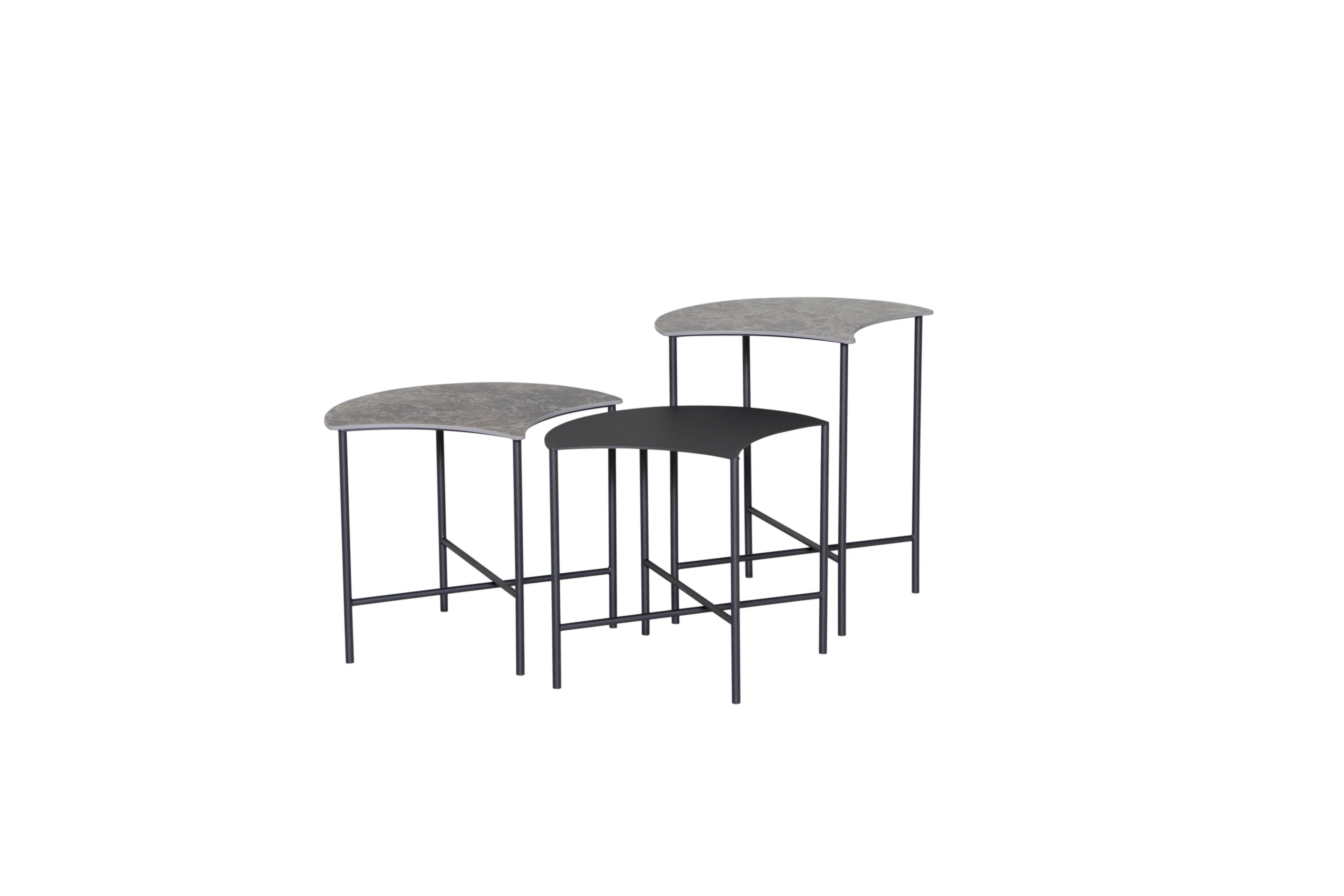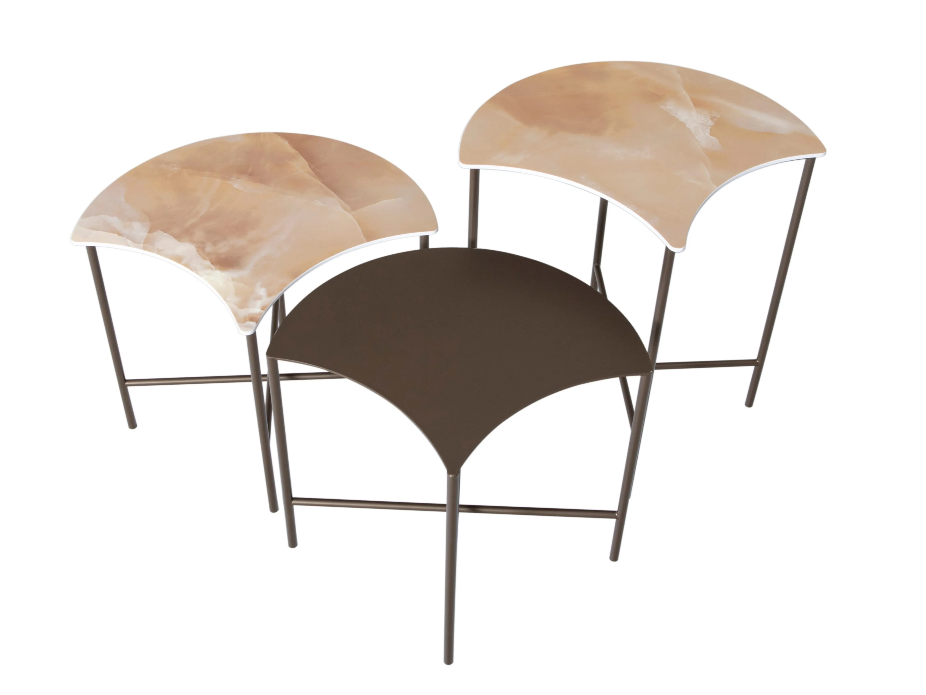 The GINCO collection features tables with a nature-inspired design, characterized by a light tubular frame and a fan-shaped top reminiscent of the Ginco leaf. These modern design tables are ideal for restaurants, conference rooms, coworking spaces, cafés, event venues, and educational institutions. The tables maintain a harmonious aesthetic even when placed side by side, showcasing an elegant and distinctive design. Available finishes for the porcelain stoneware top include onyx grey, statuario altissimo, Portoro, onyx amber, and Emperador. The metal structure is offered in matt white, carbon grey, and matt stone bronze. Complementing these tables, the collection includes ergonomic and stackable café chairs, providing durable seating solutions suitable for various settings.
