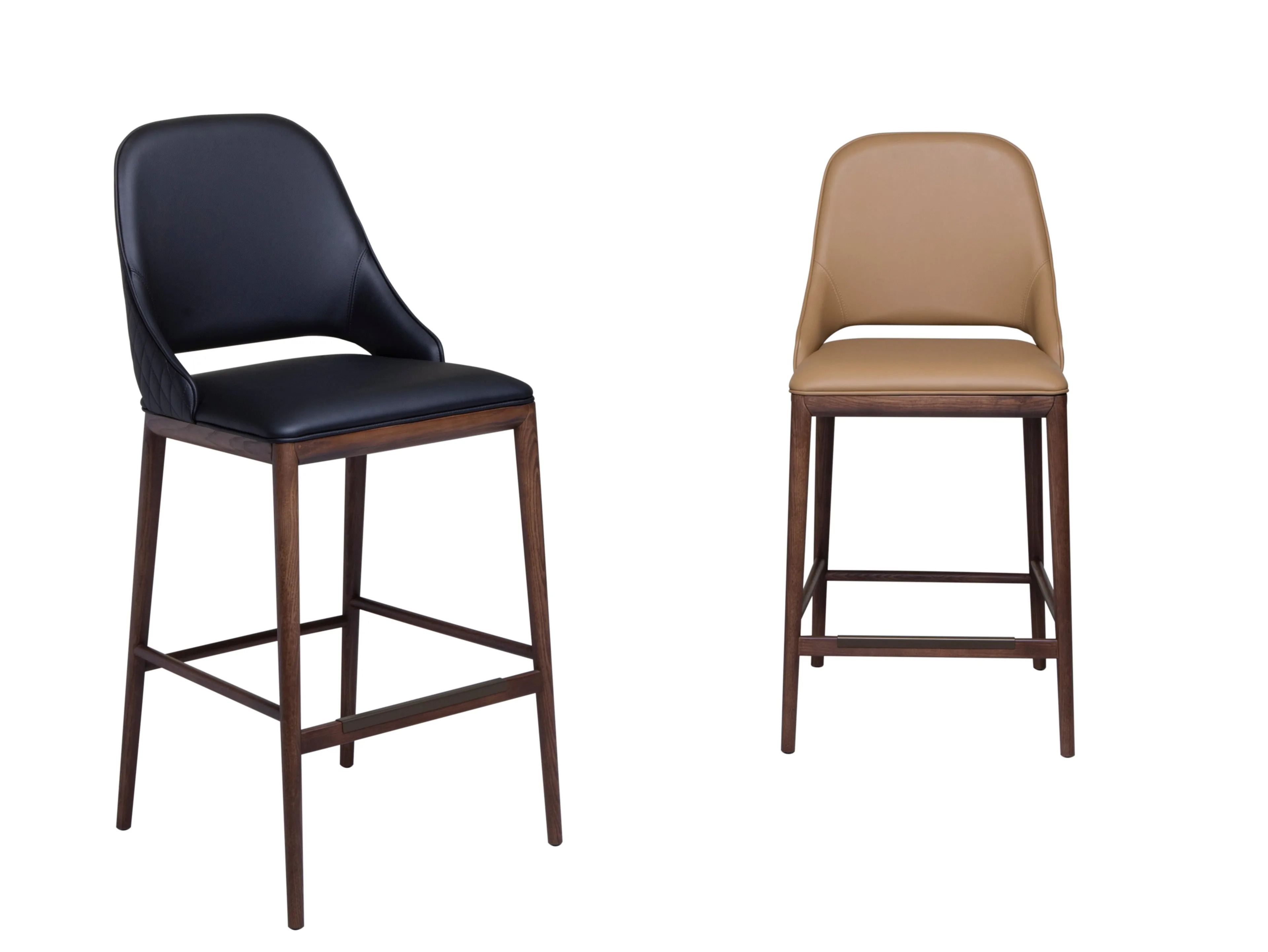 The MALVA ÉLITE Leather Stool offers a sophisticated seating solution for diverse environments such as restaurants, conference rooms, coworking spaces, cafés, event venues, and educational institutions. This high stool features a wooden base available in Canaletto walnut, dark oak, or black ash finishes, complemented by an upholstered seat in leather, eco-leather, or fabric. Its design is characterized by defined lines, curved armrests, and a slender base, providing a distinctive presence in any setting. The Elite version is enhanced with exclusive diamond quilting on the back, adding a touch of elegance. Ideal for use with dining tables and modern design tables, this stool is a perfect addition to café chairs and conference room furniture, offering durable and ergonomic seating options. Its stackable design ensures practicality and convenience for various spaces.