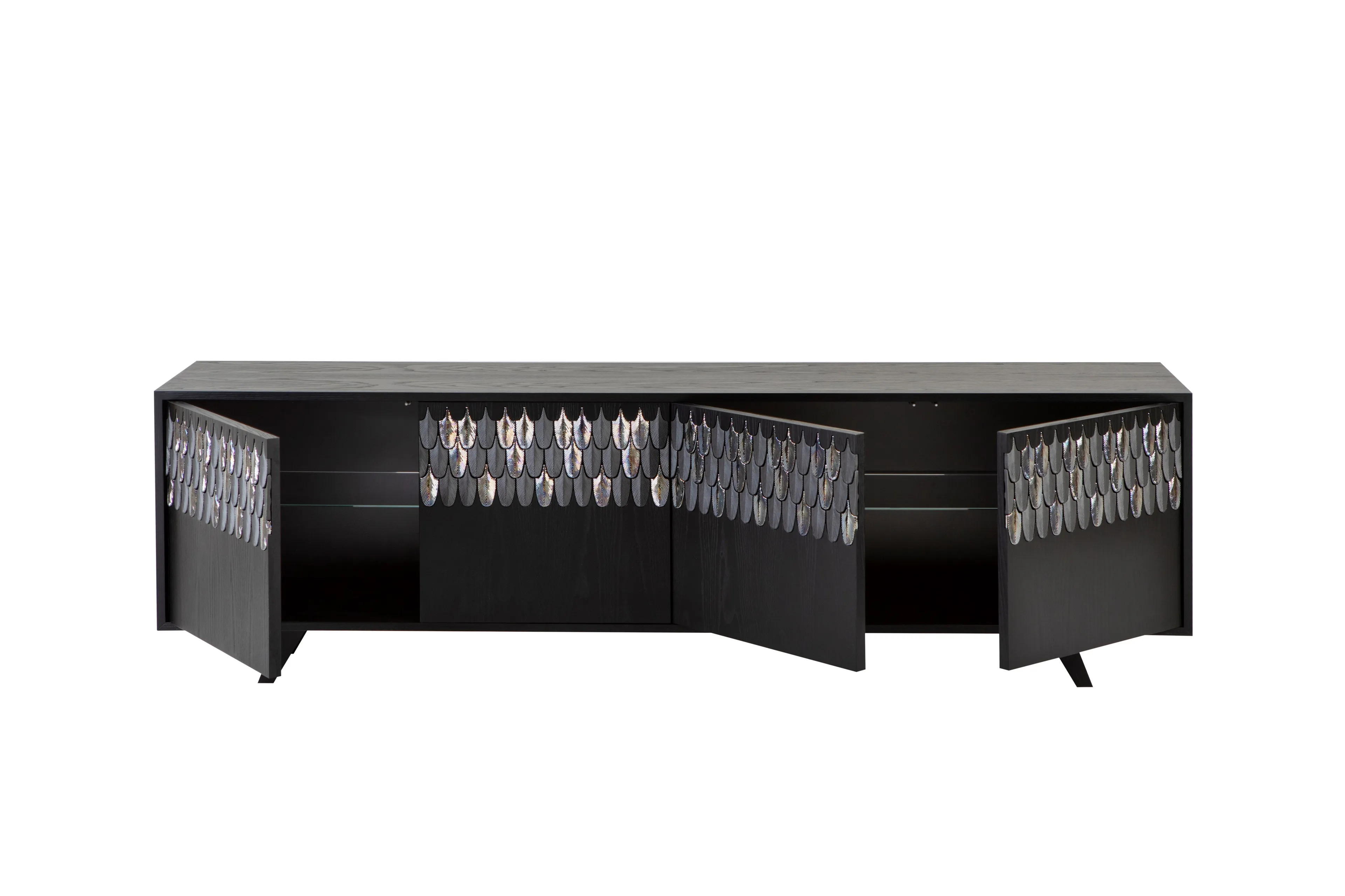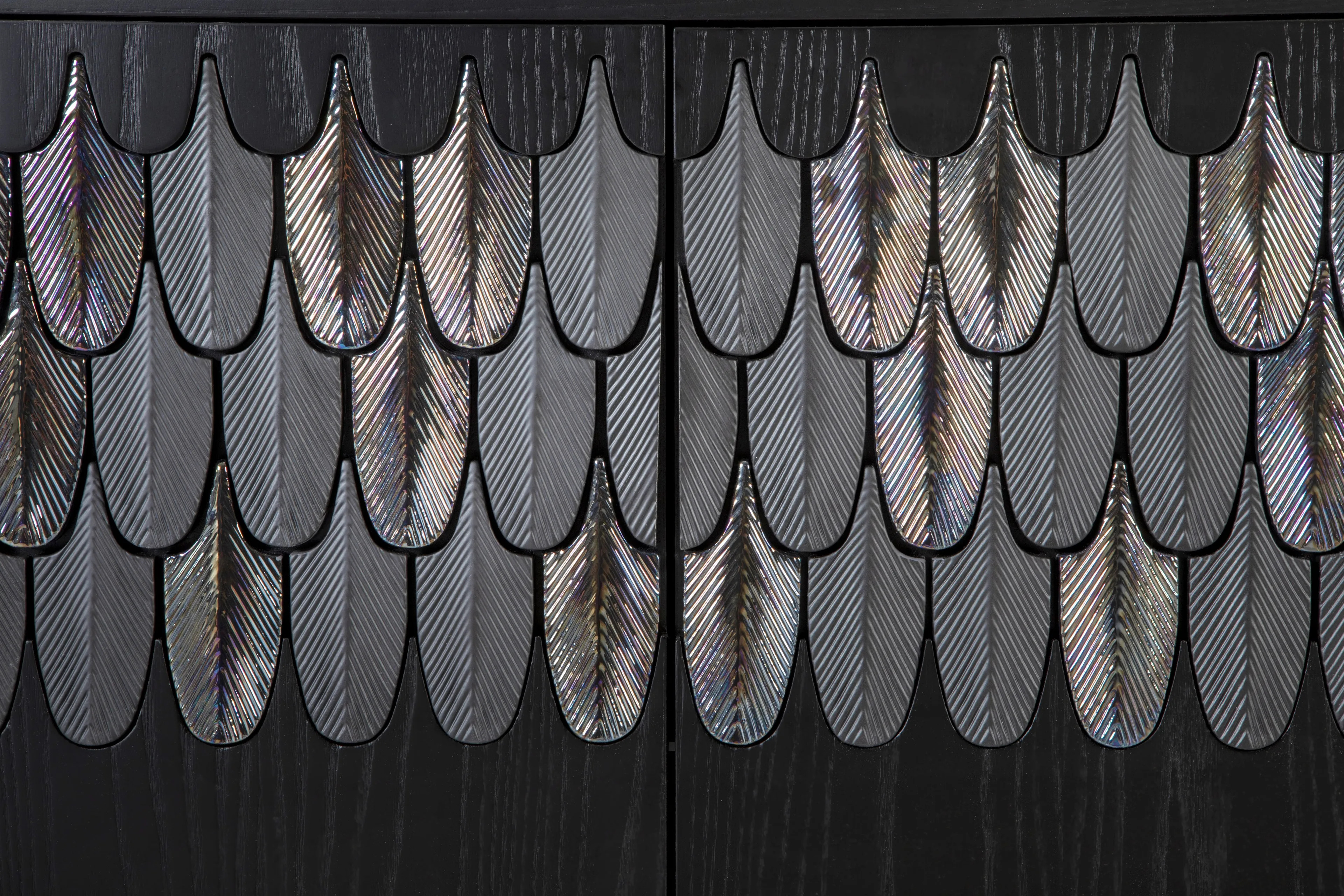 The PLUME storage unit, designed by Cristina Celestino for BottegaNove, exemplifies a blend of artistry and meticulous craftsmanship. This modular storage furniture features doors adorned with a delicate cascade of overlapping ceramic feathers, each displaying lustrous shades crafted by skilled artisans. Ideal for offices, boutique shops, hotels, libraries, and coworking spaces, this piece serves as a versatile storage solution. Its minimalist design and durable construction make it suitable for various environments, from lockable office cabinets to retail shelving solutions. The PLUME collection's unique ceramic mosaics offer a distinctive aesthetic, making it a stylish addition to any setting, whether as hotel room storage or a sophisticated element in a home or workspace.