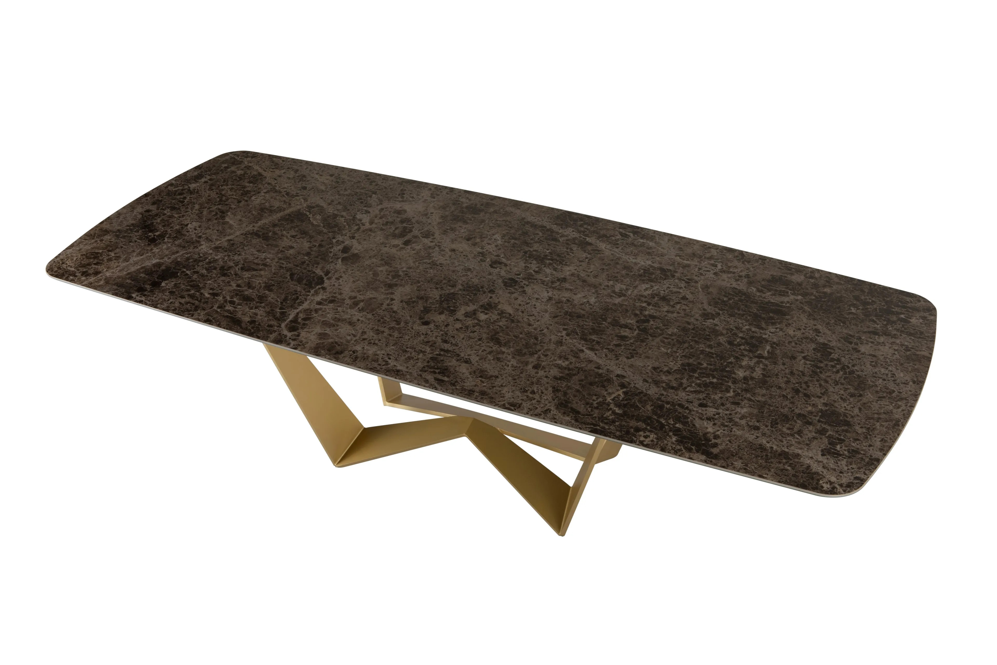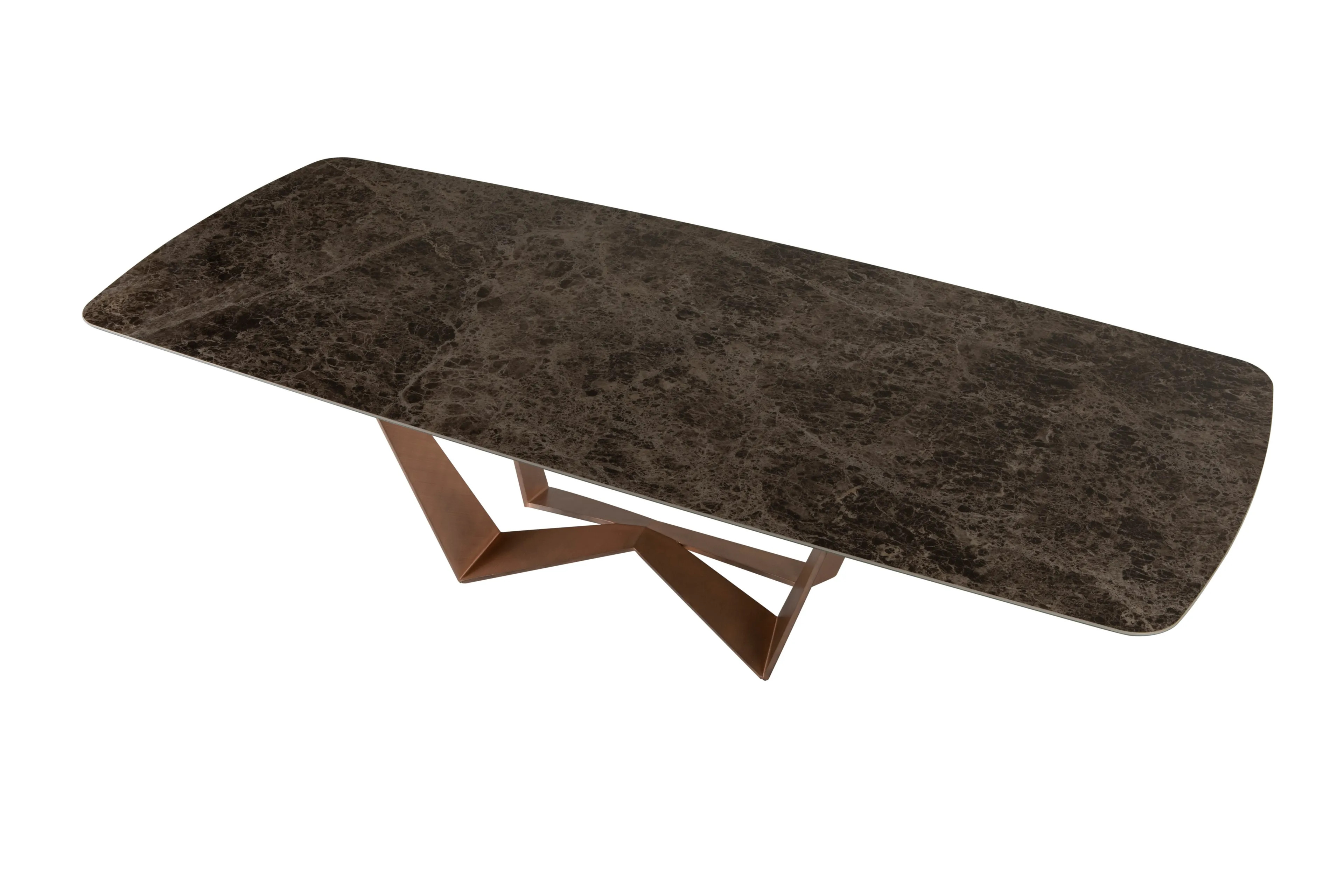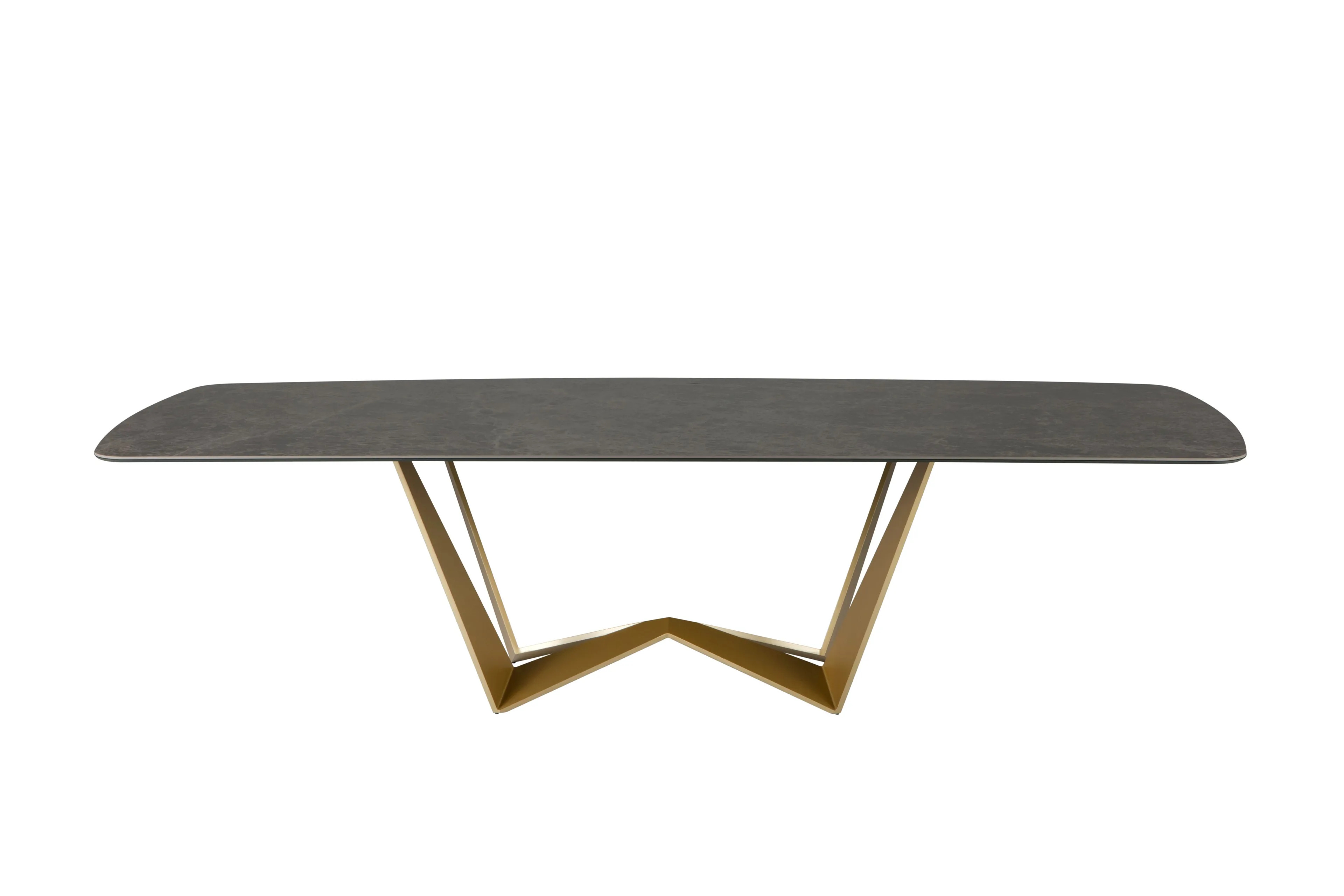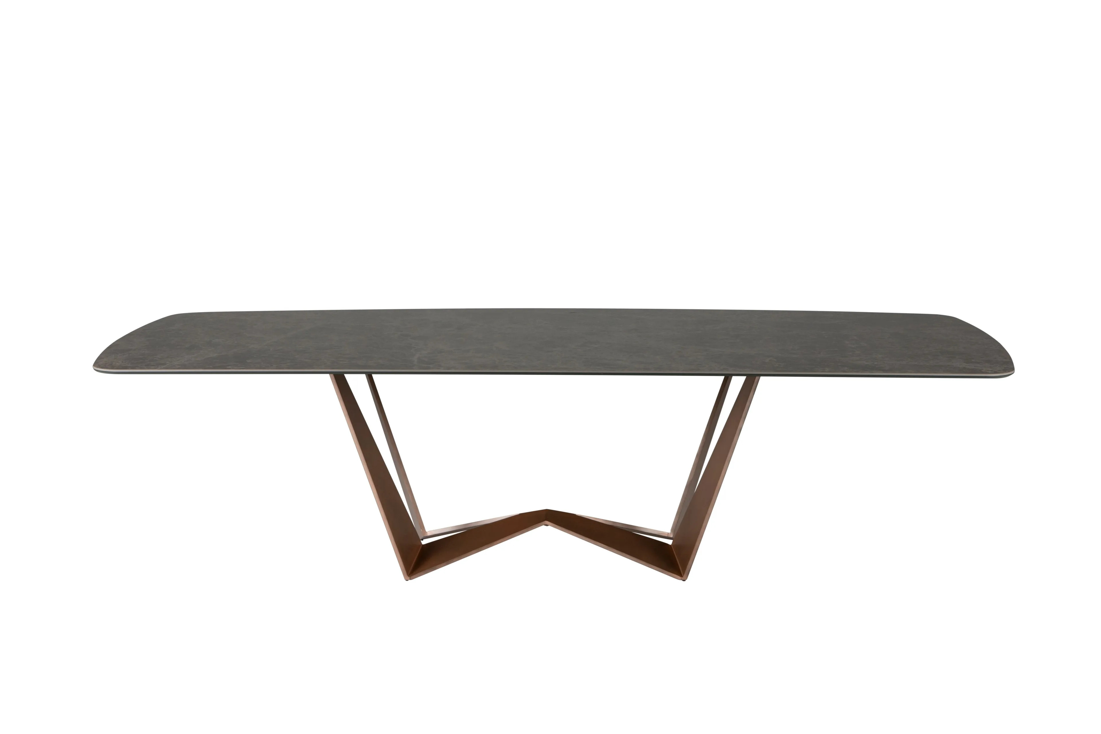 The REVERSE porcelain stoneware table offers a versatile solution for various settings, including restaurants, conference rooms, coworking spaces, cafés, event venues, and educational institutions. Its painted steel base is available in finishes such as Gold, Copper, Brushed Copper, Bronze, and Titanium, providing a modern design that complements any environment. The table features a choice of porcelain stoneware tops in finishes like Emperador, Symphonie, Onice Ambra, Macchiavecchia glossy, and Macchiavecchia matt. This combination of geometric base and elegant top creates a striking visual contrast. Ideal for dining tables and conference room furniture, the REVERSE table pairs seamlessly with café chairs, ergonomic chairs, and stackable chairs, ensuring durable seating for any occasion.