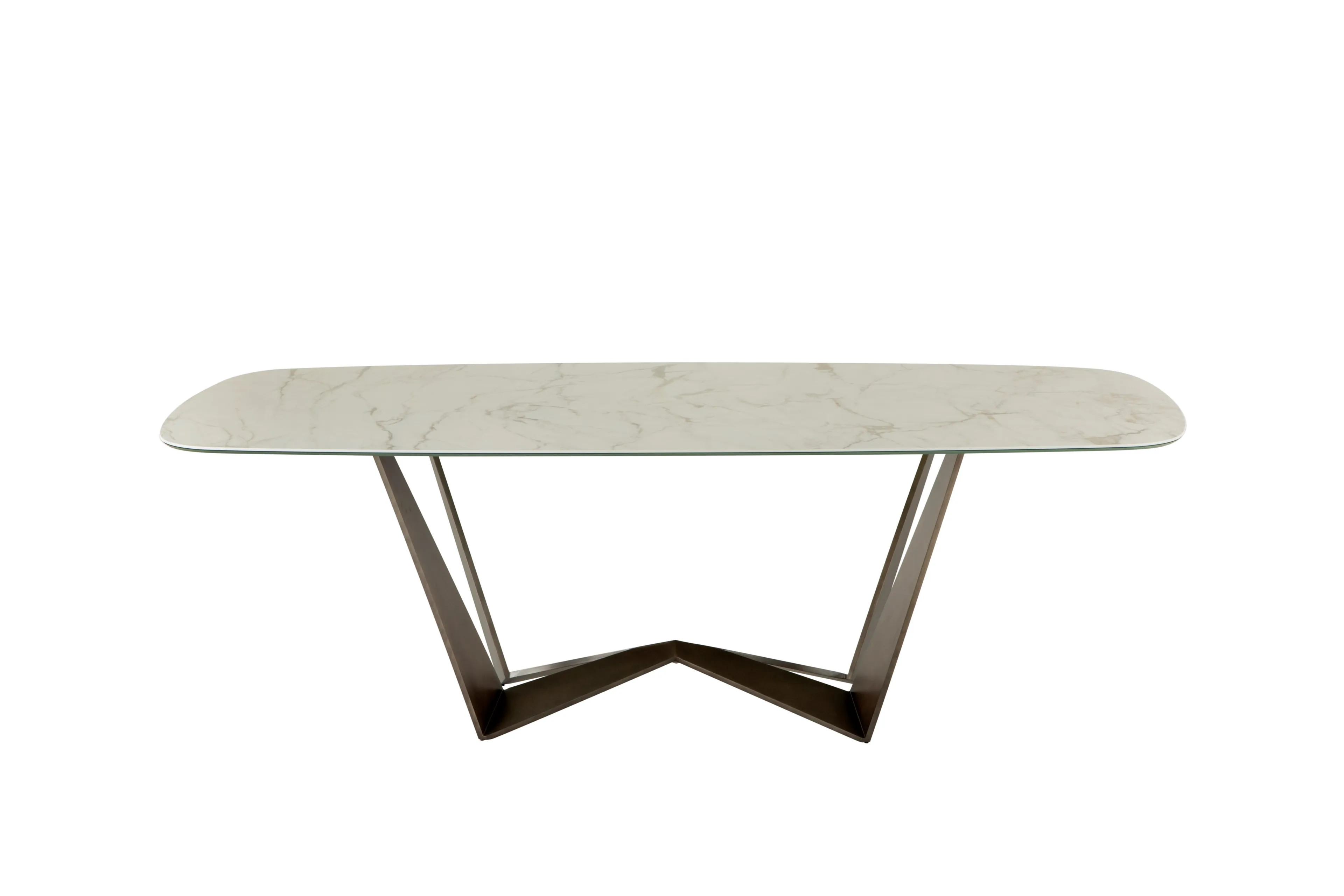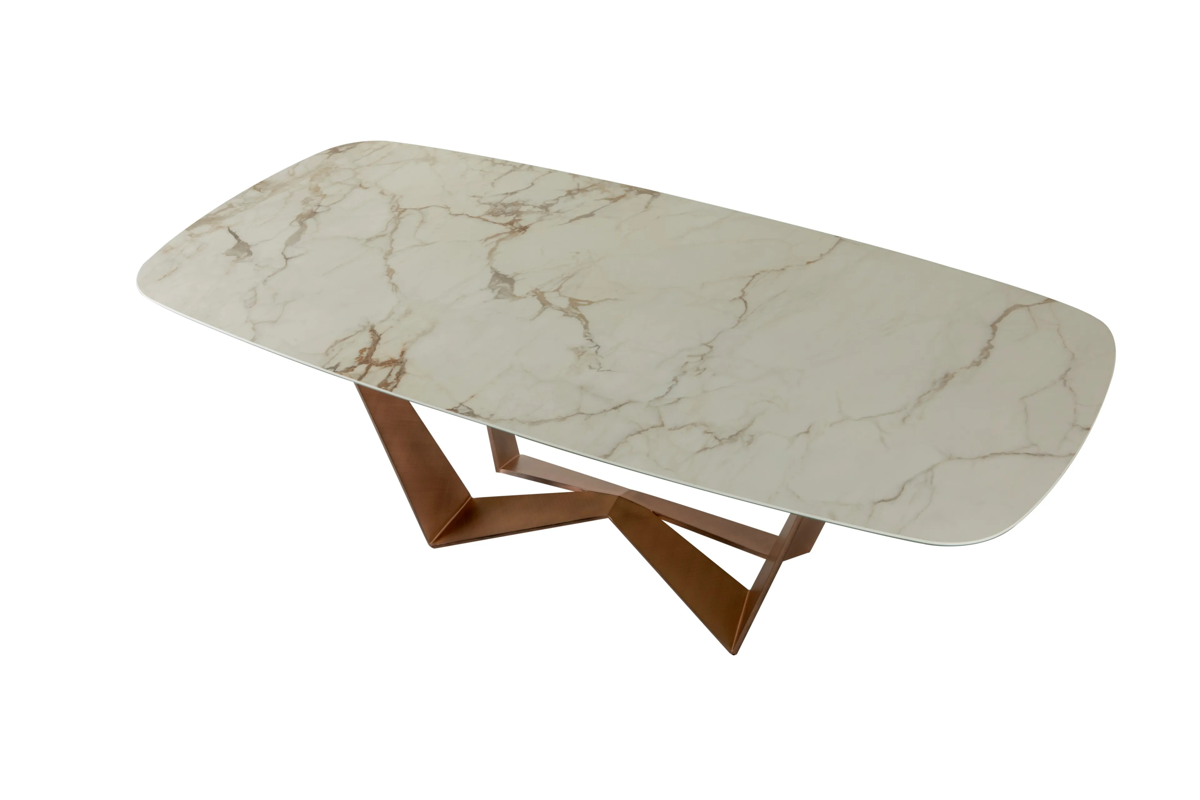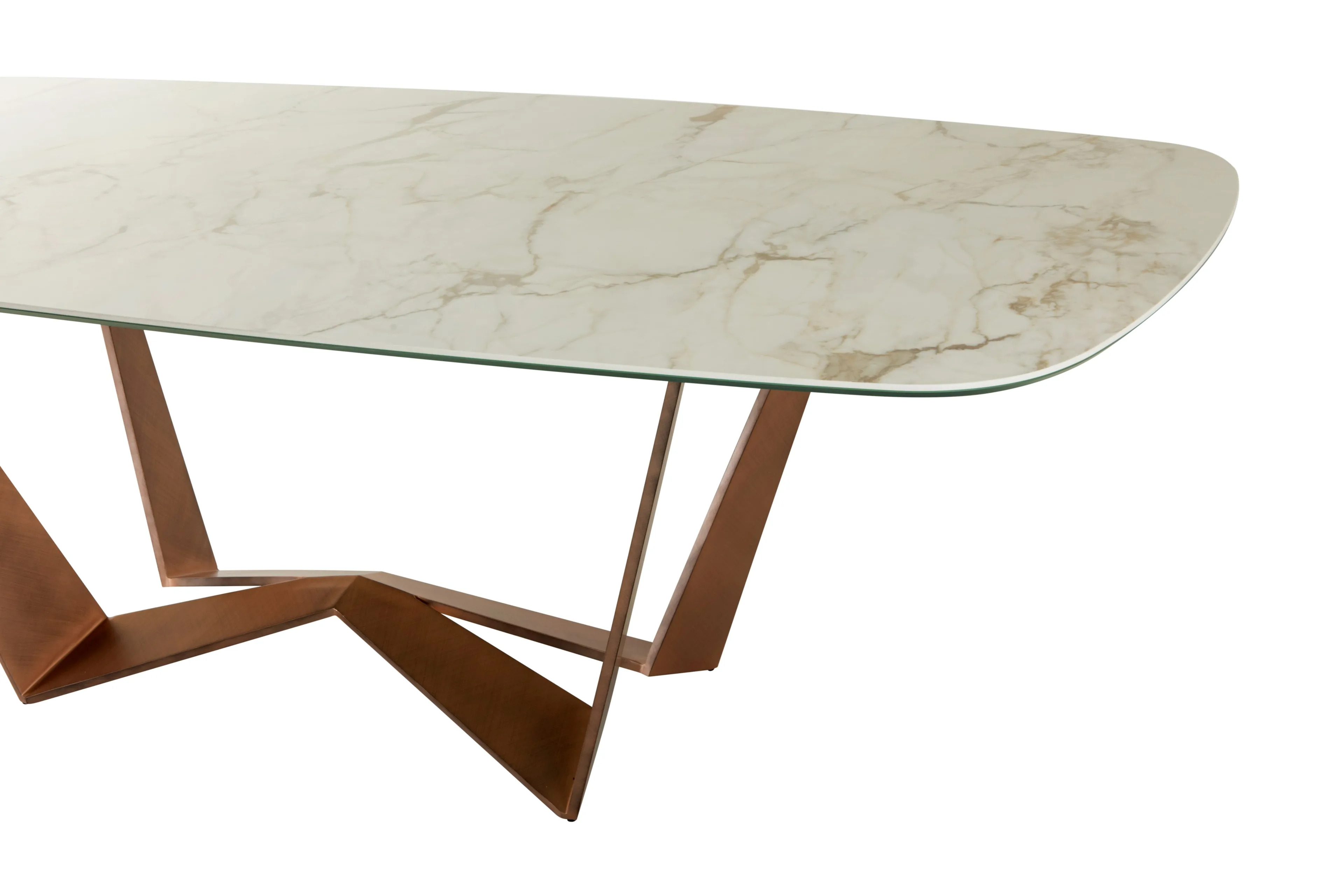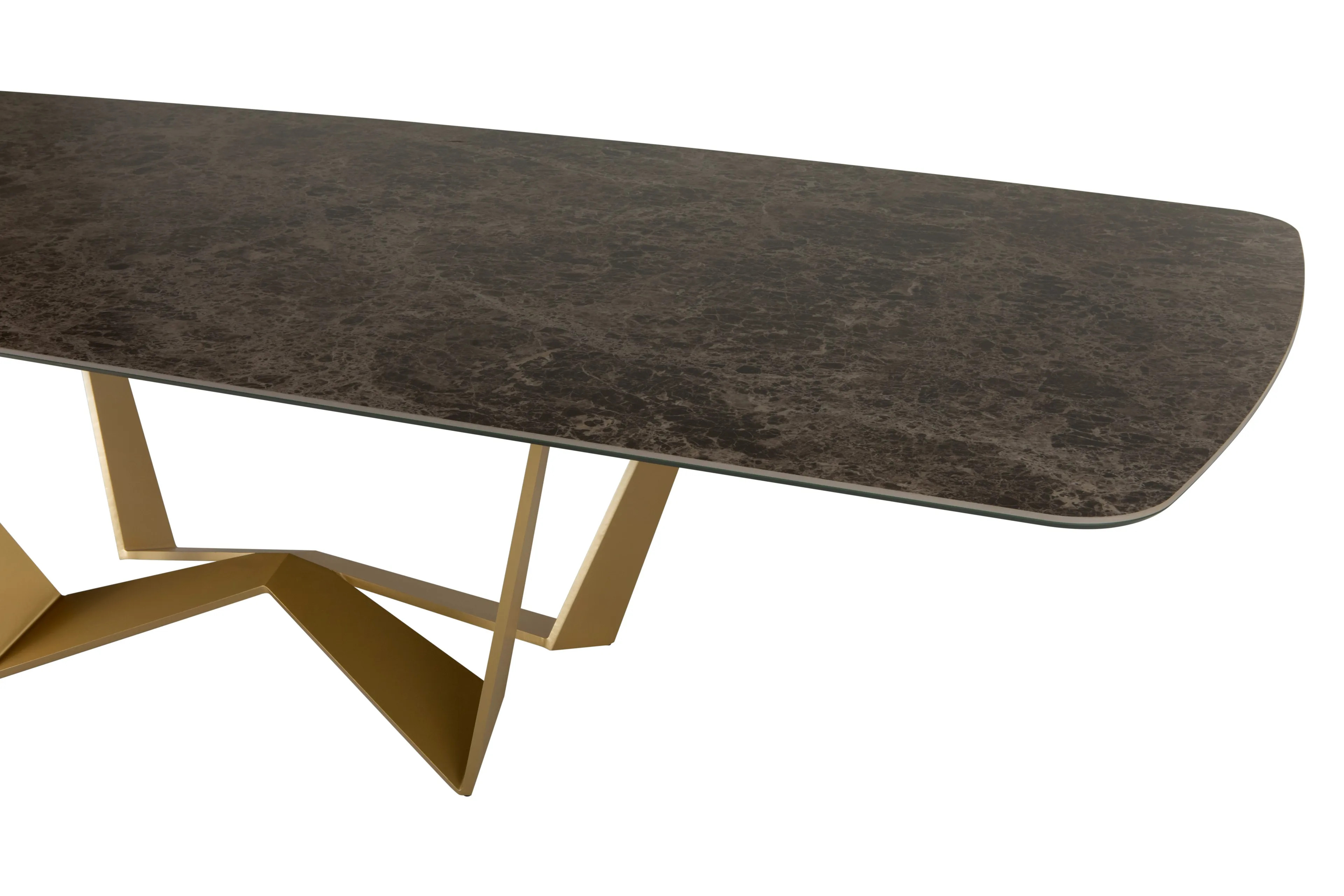 The REVERSE porcelain stoneware table offers a versatile solution for various settings, including restaurants, conference rooms, coworking spaces, cafés, event venues, and educational institutions. Its painted steel base is available in finishes such as Gold, Copper, Brushed Copper, Bronze, and Titanium, providing a modern design that complements any environment. The table features a choice of porcelain stoneware tops in finishes like Emperador, Symphonie, Onice Ambra, Macchiavecchia glossy, and Macchiavecchia matt. This combination of geometric base and elegant top creates a striking visual contrast. Ideal for dining tables and conference room furniture, the REVERSE table pairs seamlessly with café chairs, ergonomic chairs, and stackable chairs, ensuring durable seating for any occasion.