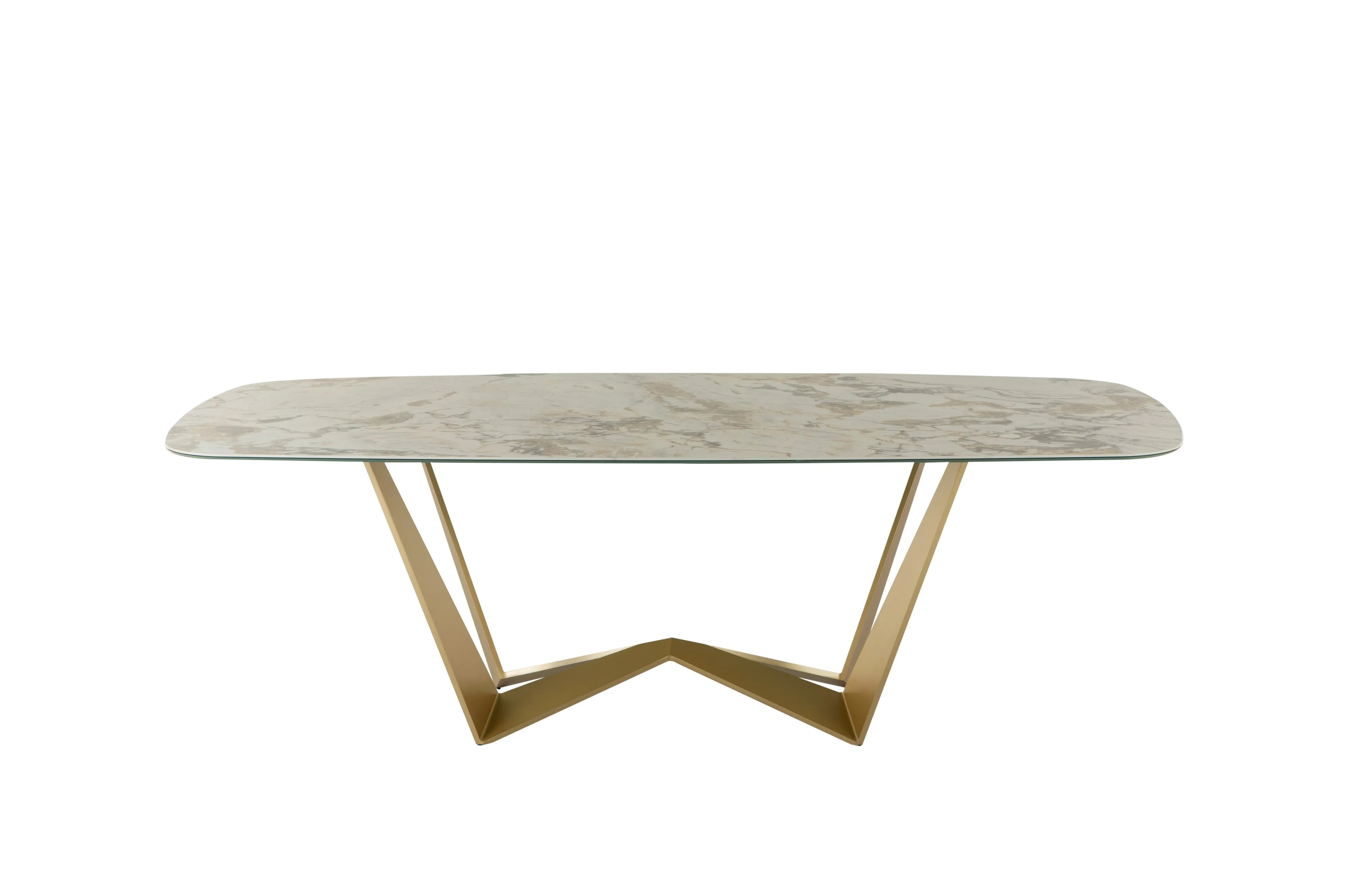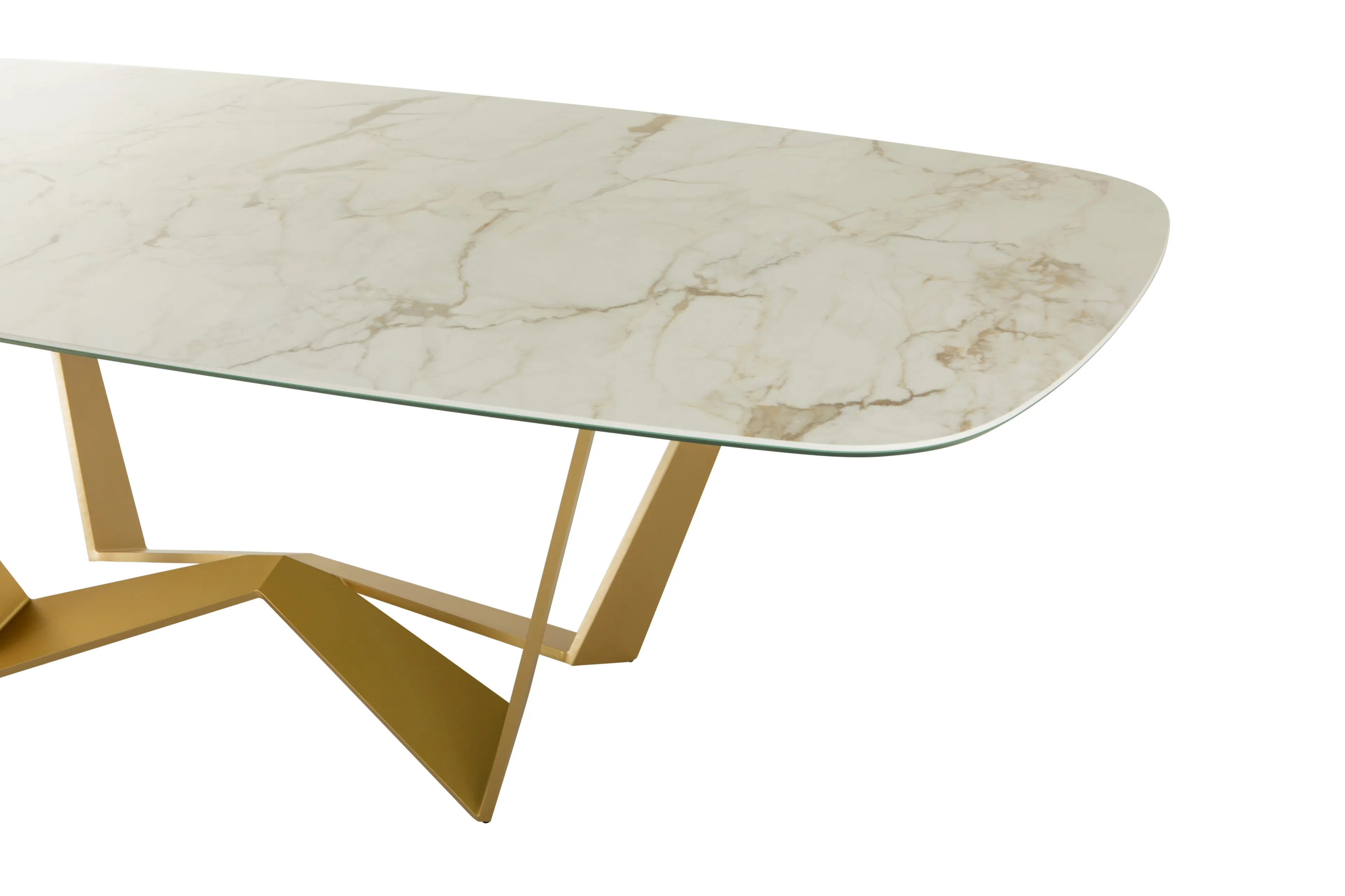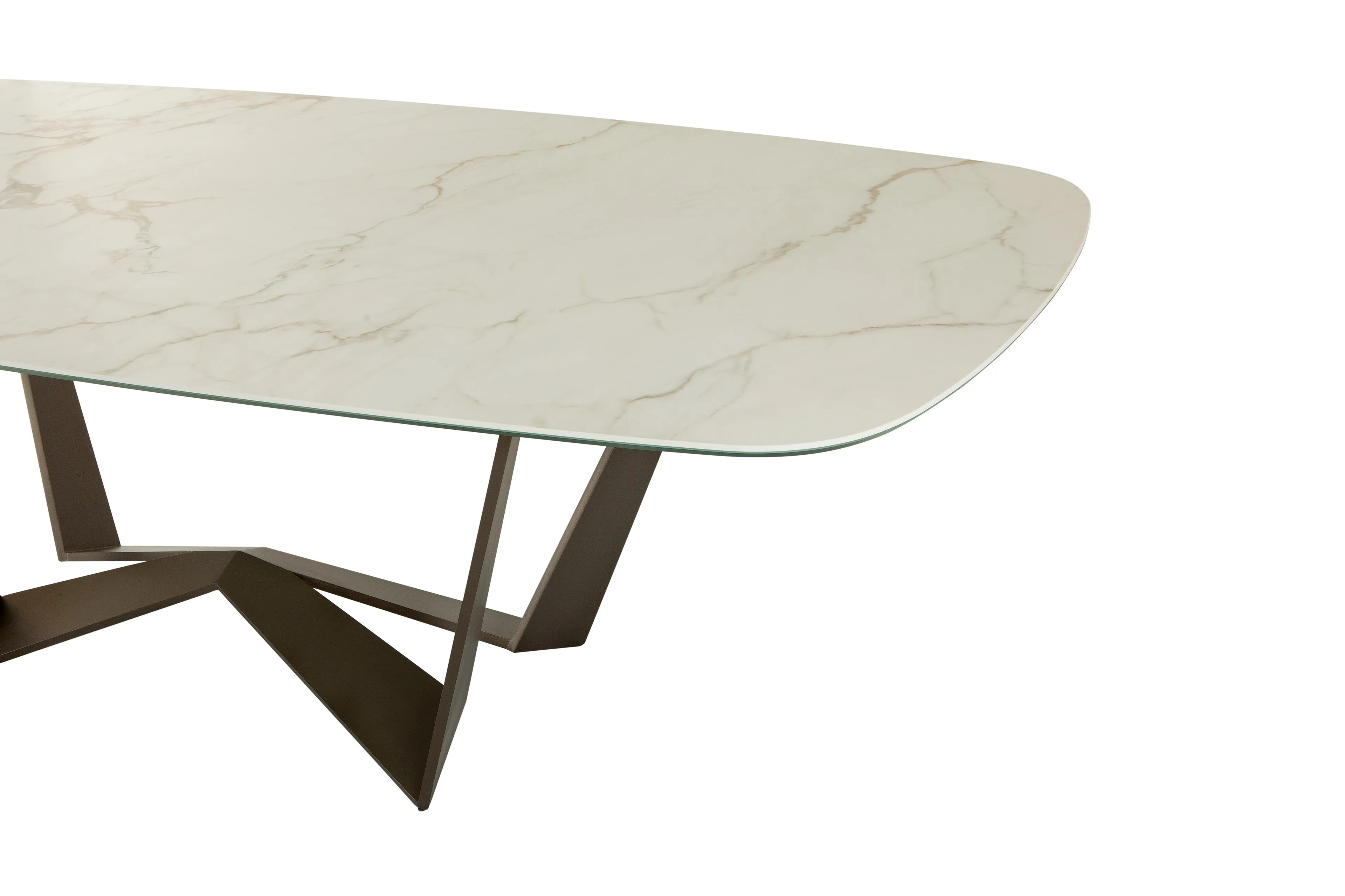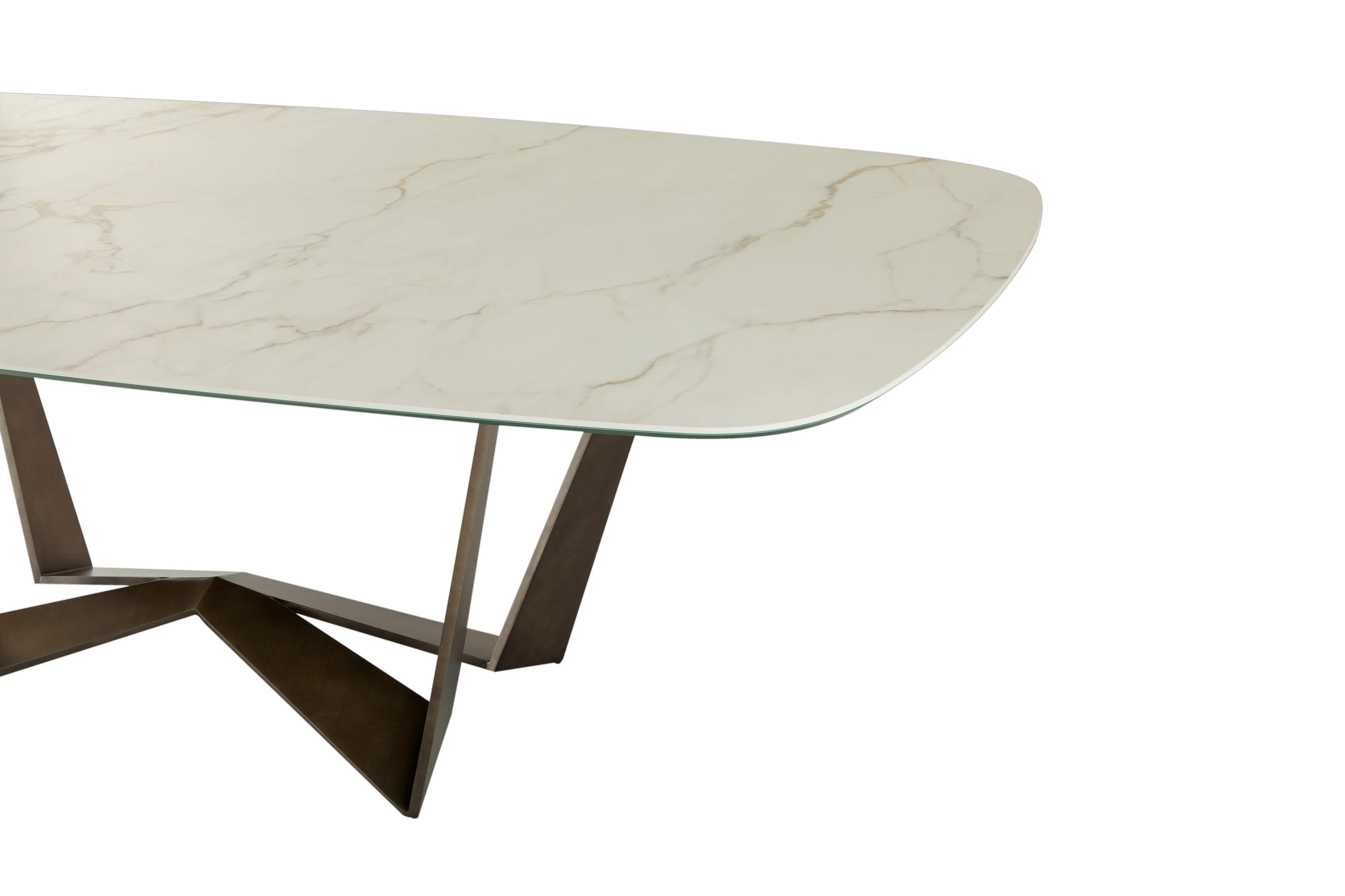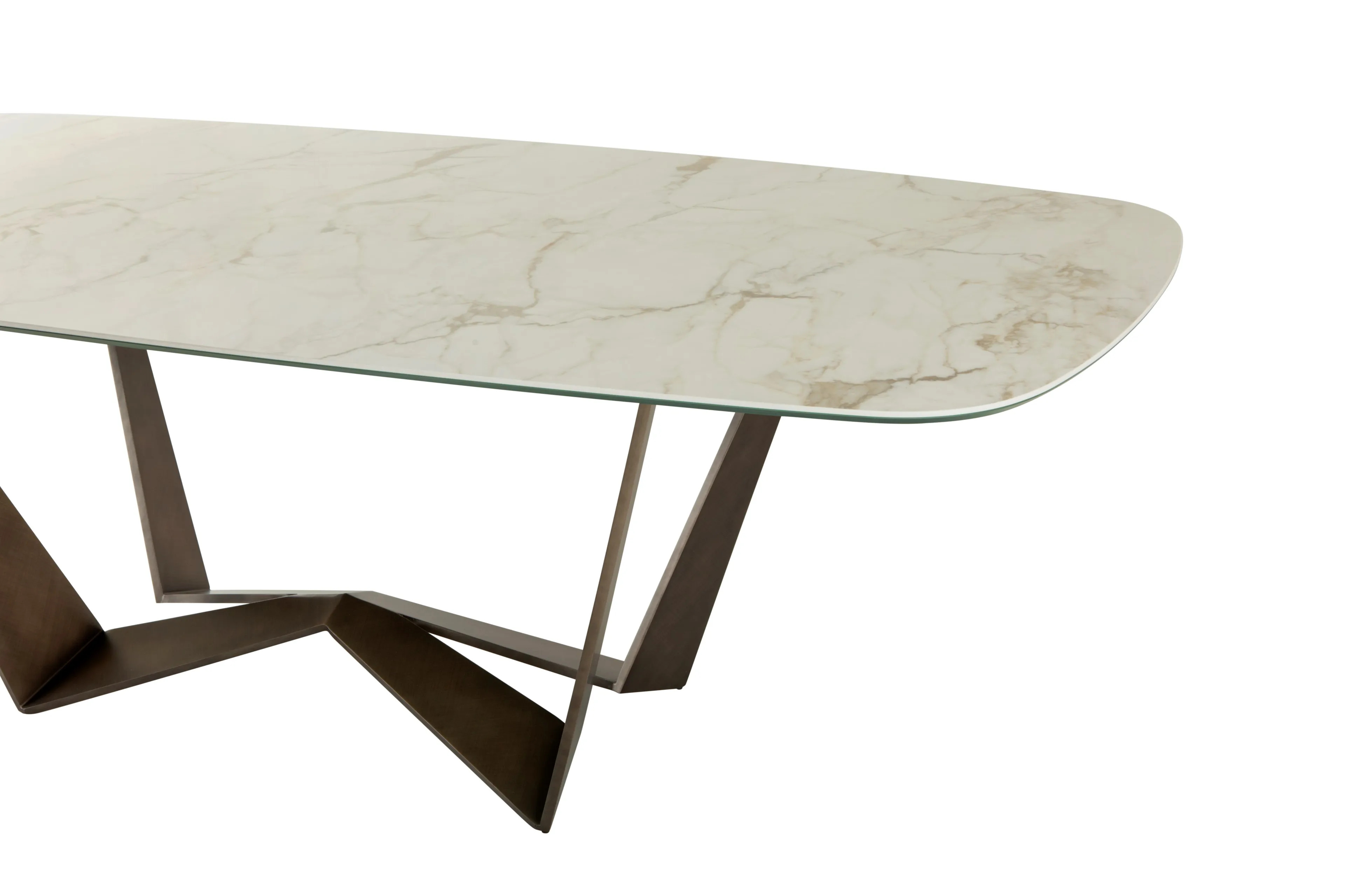 The REVERSE porcelain stoneware table offers a versatile solution for various settings, including restaurants, conference rooms, coworking spaces, cafés, event venues, and educational institutions. Its painted steel base is available in finishes such as Gold, Copper, Brushed Copper, Bronze, and Titanium, providing a modern design that complements any environment. The table features a choice of porcelain stoneware tops in finishes like Emperador, Symphonie, Onice Ambra, Macchiavecchia glossy, and Macchiavecchia matt. This combination of geometric base and elegant top creates a striking visual contrast. Ideal for dining tables and conference room furniture, the REVERSE table pairs seamlessly with café chairs, ergonomic chairs, and stackable chairs, ensuring durable seating for any occasion.