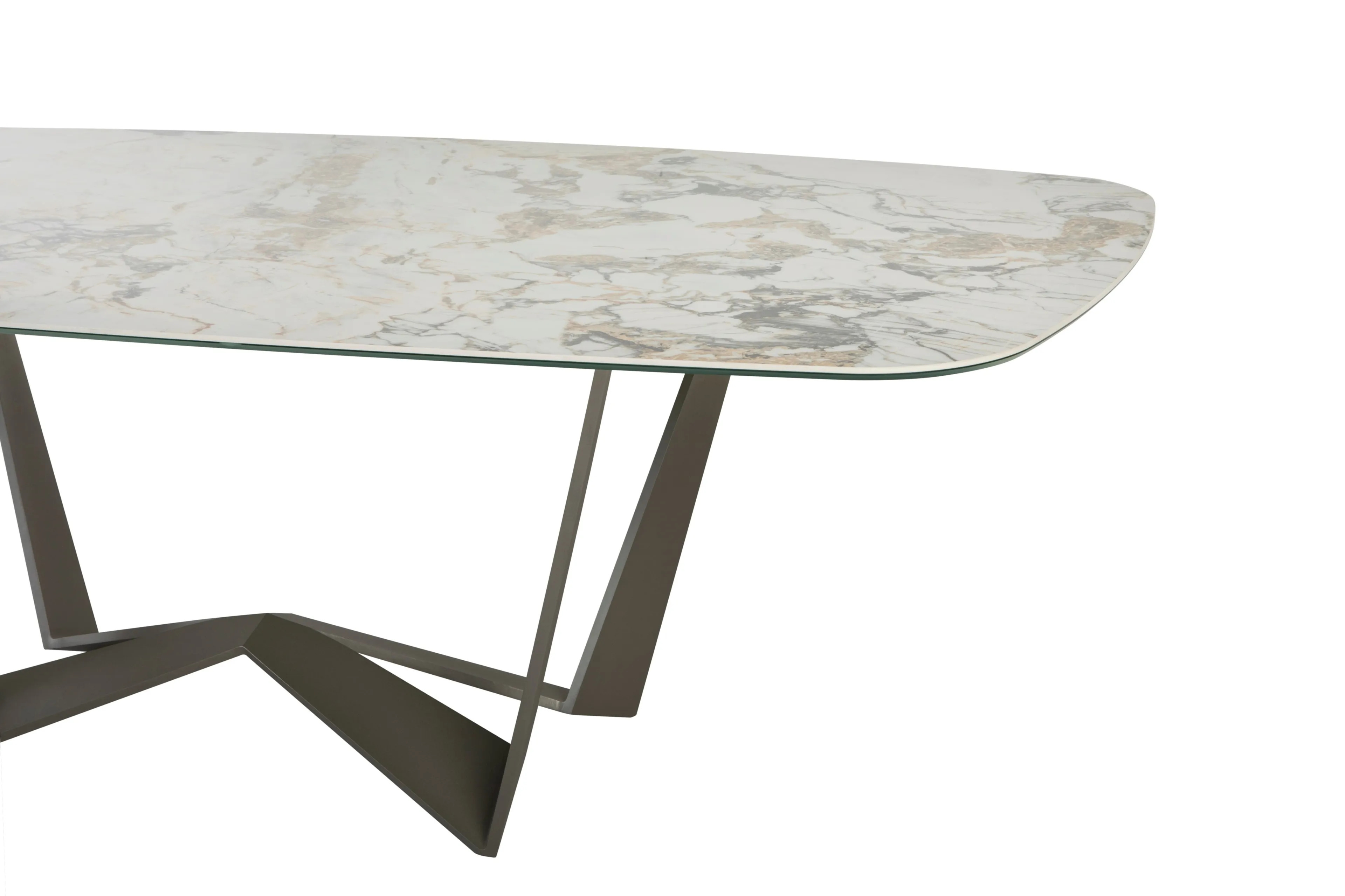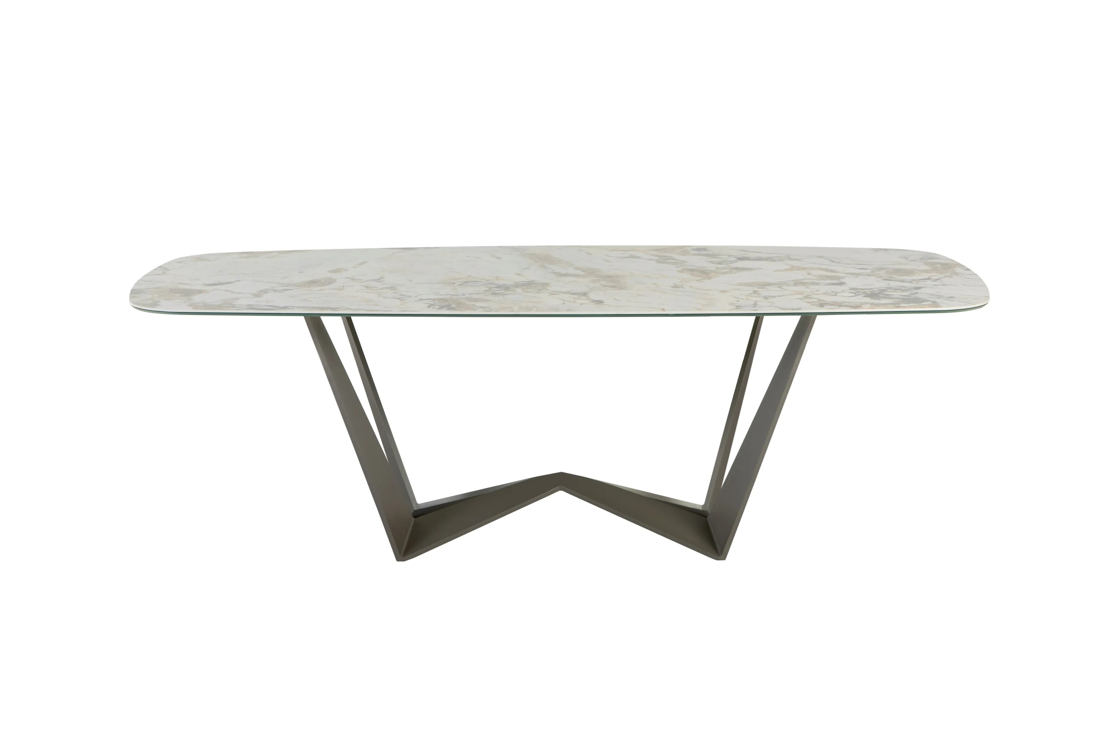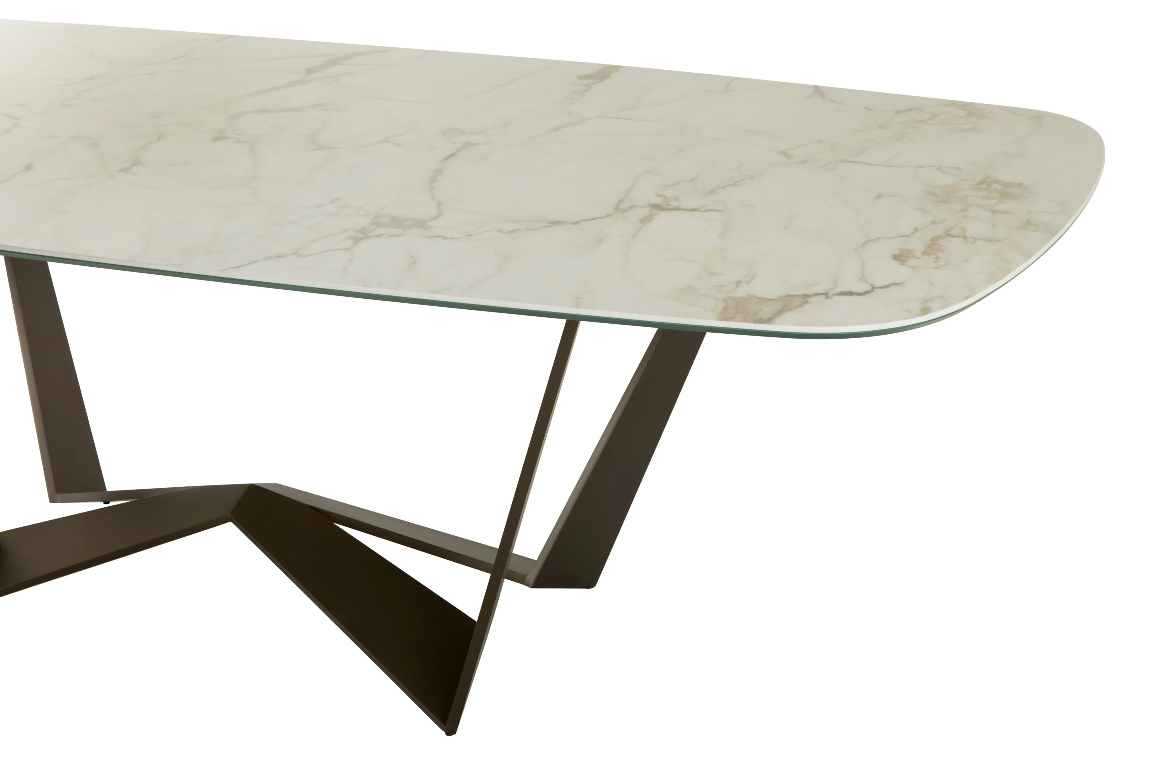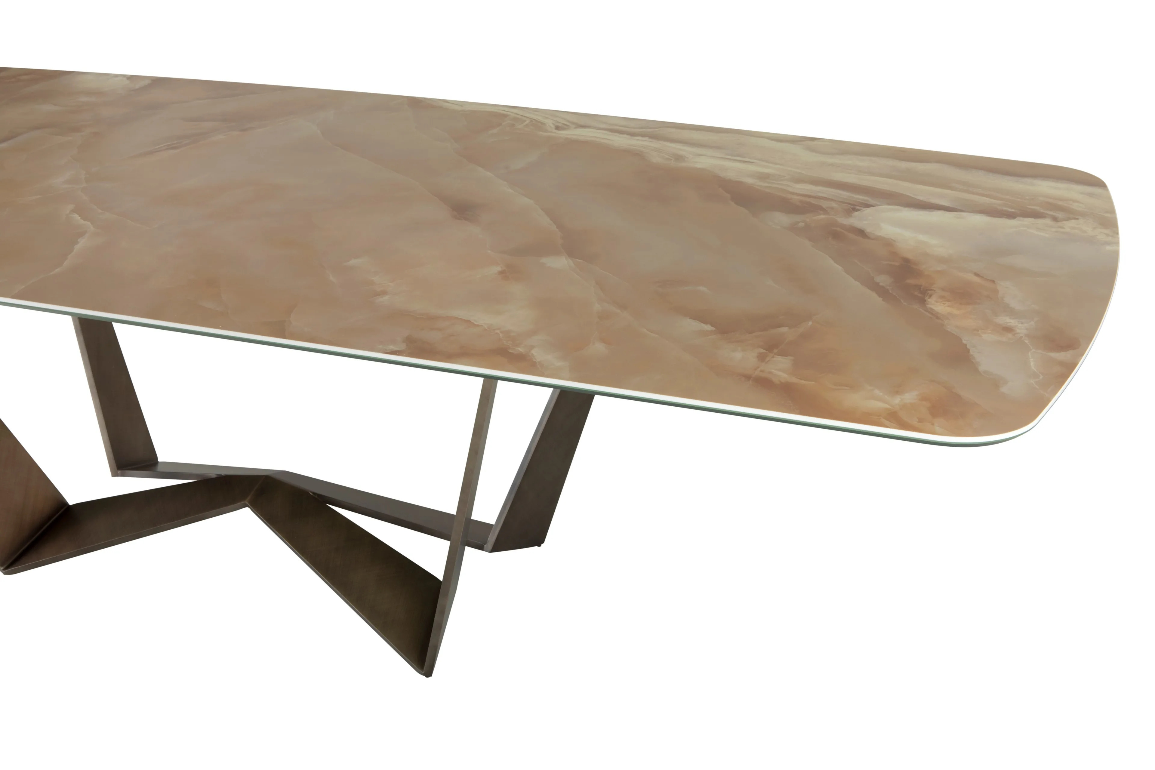 The REVERSE porcelain stoneware table offers a versatile solution for various settings, including restaurants, conference rooms, coworking spaces, cafés, event venues, and educational institutions. Its painted steel base is available in finishes such as Gold, Copper, Brushed Copper, Bronze, and Titanium, providing a modern design that complements any environment. The table features a choice of porcelain stoneware tops in finishes like Emperador, Symphonie, Onice Ambra, Macchiavecchia glossy, and Macchiavecchia matt. This combination of geometric base and elegant top creates a striking visual contrast. Ideal for dining tables and conference room furniture, the REVERSE table pairs seamlessly with café chairs, ergonomic chairs, and stackable chairs, ensuring durable seating for any occasion.