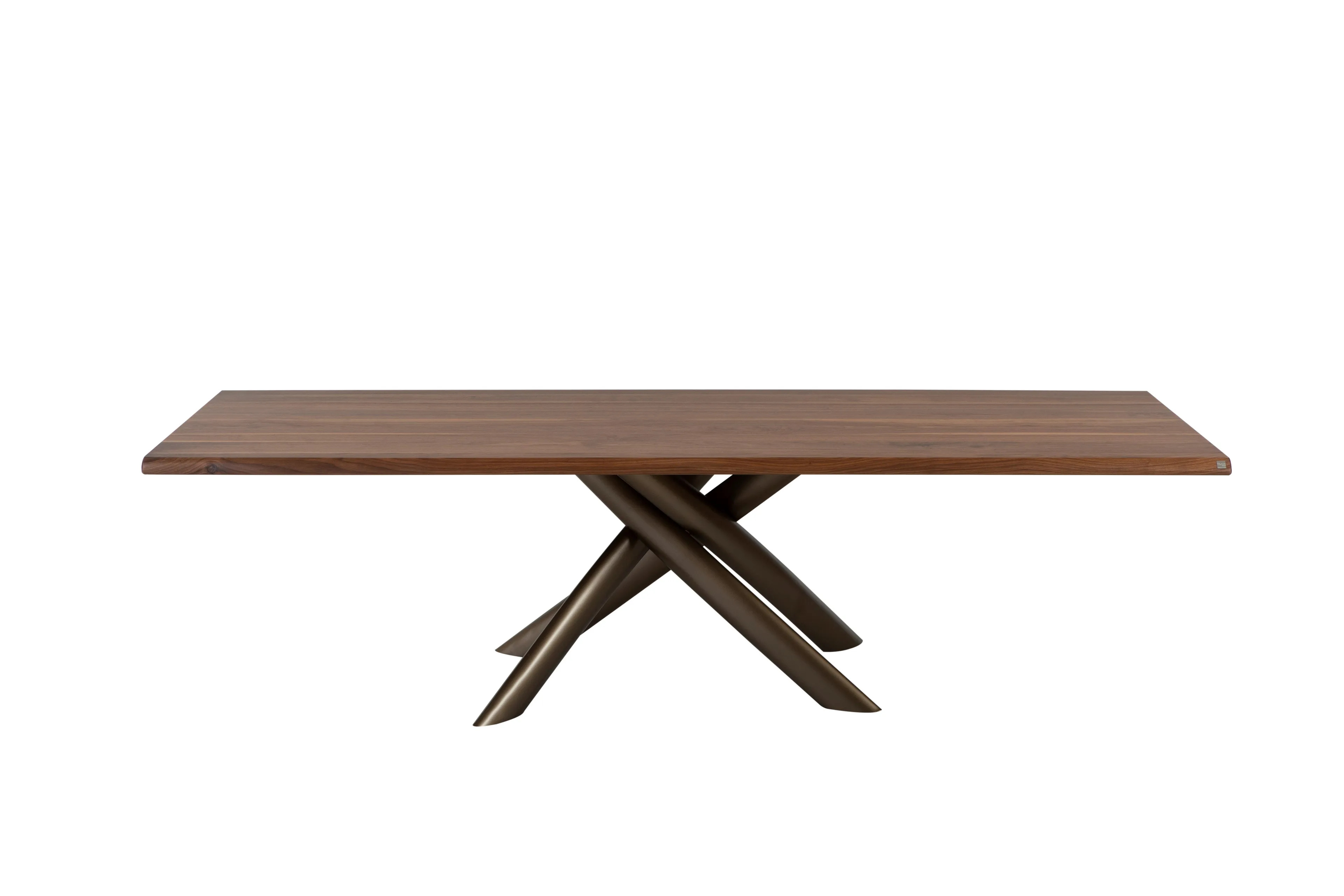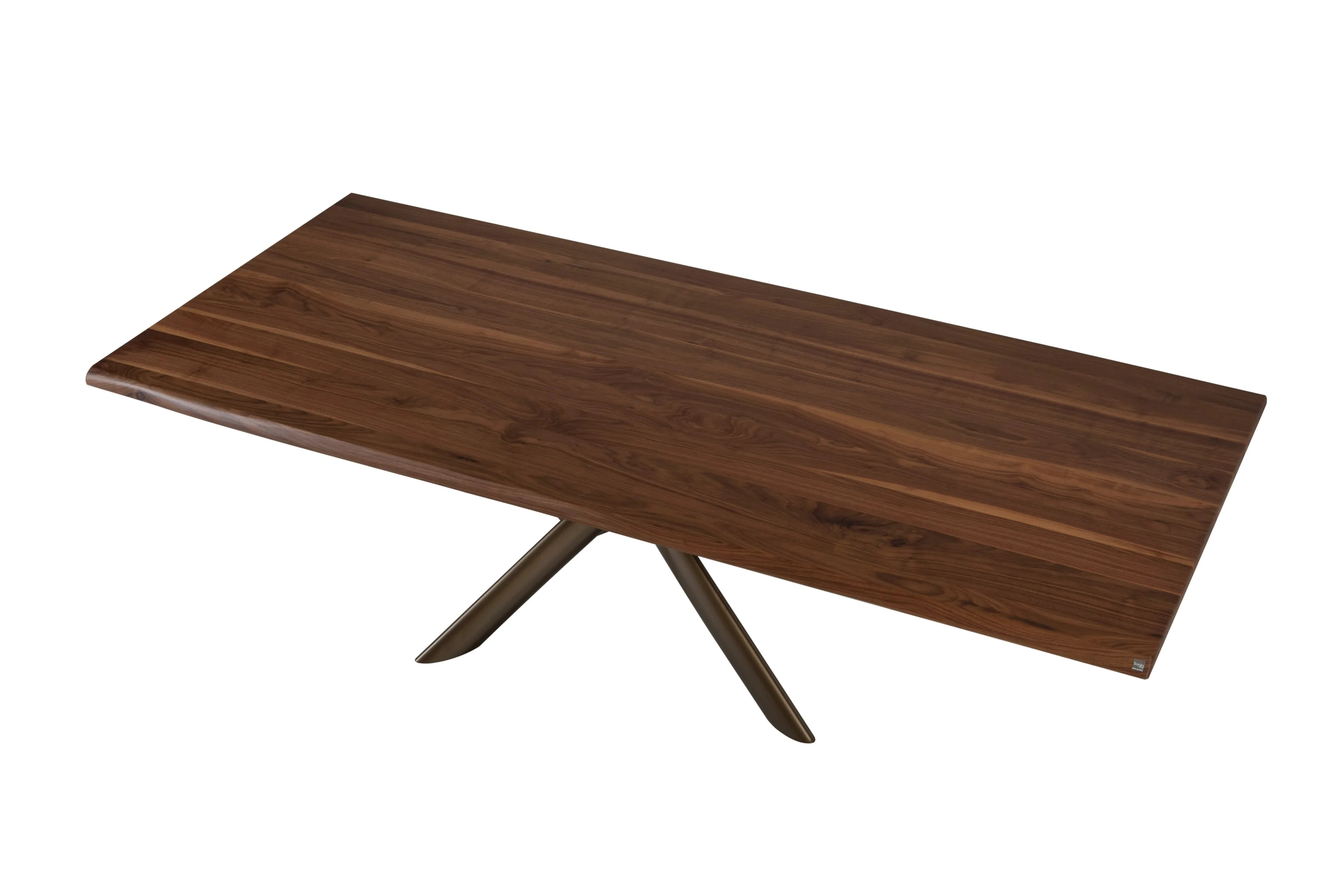 The STYLE wooden table is distinguished by its unique and sophisticated design, making it an ideal choice for restaurants, conference rooms, coworking spaces, cafés, event venues, and educational institutions. Its intricate base seamlessly integrates with the elegantly crafted wooden tops, available in solid Canaletto walnut, dark oak, or black ash. The table tops come in various shapes, including straight, shaped, or irregular, offering versatility to suit different settings. The base is available in finishes such as matt white, carbon grey, matt stone bronze, and matt gold, complementing modern design tables. This piece pairs well with café chairs and ergonomic, stackable seating, providing durable and stylish conference room furniture.