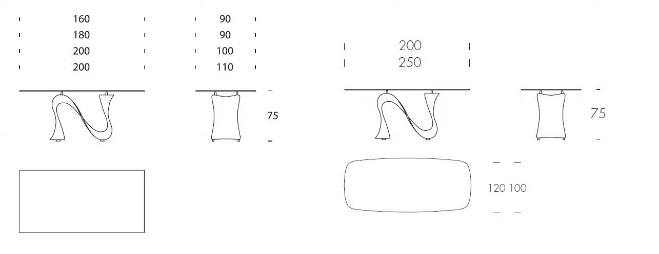 The WAVE porcelain stoneware table is designed for versatile environments such as restaurants, conference rooms, coworking spaces, cafés, event venues, and educational institutions. This modern design table features a fixed rectangular top available in porcelain stoneware or ceramic glass, offering a range of finishes including onyx grey, statuario altissimo, Portoro, and more. The ceramic glass options include black, dark brown, and white. The base, crafted from Baydur®, is available in glossy finishes like white, black, beige, champagne, and corten. This material choice allows the base to mimic the dynamic movement of a wave, while the top provides a contrasting static appearance. Ideal for dining tables and conference room furniture, this piece complements durable seating and ergonomic, stackable café chairs, enhancing any professional setting with its innovative design.