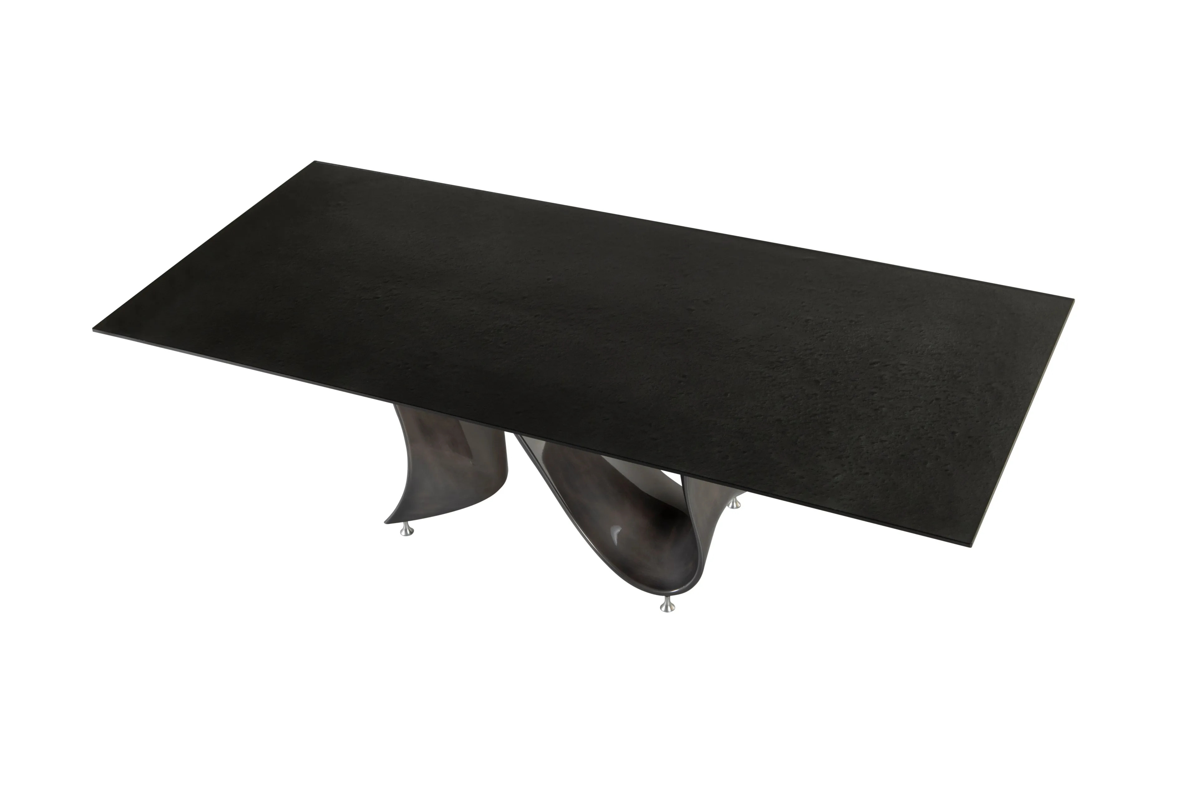 The WAVE stained glass table features a fixed rectangular design, ideal for dining tables in restaurants, conference rooms, and coworking spaces. Its top is crafted from blue or black hammered glass, available in both rectangular and uniquely shaped versions. The glass options include clear, transparent bronze, transparent fumé, extra clear, extra clear white, extra clear beige, and hammered black. The base, made from Baydur®, is available in glossy finishes such as white, black, beige, champagne, and Corten (RAL coloring). This modern design table combines innovative materials to create a dynamic base that mimics the fluidity of a wave, contrasted by a static, balanced tabletop. Suitable for cafés, event spaces, and educational institutions, it complements ergonomic and stackable chairs, enhancing durable seating arrangements.
