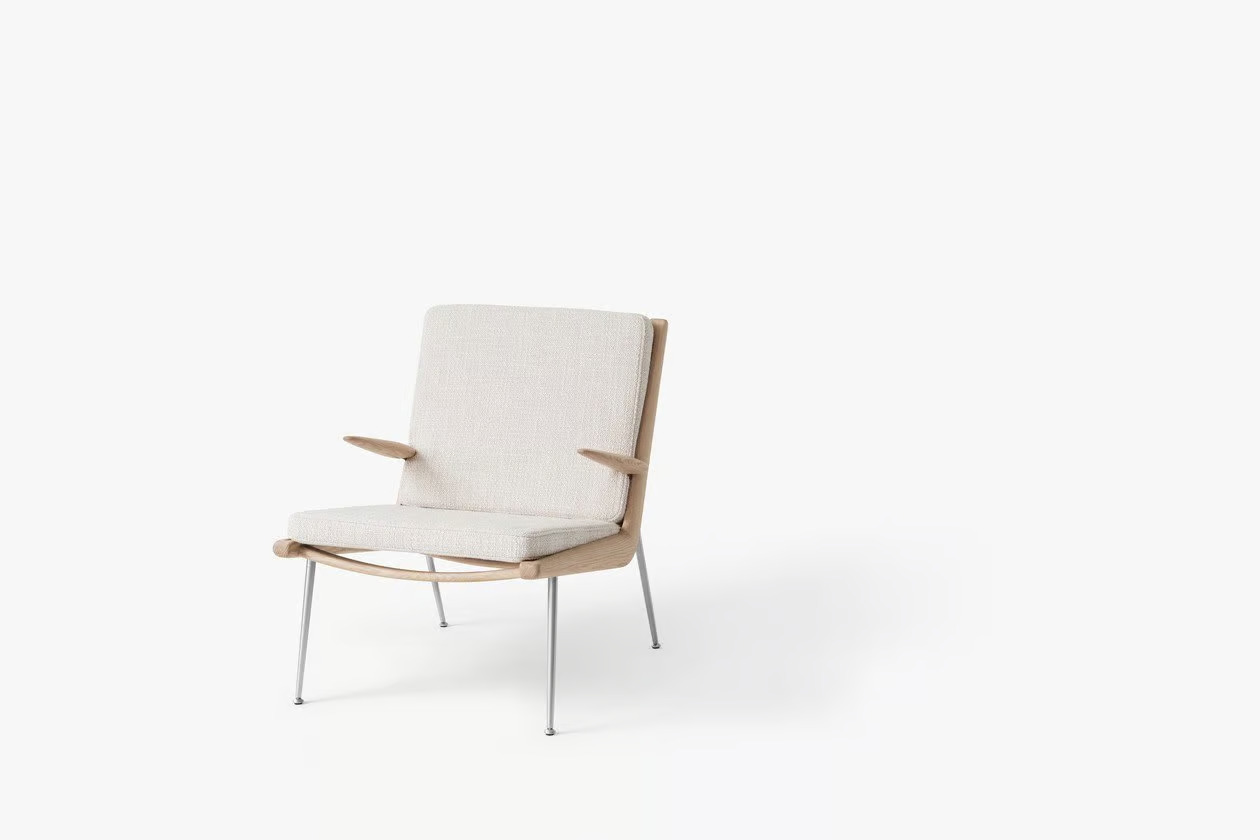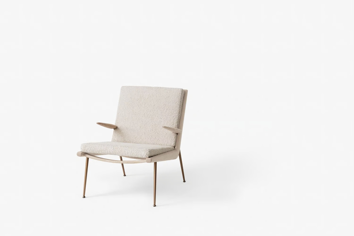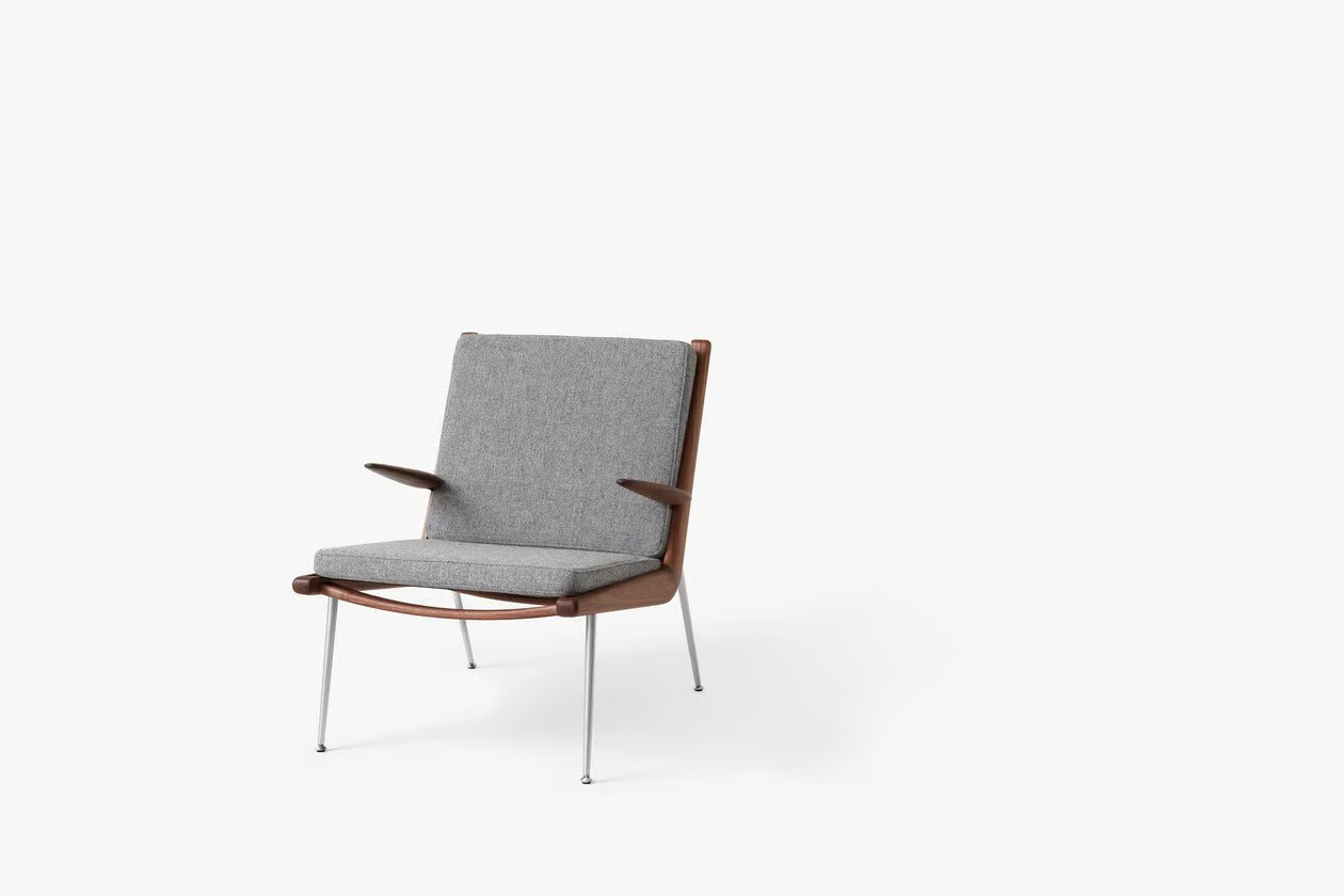 The BOOMERANG HM2, introduced in 1956 by Hvidt & Mølgaard, exemplifies timeless Danish design with its minimalist and elegant form. This piece features a hand-polished wooden frame complemented by slender legs crafted from either brass or stainless steel, offering a sophisticated touch to any setting. Constructed from milled solid wood, the frame is supported by plastic-covered coiled spring steel wires, ensuring durability and comfort. The modular design allows for customizable sofa configurations, making it ideal for hotels, cafés, lounges, and waiting rooms. Upholstered in a variety of fabrics, it provides comfortable seating solutions tailored to diverse interior aesthetics. Available wood finishes include oiled oak, oiled walnut, and soaped oak, while the legs are offered in brass or stainless steel. Manufactured in Denmark and Lithuania by Kvist Industries A/S and UAB BS Classic, this piece is a versatile choice for modern lounge furniture.