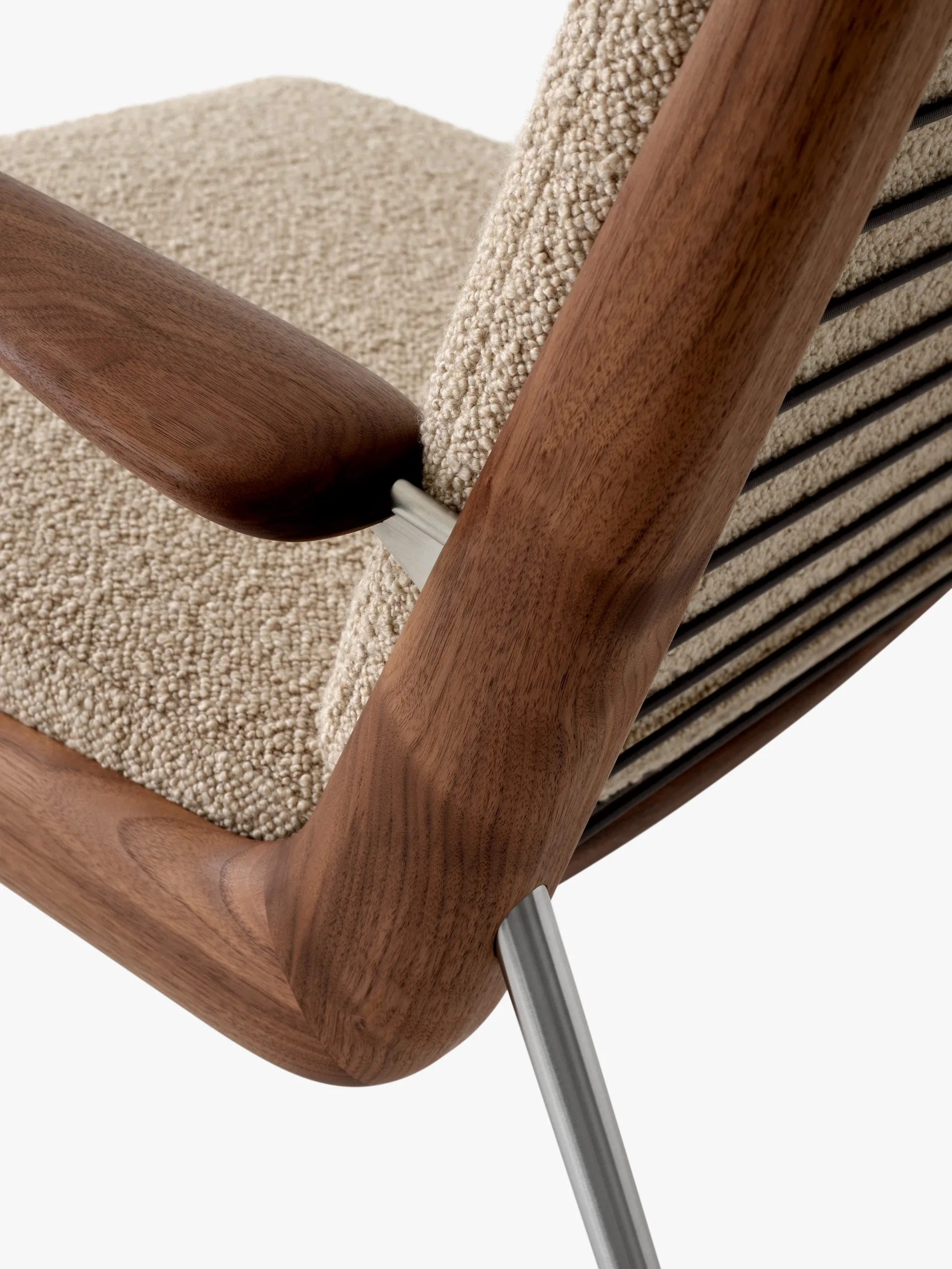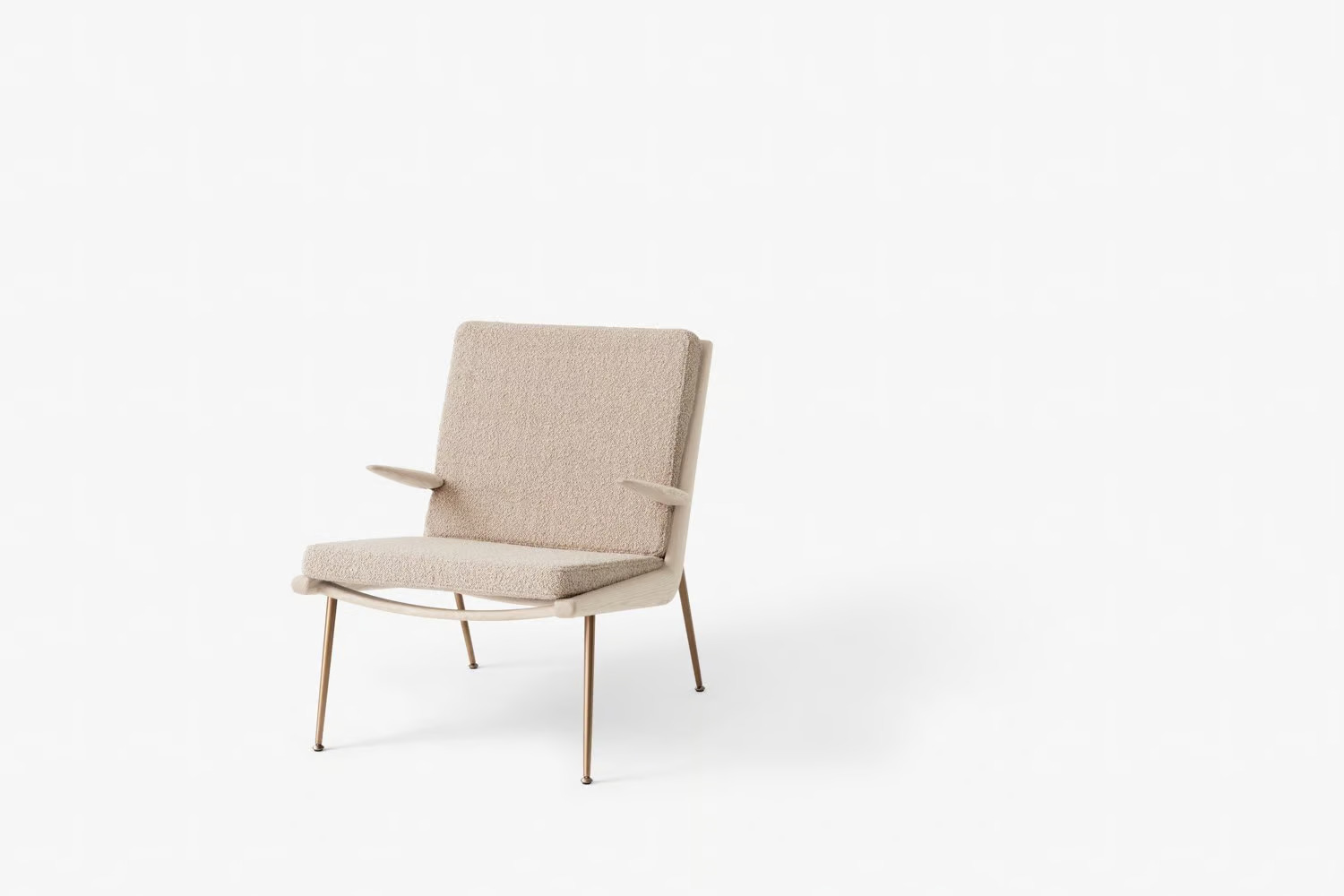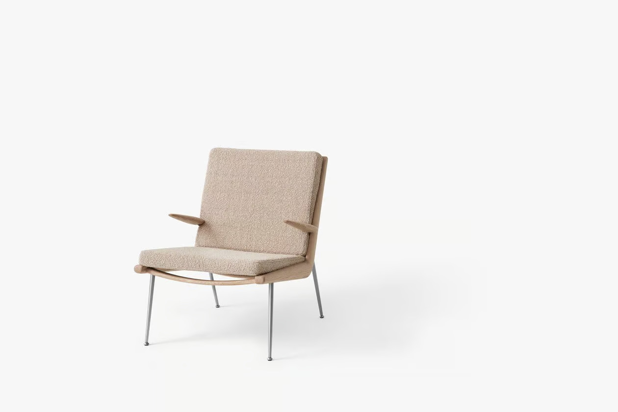 The BOOMERANG HM2, introduced in 1956 by Hvidt & Mølgaard, exemplifies timeless Danish design with its minimalist and elegant form. This piece features a hand-polished wooden frame complemented by slender legs crafted from either brass or stainless steel, offering a sophisticated touch to any setting. Constructed from milled solid wood, the frame is supported by plastic-covered coiled spring steel wires, ensuring durability and comfort. The modular design allows for customizable sofa configurations, making it ideal for hotels, cafés, lounges, and waiting rooms. Upholstered in a variety of fabrics, it provides comfortable seating solutions tailored to diverse interior aesthetics. Available wood finishes include oiled oak, oiled walnut, and soaped oak, while the legs are offered in brass or stainless steel. Manufactured in Denmark and Lithuania by Kvist Industries A/S and UAB BS Classic, this piece is a versatile choice for modern lounge furniture.