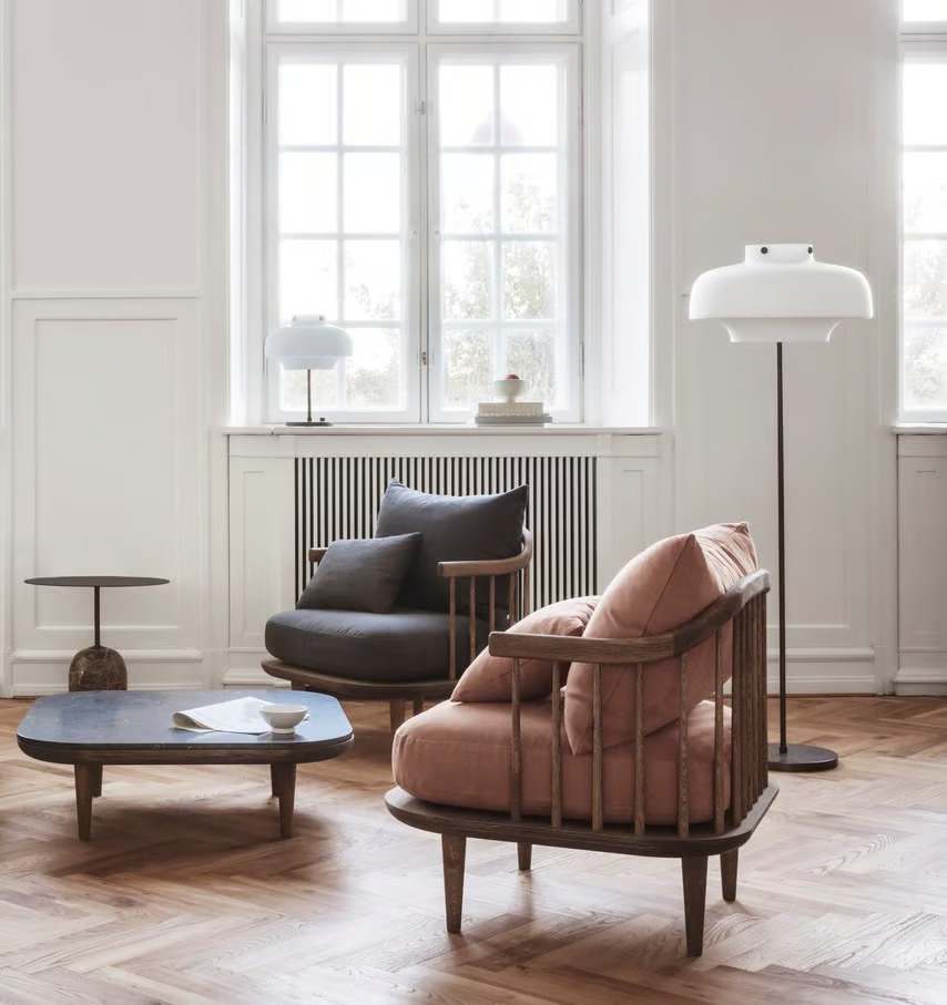 The FLY SC10 armchair, designed by Space Copenhagen, combines a sculptural aesthetic with exceptional comfort, making it ideal for hotels, cafés, lounges, and waiting rooms. Its design draws inspiration from classic Nordic elements, featuring a slatted wood backrest and organic shapes crafted with solid craftsmanship. Unlike traditional Scandinavian seating, this piece offers flexibility in posture, allowing users to sit, lie, or rest comfortably. The armchair is constructed with an oiled oak frame and base, using traditional woodworking techniques, and is available in smoked or white oiled finishes. The cushions, made from HR foam and feathers, are upholstered in a variety of fabrics, offering customizable seating solutions. Tested for strength and durability, the FLY SC10 is a reliable choice for modern lounge furniture, providing both luxury and ergonomic design.