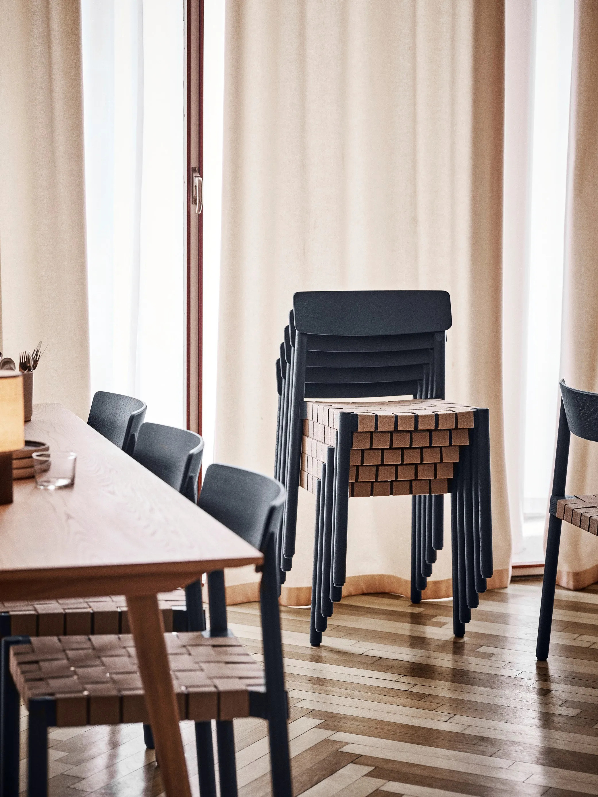The IN BETWEEN SK5 combines Scandinavian design heritage with expert craftsmanship, reflecting Sami Kallio’s mastery of traditional woodworking techniques and attention to detail. This modern design table features a tabletop crafted from oak veneer, complemented by solid wood legs, ensuring both durability and aesthetic appeal. The legs are securely attached using wood blocks, enhancing stability. Available in clear lacquered oak, smoked lacquered oak, and black lacquered oak, this piece is versatile for various settings. Ideal for dining tables in restaurants, conference room furniture, or café chairs, it offers ergonomic and durable seating solutions. The stackable chairs are designed for easy storage, making them suitable for coworking spaces, event venues, and educational institutions. Certified for strength, durability, and safety according to EN 15373 Level 2, it meets the demands of general contract use.