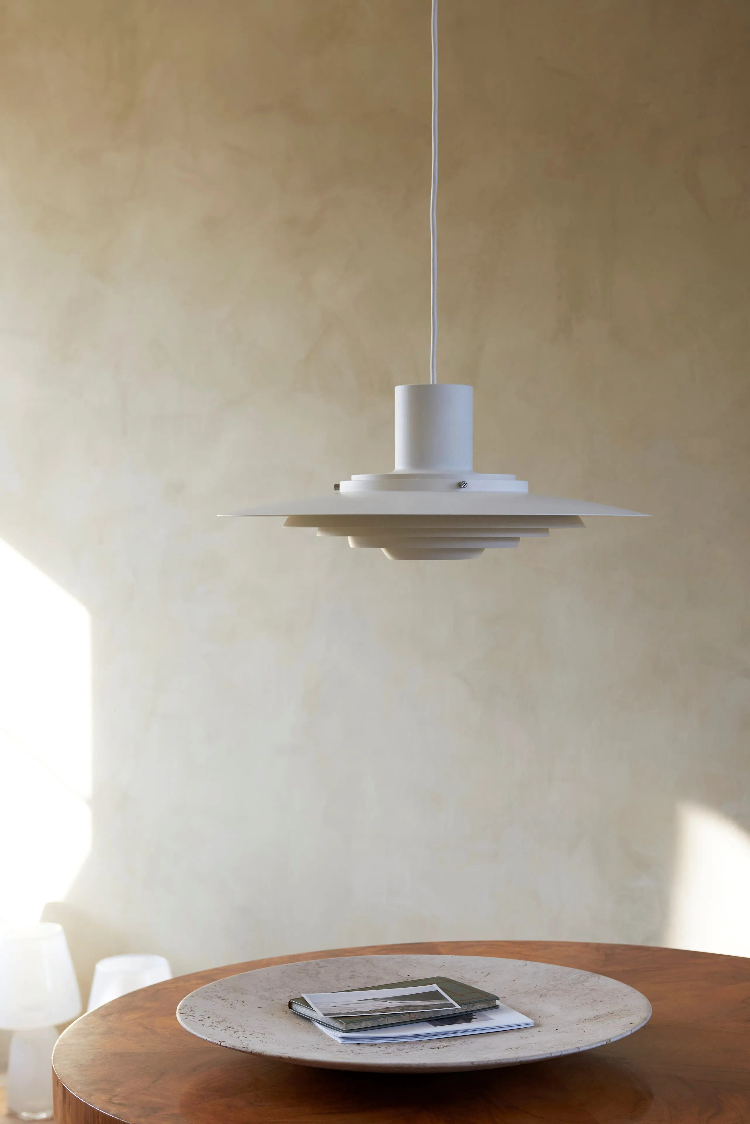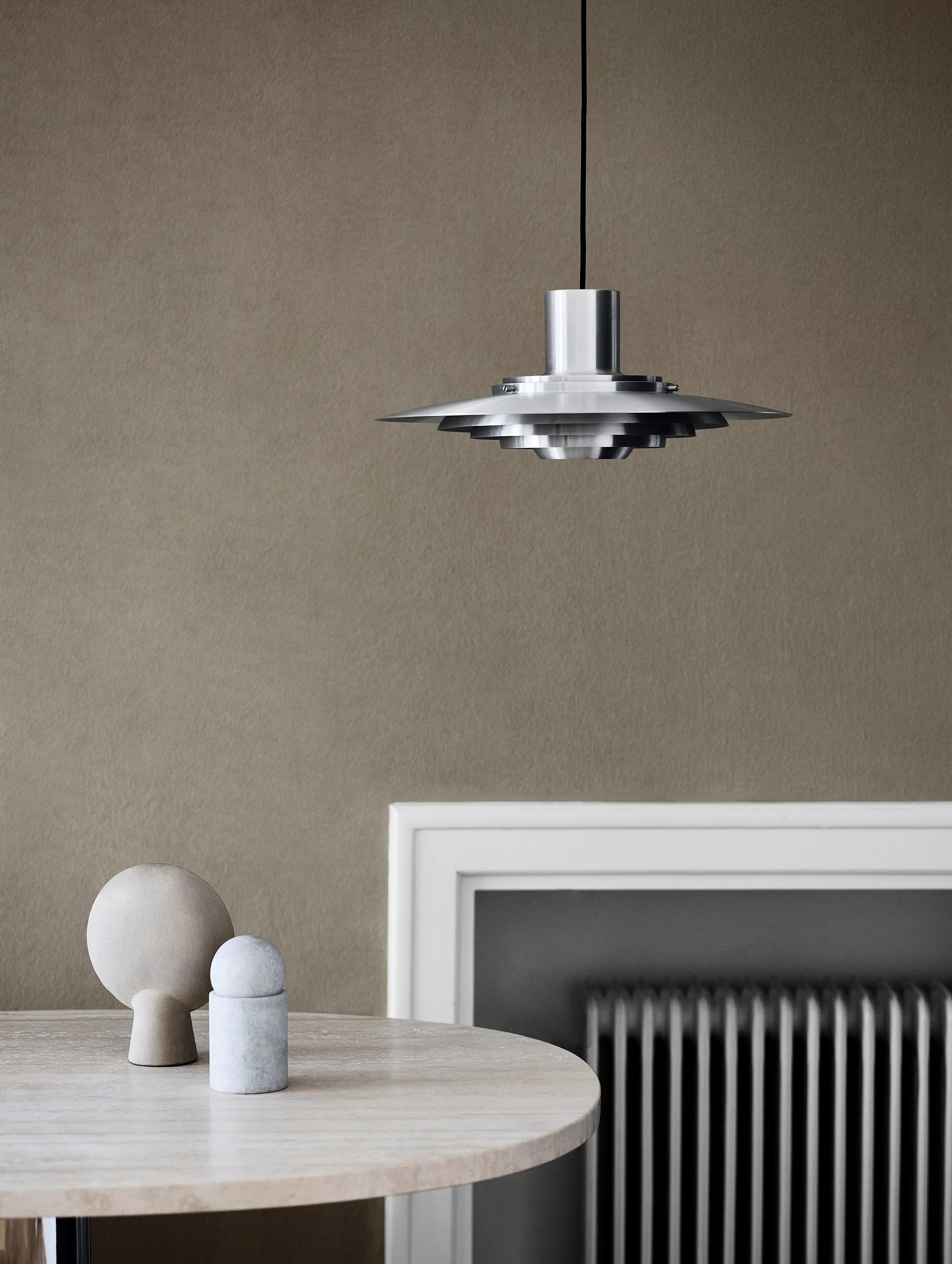 The P376 KF1 pendant lamp, designed by Jørgen Kastholm and Preben Juhl Fabricius, exemplifies modern chandelier designs with a focus on function-driven form. Originally crafted in 1963, this piece features five concentric shades that create a series of curves, providing soft, ambient lighting. The shades, made from hand-spun aluminum, are discreetly arranged to enhance the lamp's cohesive and iconic design. Available in matte white and aluminum finishes, this decorative pendant light is suitable for various interior settings, including hotels, offices, retail spaces, and restaurants. Compatible with E27 bulbs up to 100W, it supports energy-efficient lighting designs, accommodating bulbs from energy classes A++ to E. The lamp operates on 220-240V and includes a 400cm fabric cord. Certified with CE, IP20, and Class II, it is designed for indoor use.