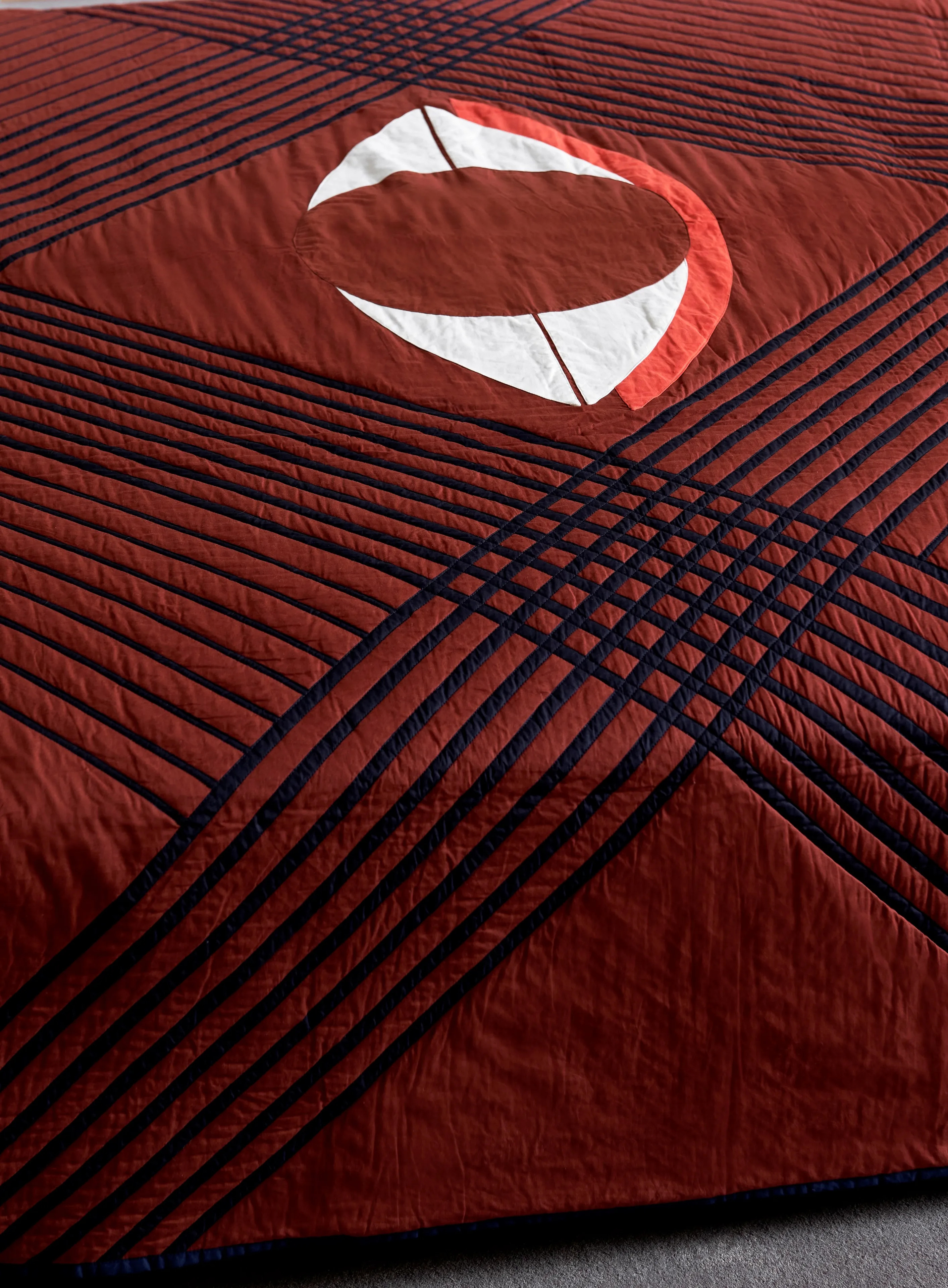 THE EYE AP9 offers a unique addition to hotel beds and children's room furniture with its striking design. Featuring a central illustration of a singular eye within a geometric pattern, this bedspread is crafted from 100% organic cotton, ensuring a soft and comfortable experience. Hand-quilted with an extra layer of organic cotton wadding, it provides a plush feel, ideal for comfortable mattresses in space-saving bedroom designs. Available in two elegant colors, Brown Earth and Blue Midnight, it complements modern bed frames and nightstands. Suitable for multifunctional bedroom sets and creative bedroom storage solutions, this bedspread is a versatile choice for family-friendly accommodations. For maintenance, it requires dry cleaning only.