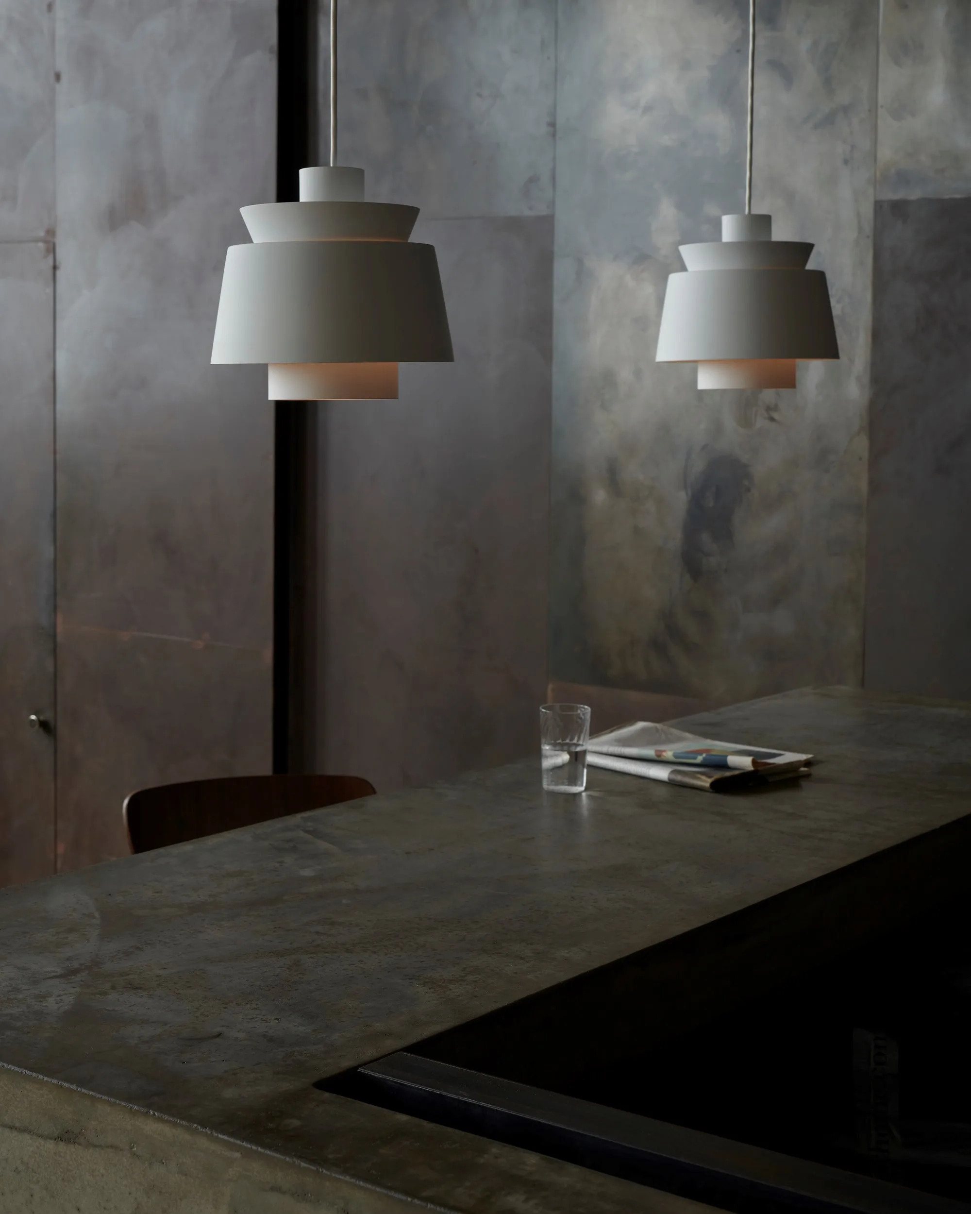 The UTZON JU1 pendant light, inspired by the industrial silhouette of ships, reflects the innovative spirit of Pritzker Prize-winning architect Jørn Utzon. This modern chandelier design is available in three distinct versions: brass, white, and the original split color model, crafted from lacquered brass and steel. Ideal for hotels, offices, retail spaces, restaurants, and residential interiors, this decorative pendant light combines aesthetic appeal with functionality. The metal shades are meticulously crafted using deep drawing and spinning techniques, ensuring durability and style. Designed for indoor use, it features a 4-meter fabric cord and operates at 220-240V with a maximum 60-watt E27 bulb, compatible with energy classes A++ to E. The UTZON JU1 offers energy-efficient lighting solutions, enhancing ambient lighting with its modern LED interior lighting design. Certified with CE, LVD, and RoHs, it includes a canopy and requires a soft dry cloth for cleaning.