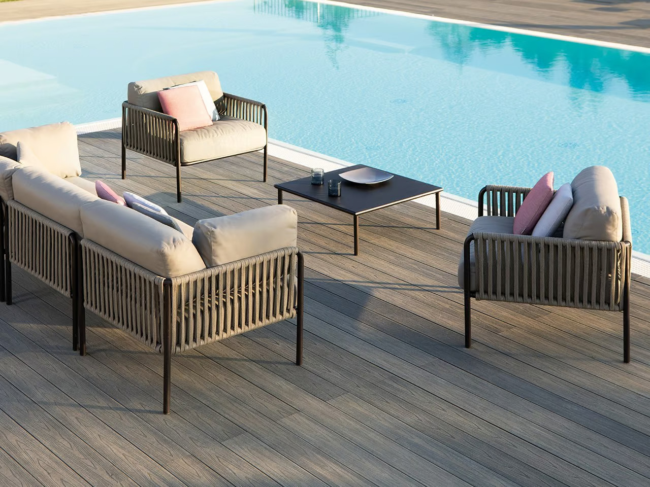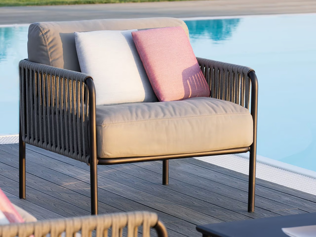 The KEY WEST collection features a garden armchair with armrests, crafted with a robust metal structure and upholstered in premium acrylic fabric available in various colors. This collection emphasizes elegance, charm, and functionality, offering contemporary and adaptable seating solutions. Designed with cutting-edge materials and sleek design lines, these pieces ensure durability and are ideal for outdoor settings. Suitable for resorts, cafés, restaurants, outdoor event planners, and beachside hotels, the collection includes all-weather chairs and modular outdoor seating options. The durable patio chairs and comfortable poolside loungers are perfect for creating inviting and stylish outdoor spaces.