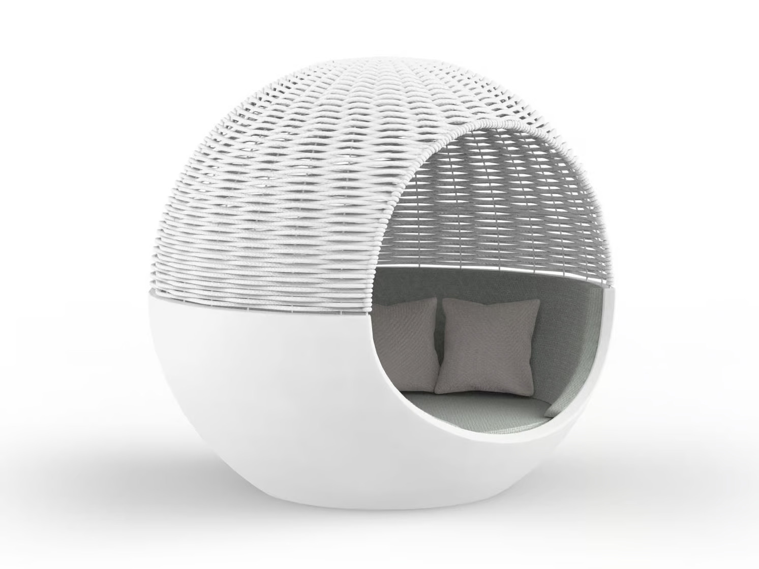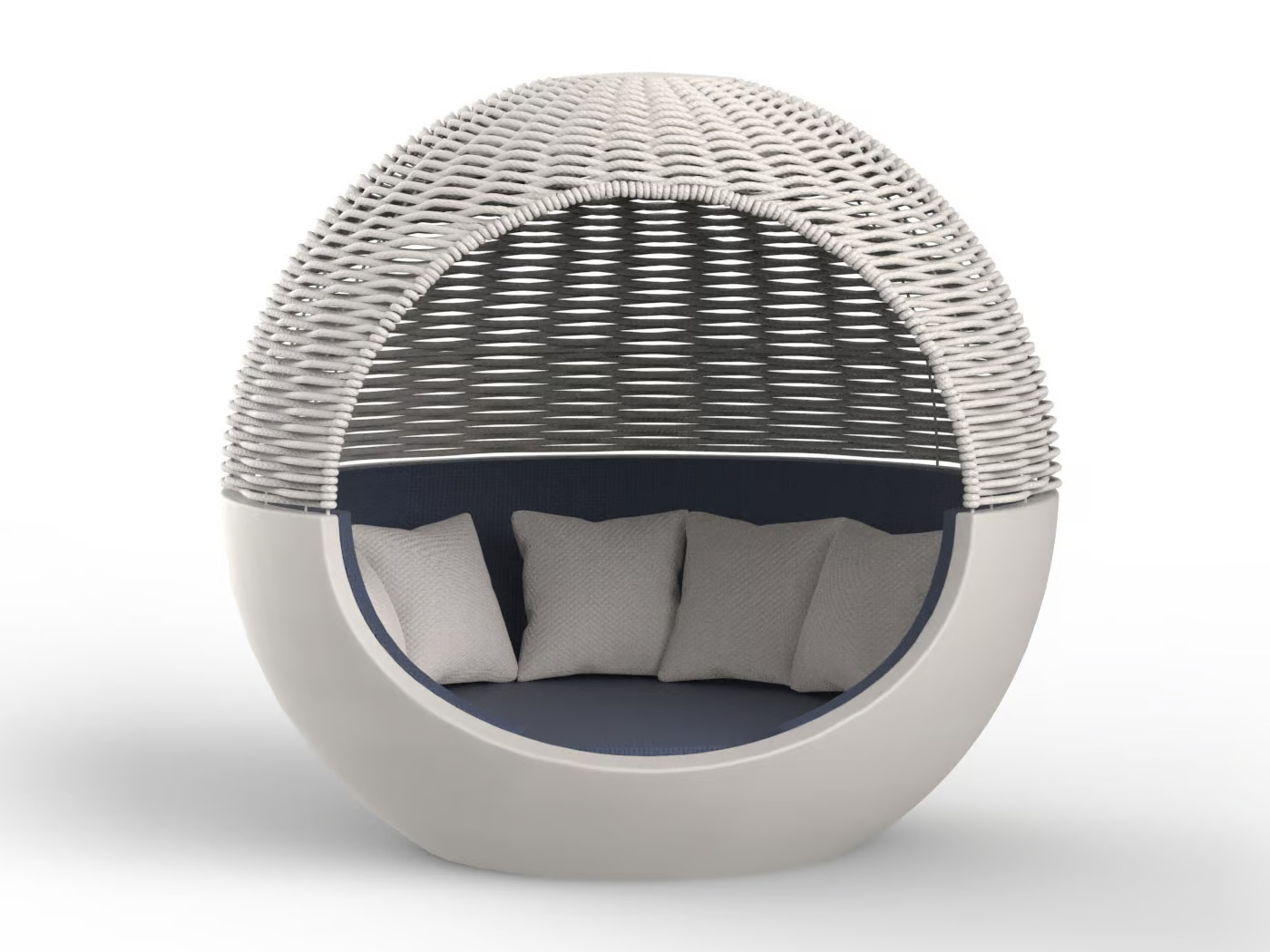 The MOON | Igloo garden bed, designed by Ramón Esteve for Vondom, features a distinctive circular design with a rotating base, allowing it to pivot smoothly on its axis. Constructed from rotationally molded polyethylene, this durable outdoor furniture piece is available with optional LED backlighting, enhancing its allure in various settings. The top is crafted from a woven polypropylene cord, facilitating airflow and softly diffusing light into the interior. This modular outdoor seating option is complemented by a soft, cozy fabric suitable for both indoor and outdoor use. Ideal for resorts, cafés, restaurants, and beachside hotels, the MOON | Igloo garden bed offers a versatile solution for creating comfortable poolside loungers or all-weather outdoor furniture arrangements.
