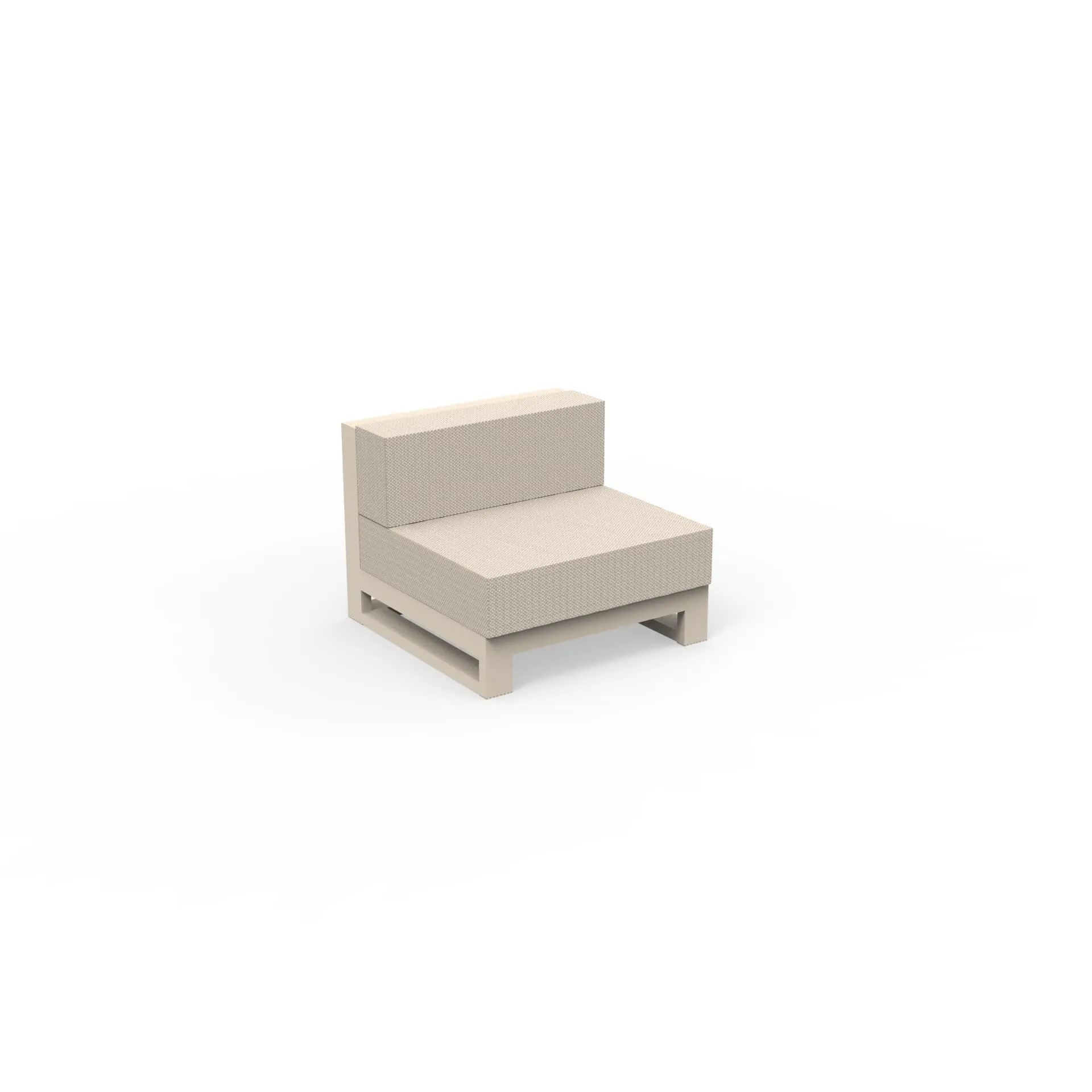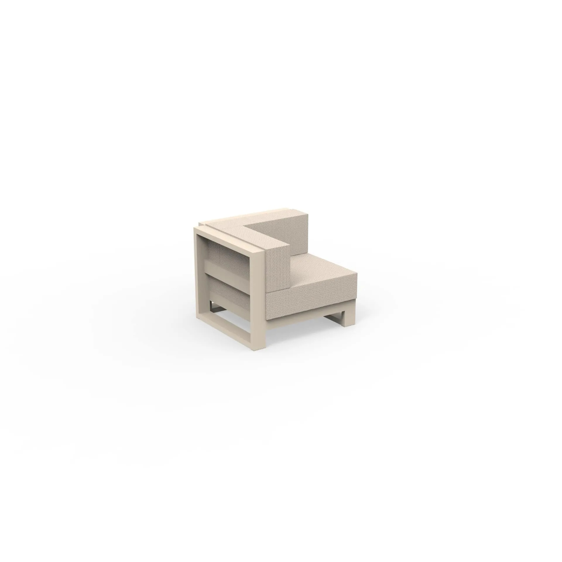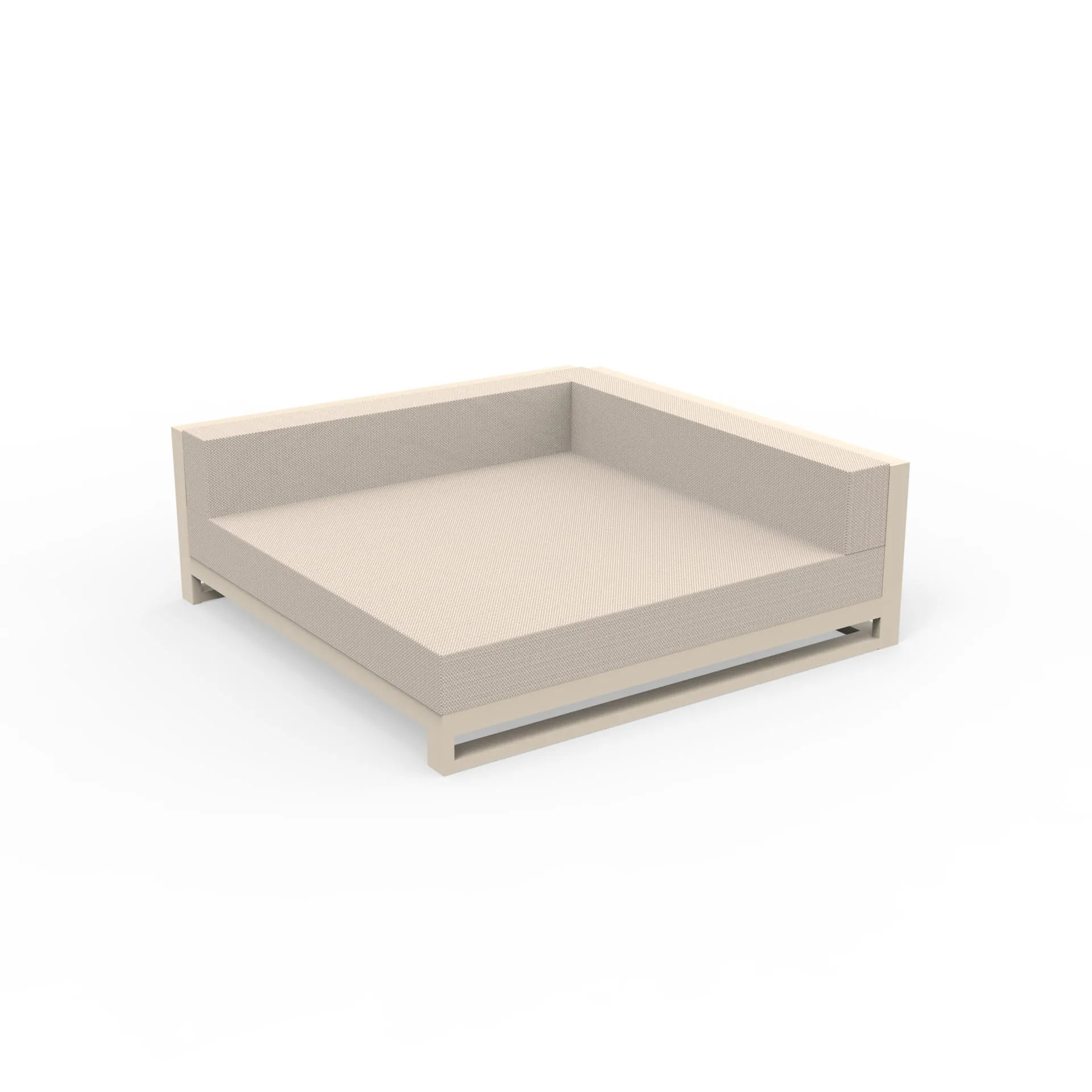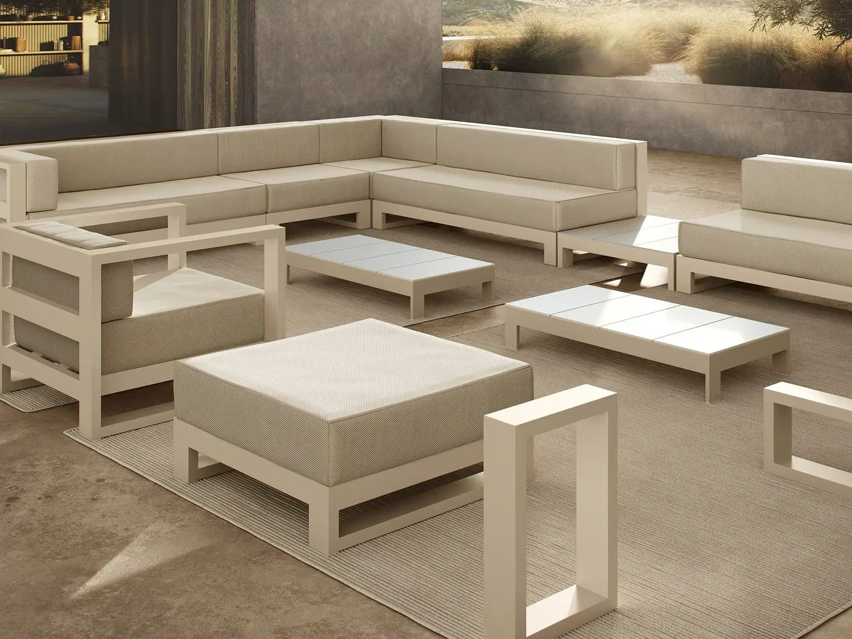 The POSIDONIA sectional garden sofa, crafted with a robust aluminum base and fabric covering, is part of a distinguished collection of durable outdoor furniture. This modular outdoor seating solution, originally designed by Ramón Esteve in 1996, has evolved to meet the demands of contemporary spaces. The collection, now produced by Vondom, draws inspiration from its Mediterranean roots and emphasizes sustainability with its use of 100% recyclable HPL. The POSIDONIA range includes a variety of all-weather outdoor furniture pieces, such as comfortable poolside loungers, durable patio chairs, and versatile tables. Designed to withstand the elements, these garden furniture sets are ideal for resorts, cafés, restaurants, outdoor event planners, and beachside hotels seeking all-weather chairs that blend functionality with timeless design.