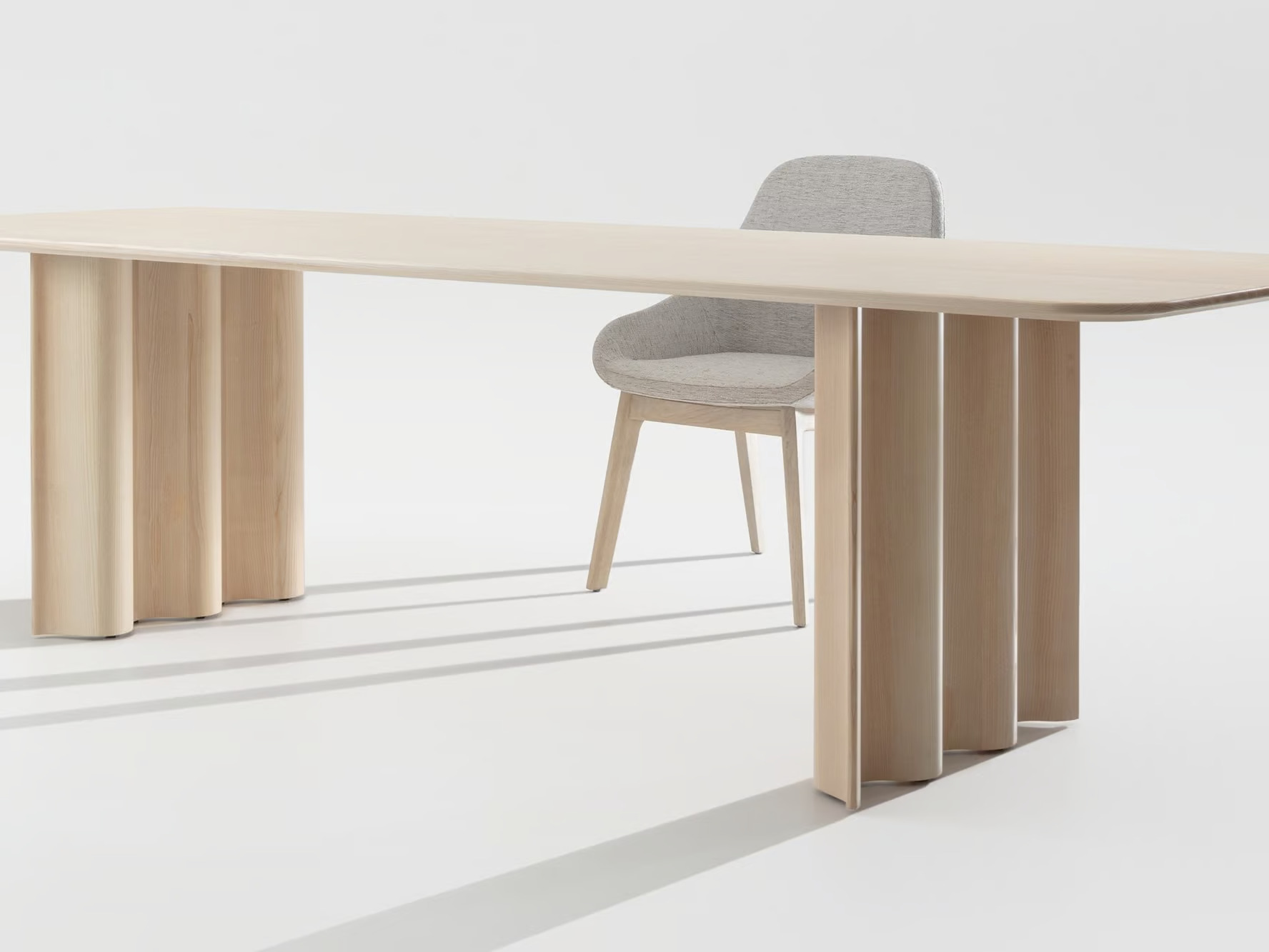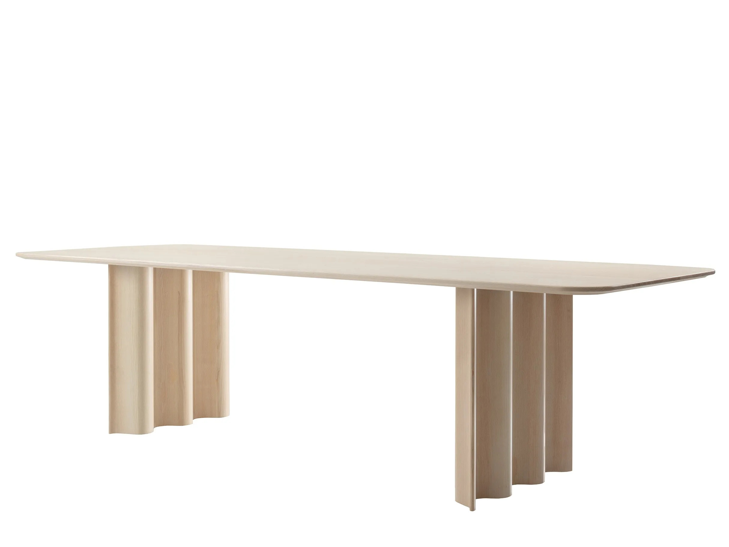 The CURTAIN table offers a unique blend of artistry and functionality, ideal for restaurants, conference rooms, coworking spaces, cafés, event venues, and educational institutions. Its design captures a moment of fluidity, with drapery-like elements crafted from high-quality solid wood, providing a striking contrast to its sturdy, large-sized tabletop. This modern design table, available in ash, oak, American cherry, and walnut, is treated with natural oils and waxes for a refined finish. For contract use, a lacquer finish is recommended for enhanced durability. The CURTAIN table is available in various sizes, starting from 340/360 cm with longitudinal support, making it a versatile choice for dining tables and conference room furniture. Its sculptural form and material harmony create an atmosphere of calm, making it a sophisticated addition to any space.