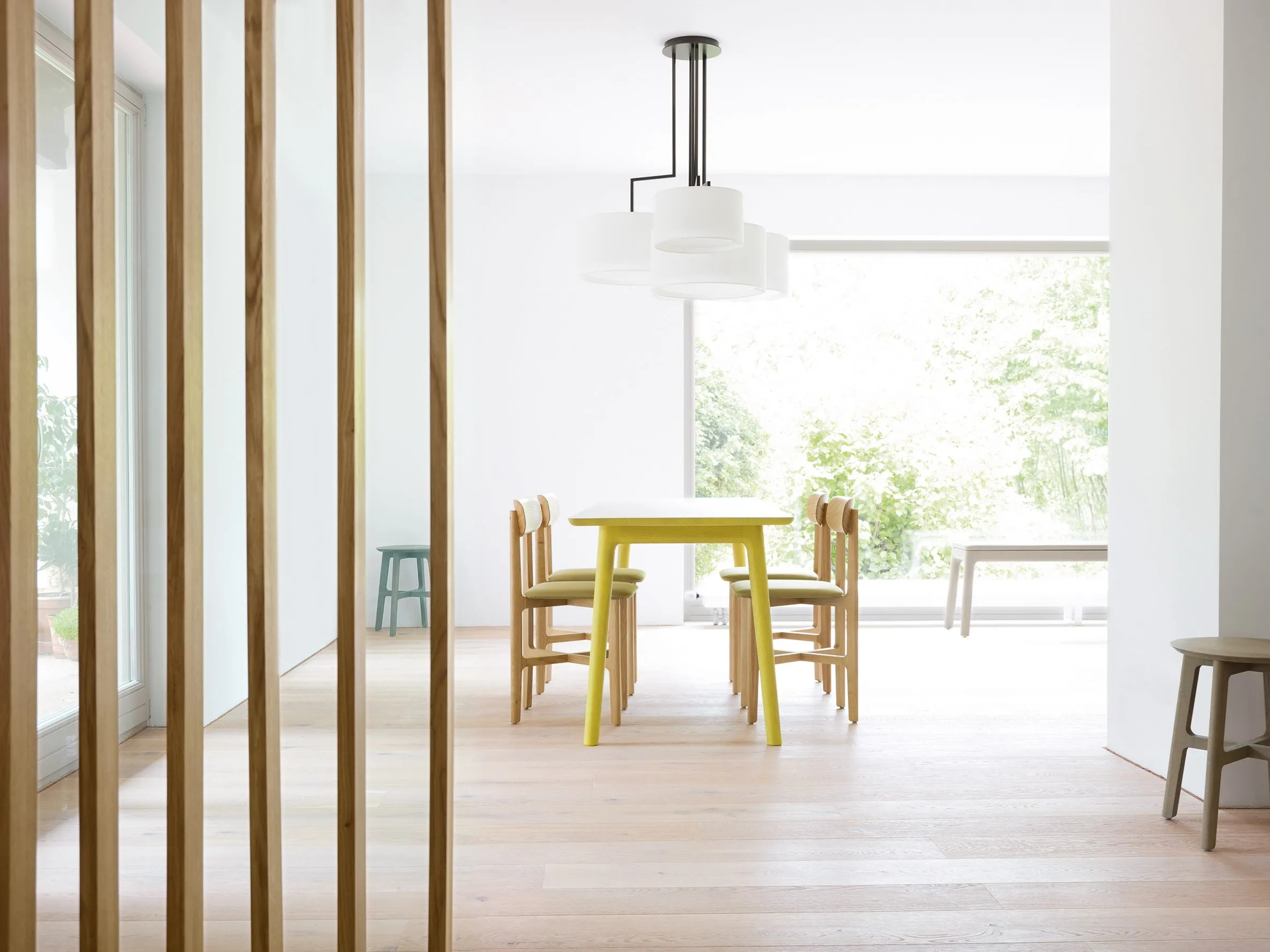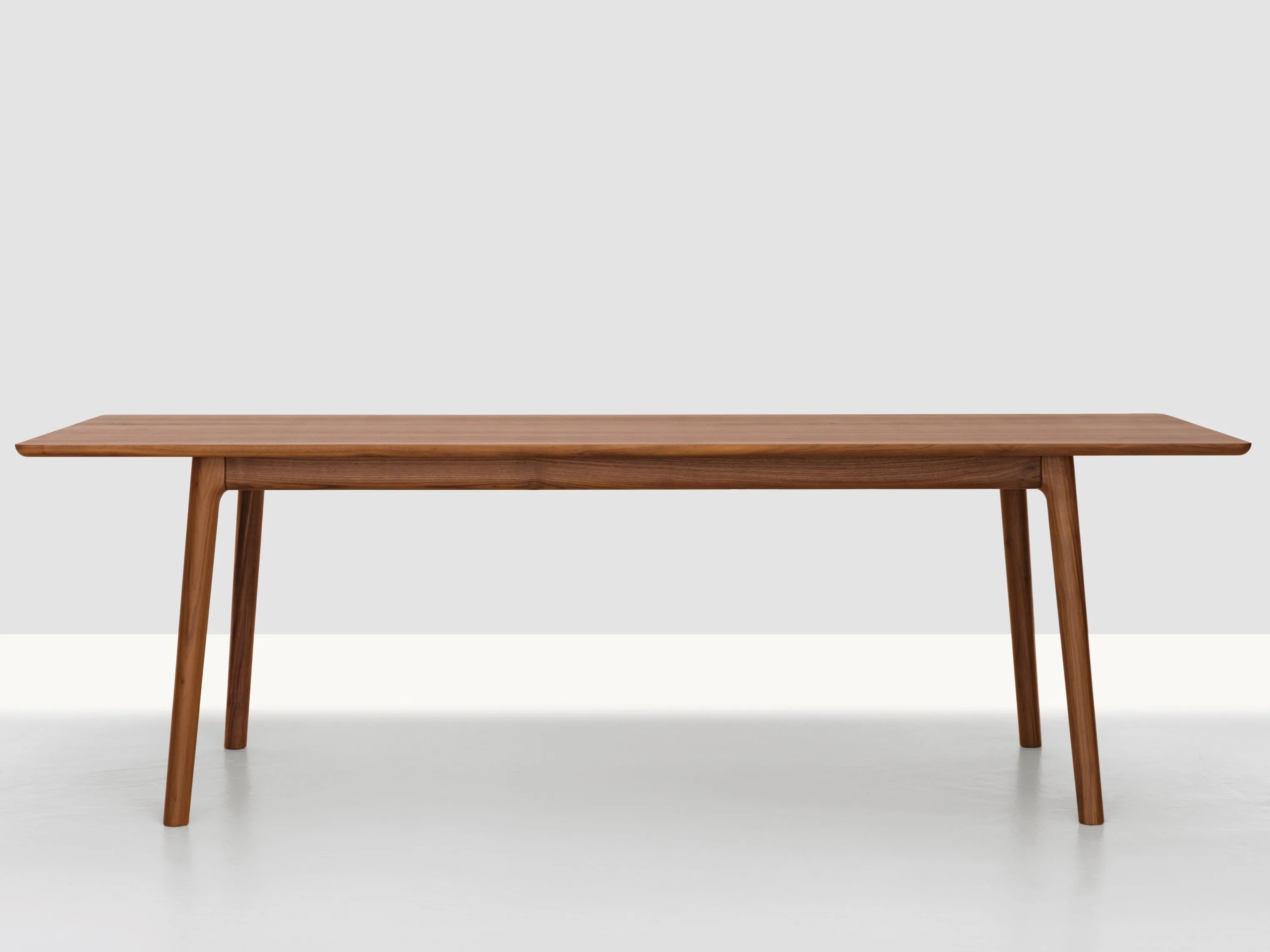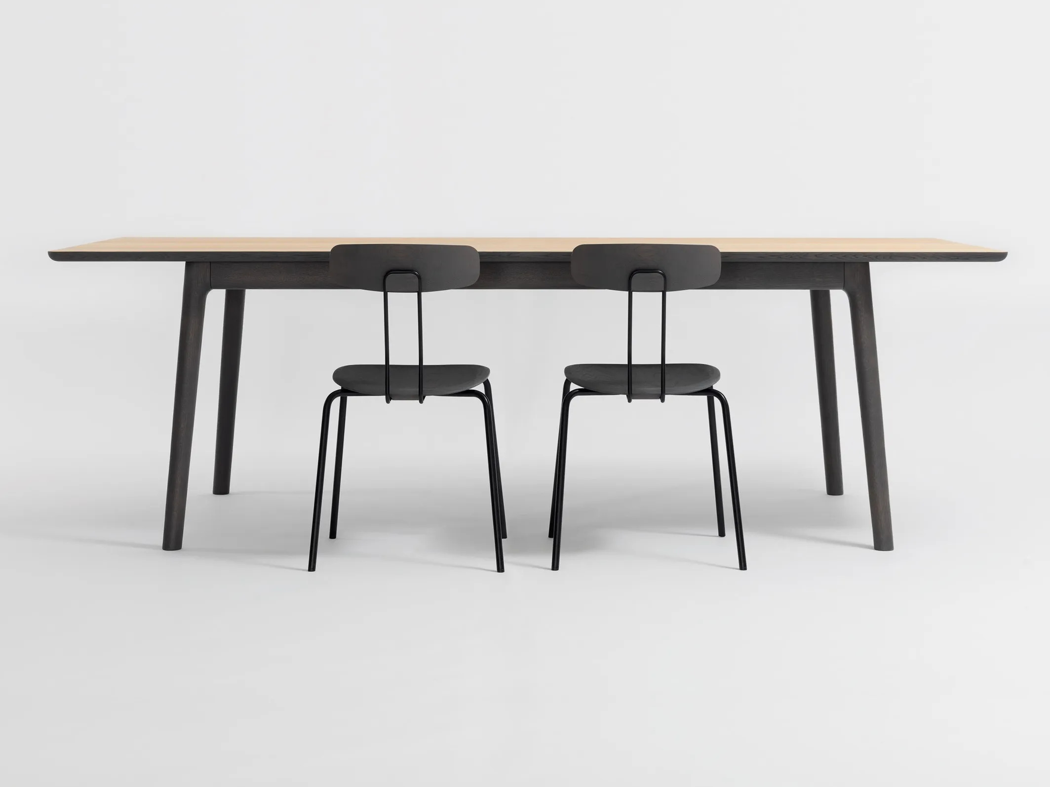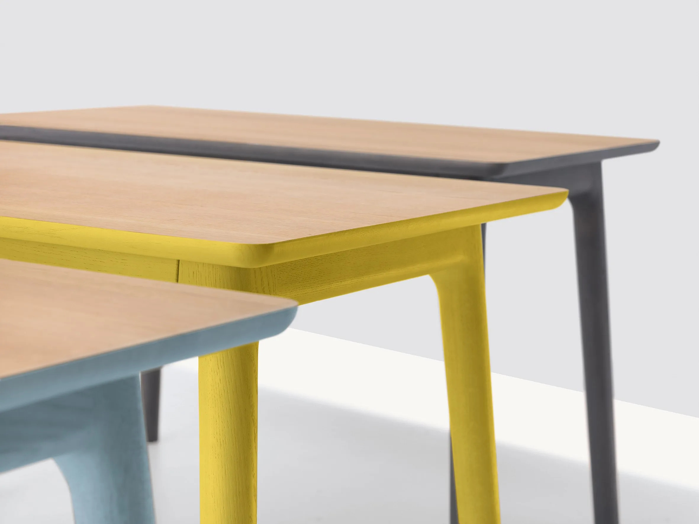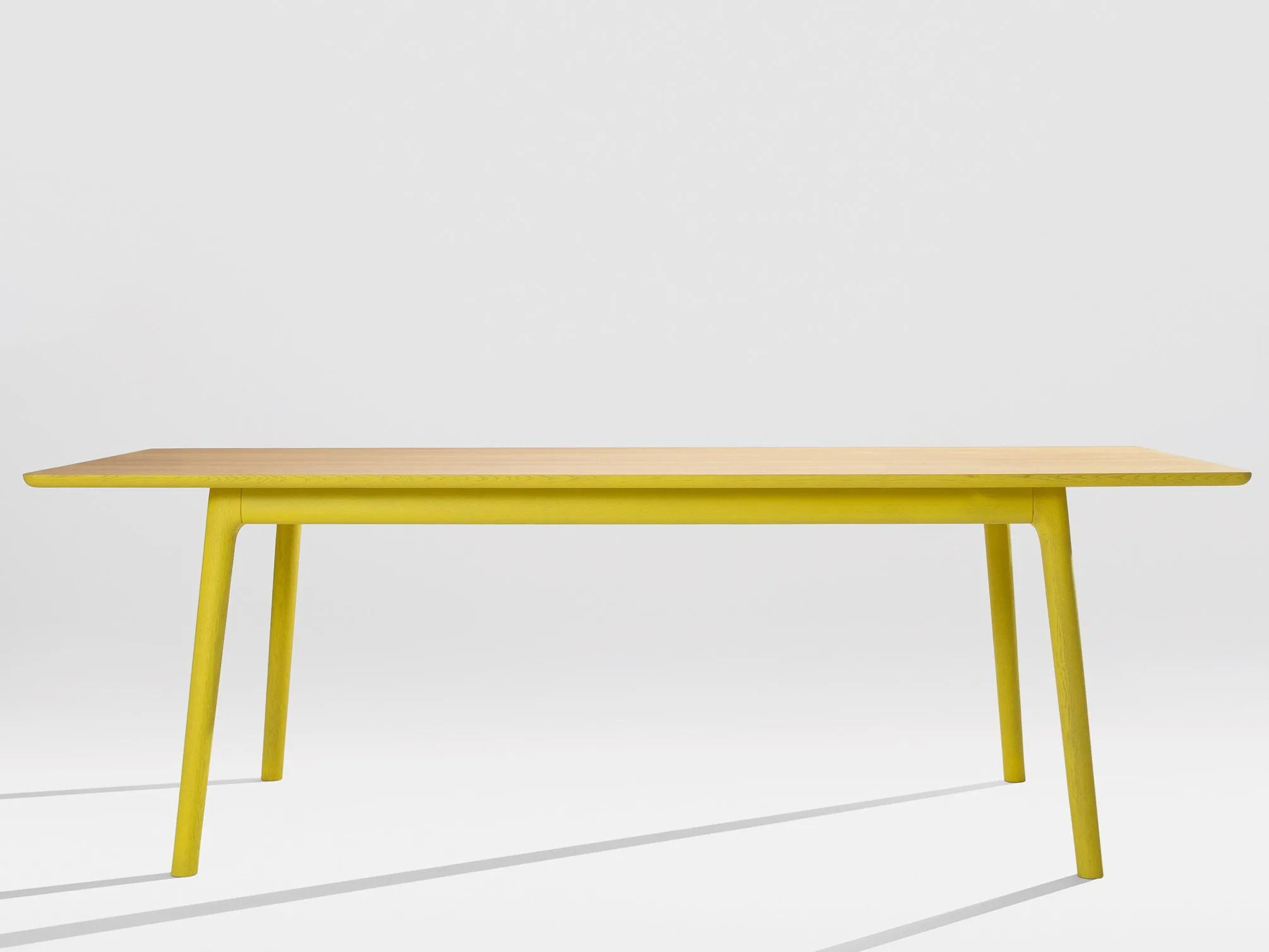 The E8 Rectangular Table, designed by Mathias Hahn, draws inspiration from a post-war era makeshift table, characterized by its narrow, elongated form and distinctive overhangs. This modern design table is ideal for restaurants, conference rooms, coworking spaces, cafés, event venues, and educational institutions. Its extended surface offers versatility, serving as both a dining table and a workspace. Crafted from solid wood, the table is available in oak or American walnut. The natural version features a surface treated with natural oils and waxes, while the colored version offers a matt lacquered finish in zinc yellow or color stain. This piece complements ergonomic and stackable chairs, enhancing any setting with durable seating and functional conference room furniture.
