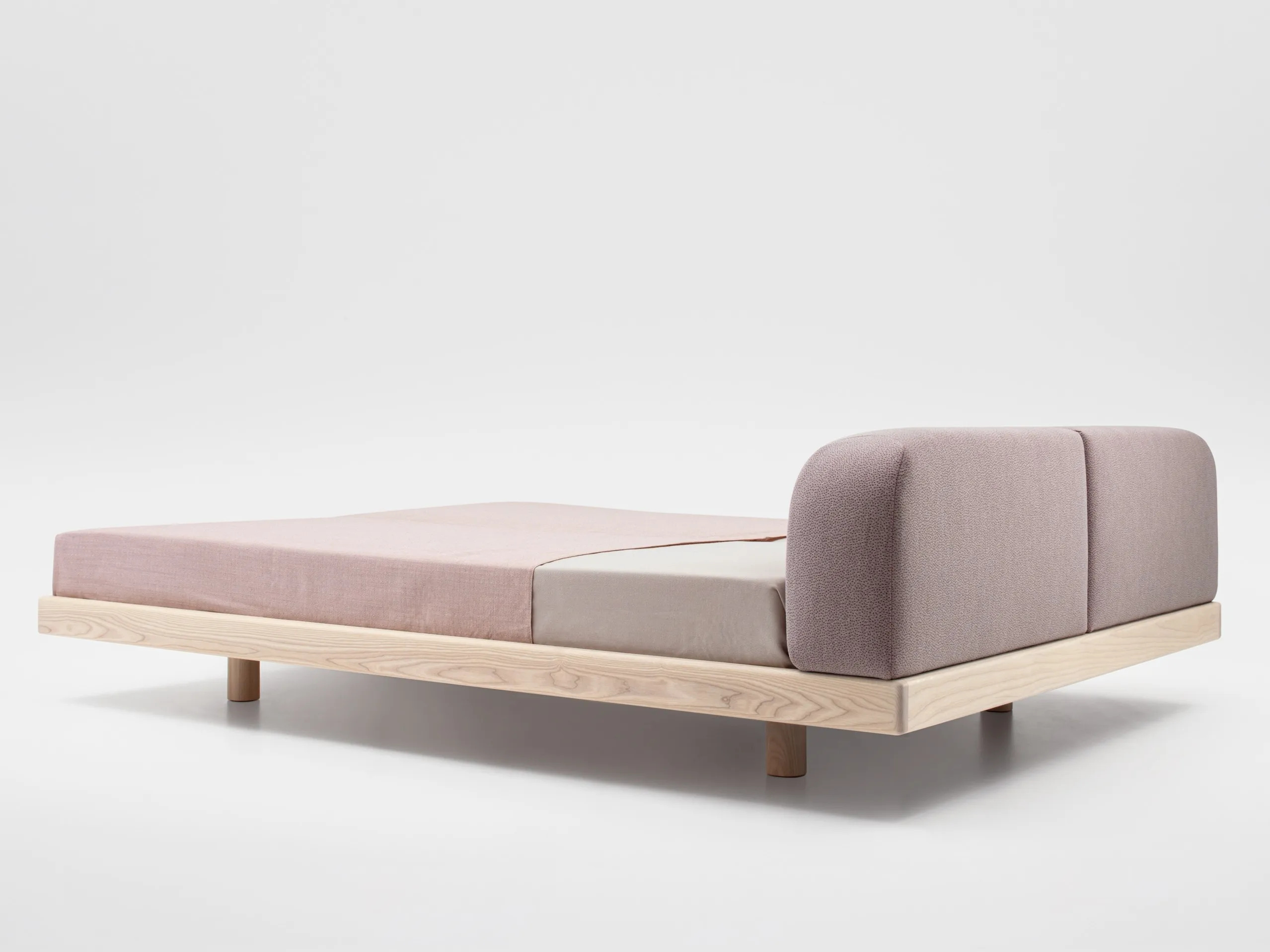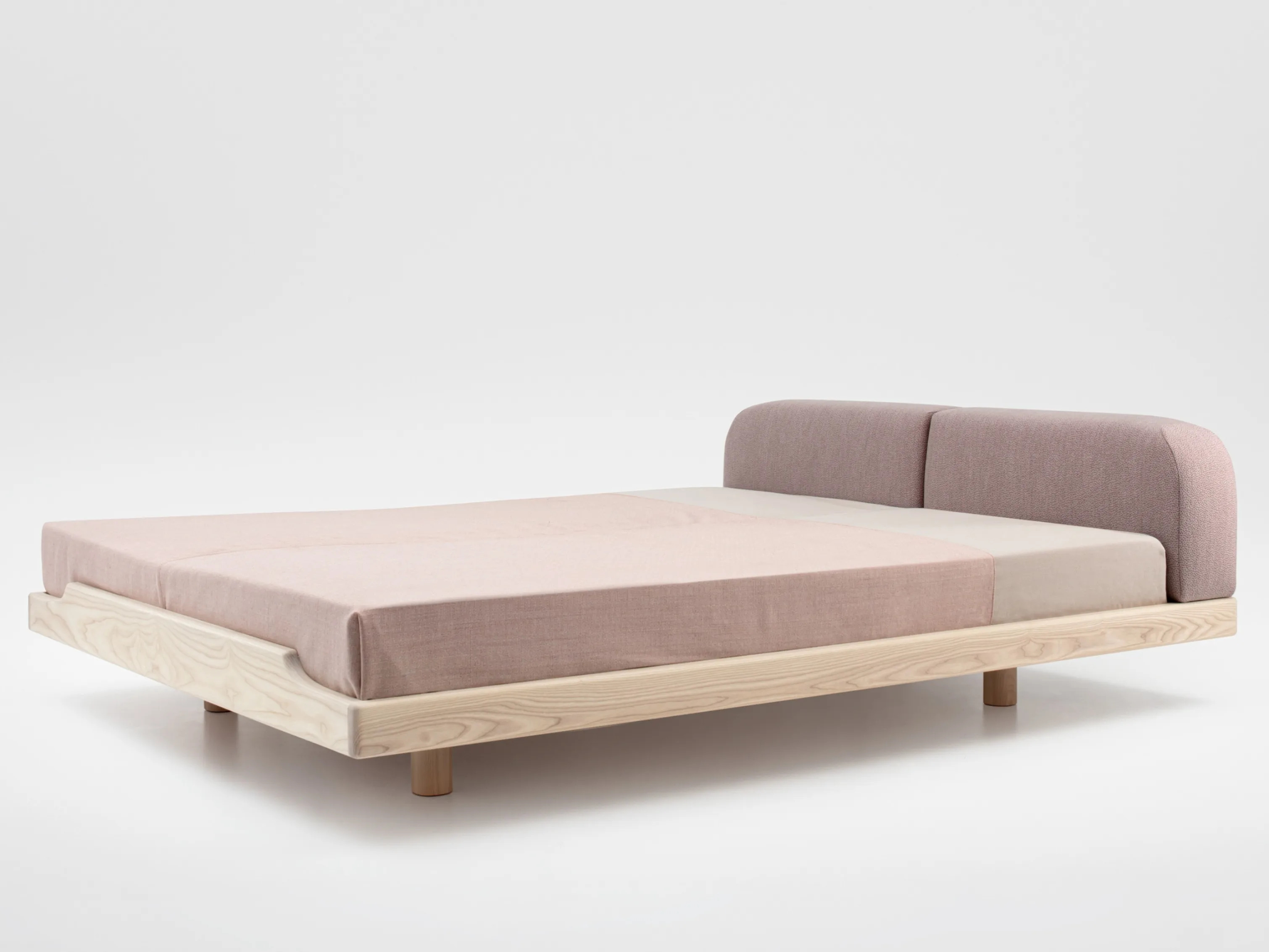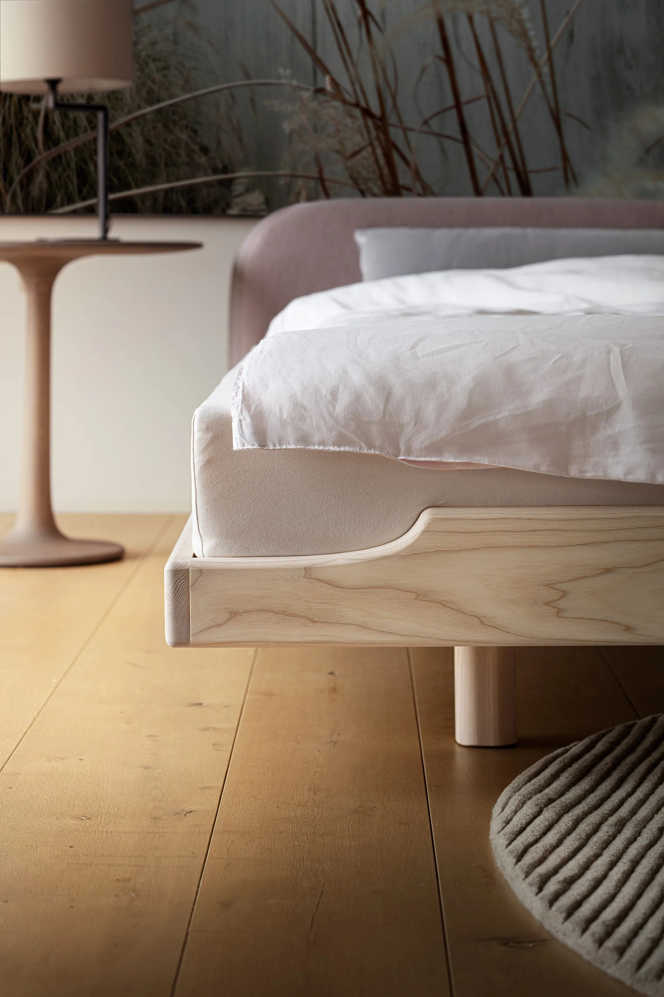 The ECLAIR bed features a minimalist design with clean outer contours, ideal for hotel room beds and furnishings. Its frame elegantly encases the mattress, while the foot section gracefully curves upward, providing a sense of security and support. Crafted from solid wood, the bed's soft, rounded edges highlight the material's quality and beauty. The upholstered cushions serve as a comfortable headrest for reading or a stable backrest for sitting, seamlessly integrating with the streamlined bed frame. Available in various solid wood options, including ash, oak, and walnut, the bed is finished with natural oils and waxes. Mattress sizes range from 100 × 200 cm to 200 × 200 cm, making it suitable for space-saving bedroom designs in family-friendly accommodations. The ECLAIR bed combines modern bed frames and nightstands with multifunctional bedroom sets, offering creative bedroom storage solutions for children's room furniture and family-friendly resorts.