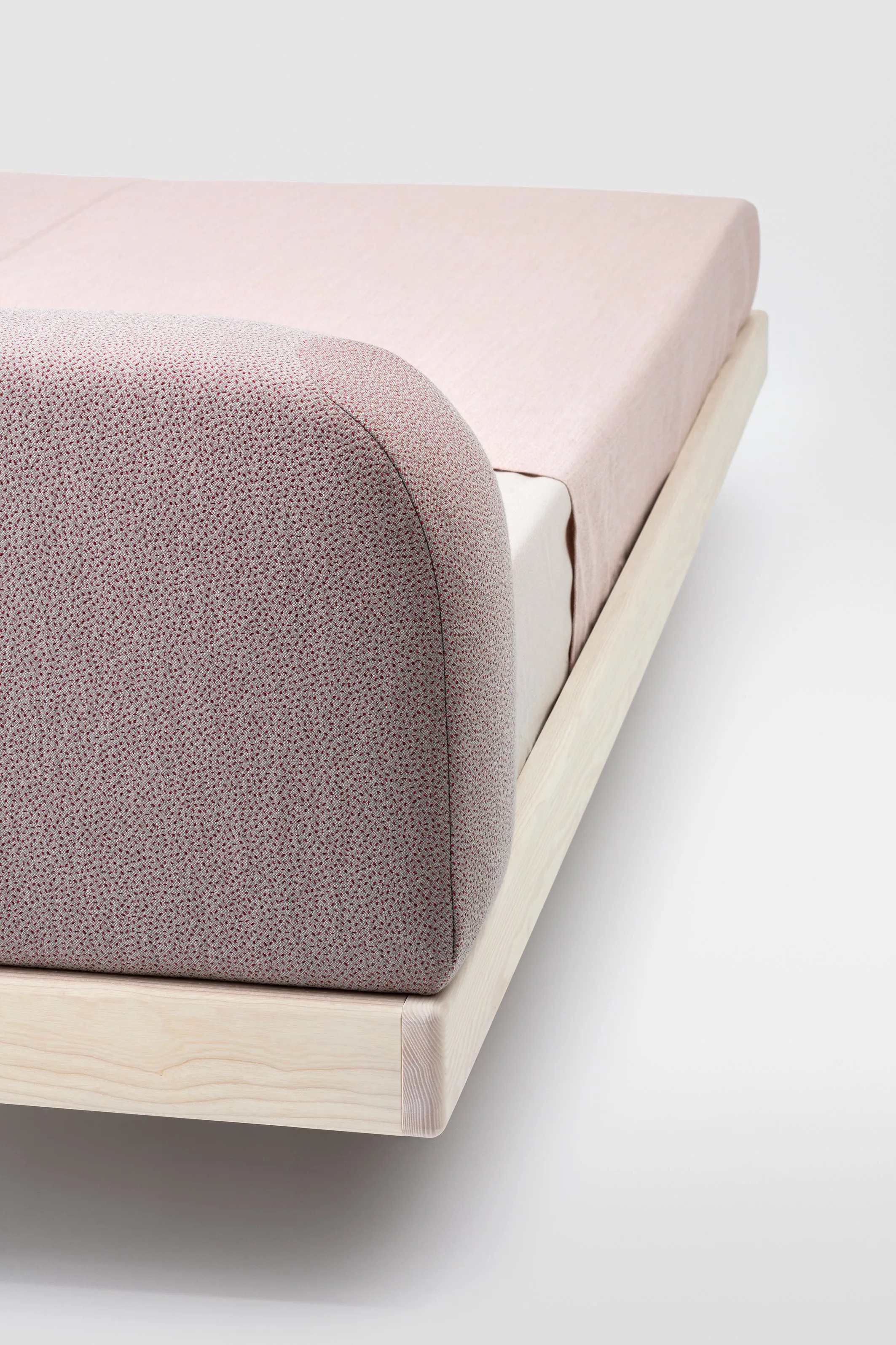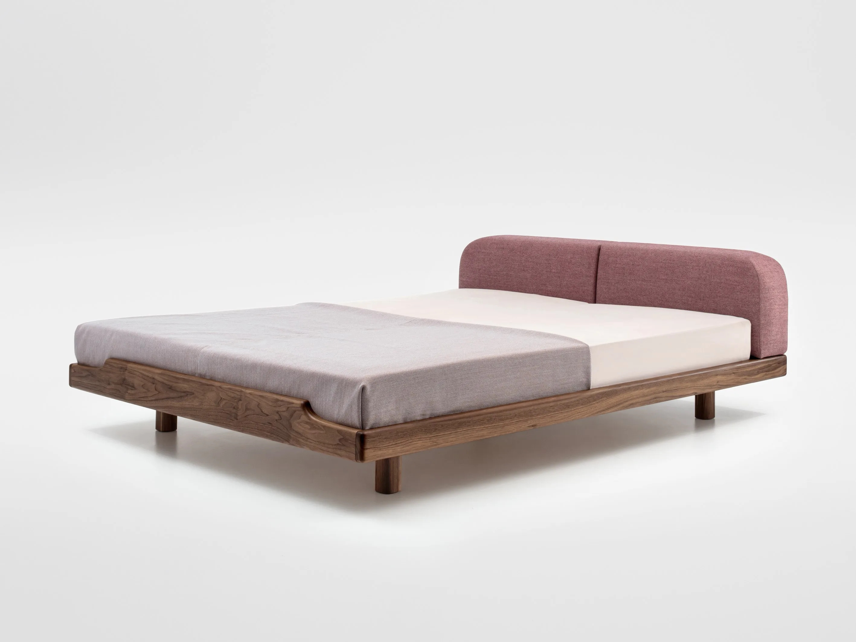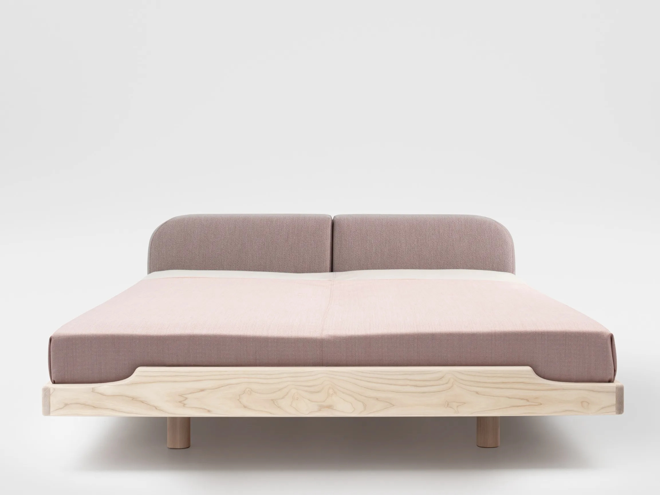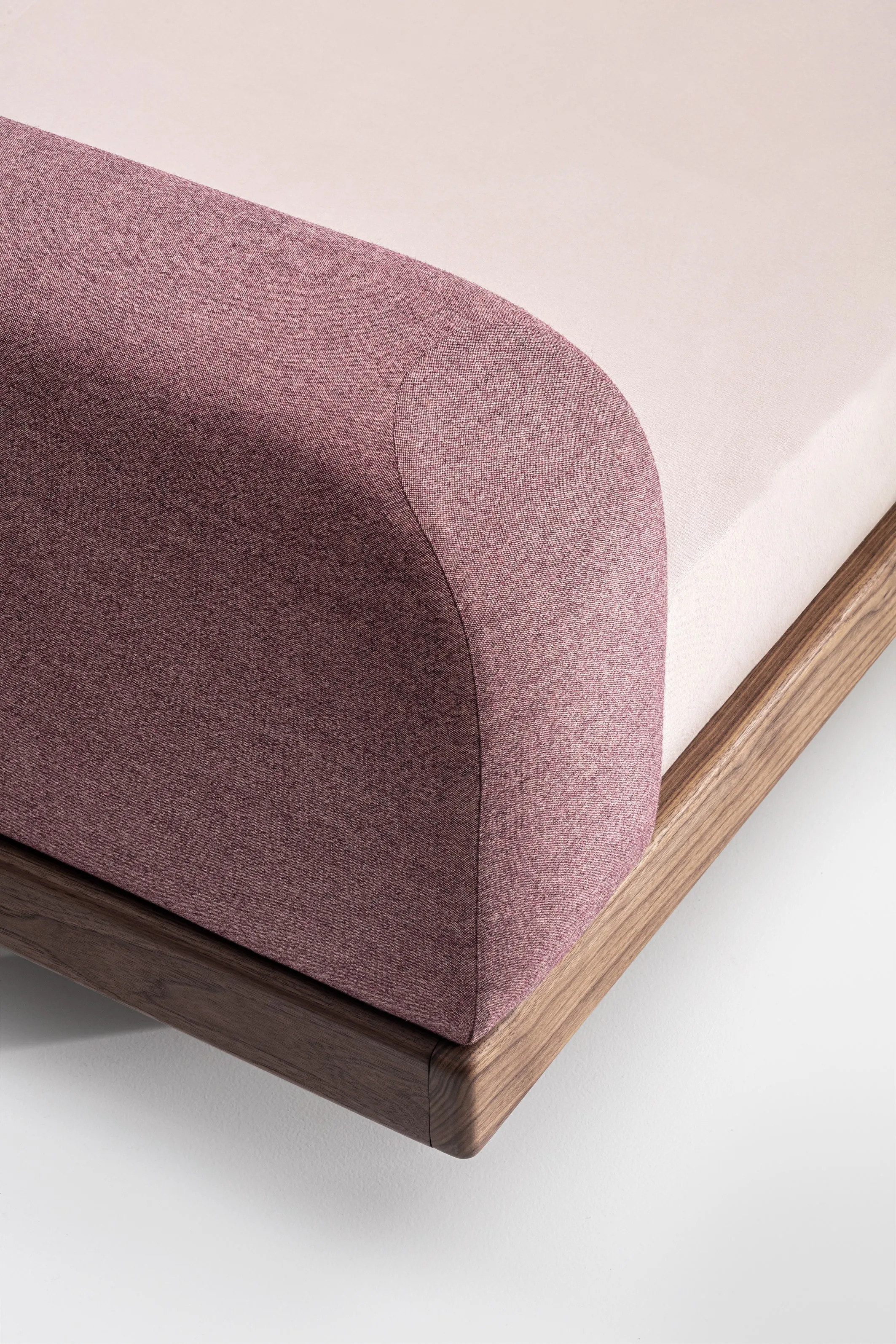 The ECLAIR bed features a minimalist design with clean outer contours, ideal for hotel room beds and furnishings. Its frame elegantly encases the mattress, while the foot section gracefully curves upward, providing a sense of security and support. Crafted from solid wood, the bed's soft, rounded edges highlight the material's quality and beauty. The upholstered cushions serve as a comfortable headrest for reading or a stable backrest for sitting, seamlessly integrating with the streamlined bed frame. Available in various solid wood options, including ash, oak, and walnut, the bed is finished with natural oils and waxes. Mattress sizes range from 100 × 200 cm to 200 × 200 cm, making it suitable for space-saving bedroom designs in family-friendly accommodations. The ECLAIR bed combines modern bed frames and nightstands with multifunctional bedroom sets, offering creative bedroom storage solutions for children's room furniture and family-friendly resorts.