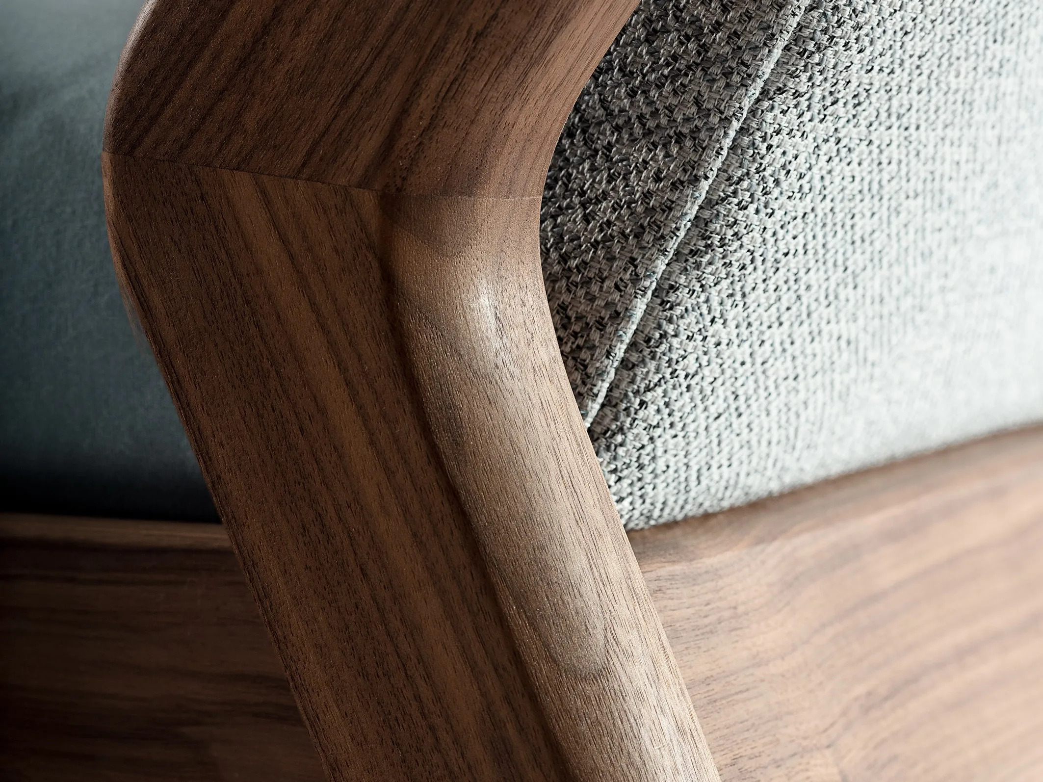FRIDAY NIGHT offers a harmonious blend of comfort and modern design, ideal for hotels, boutique inns, and family-friendly resorts. Crafted by the designer duo Formstelle, this piece seamlessly integrates textiles and wood, creating a cohesive aesthetic. The backrest gracefully arcs from the headboard to the floor, transitioning into a sturdy foot, while the front appears to float due to its inwardly offset feet. This multifunctional bedroom set serves as a bed, sofa, or lounge, with sturdy cushions providing support and comfort. The delicate seam pattern enhances the backrest, offering a cozy cushion landscape. Available in various mattress sizes, FRIDAY NIGHT is crafted from ash, oak, and American walnut, with surfaces treated with natural oils and waxes or a matt lacquered oak stain.