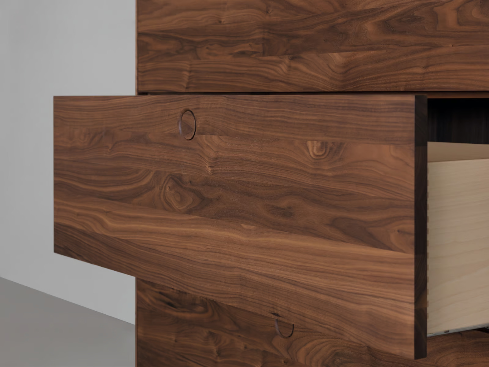 KIN BIG is a versatile modular storage unit designed to meet diverse storage needs across various settings. Its adaptability allows it to function as a compact wardrobe in a child's room, a spacious kitchen cabinet, or a large bedroom dresser that seamlessly transitions into hallway furniture. Ideal for offices, boutique shops, hotels, libraries, and coworking spaces, this space-saving storage system offers efficient solutions for organizing and decluttering. Crafted from oak, oak color stain, and American walnut with a vertical grain, the surface is treated with natural oils and waxes, and finished with a matte lacquer for durability. KIN BIG serves as a stylish and durable storage option, suitable for both residential and commercial environments, providing a minimalist and modern aesthetic.