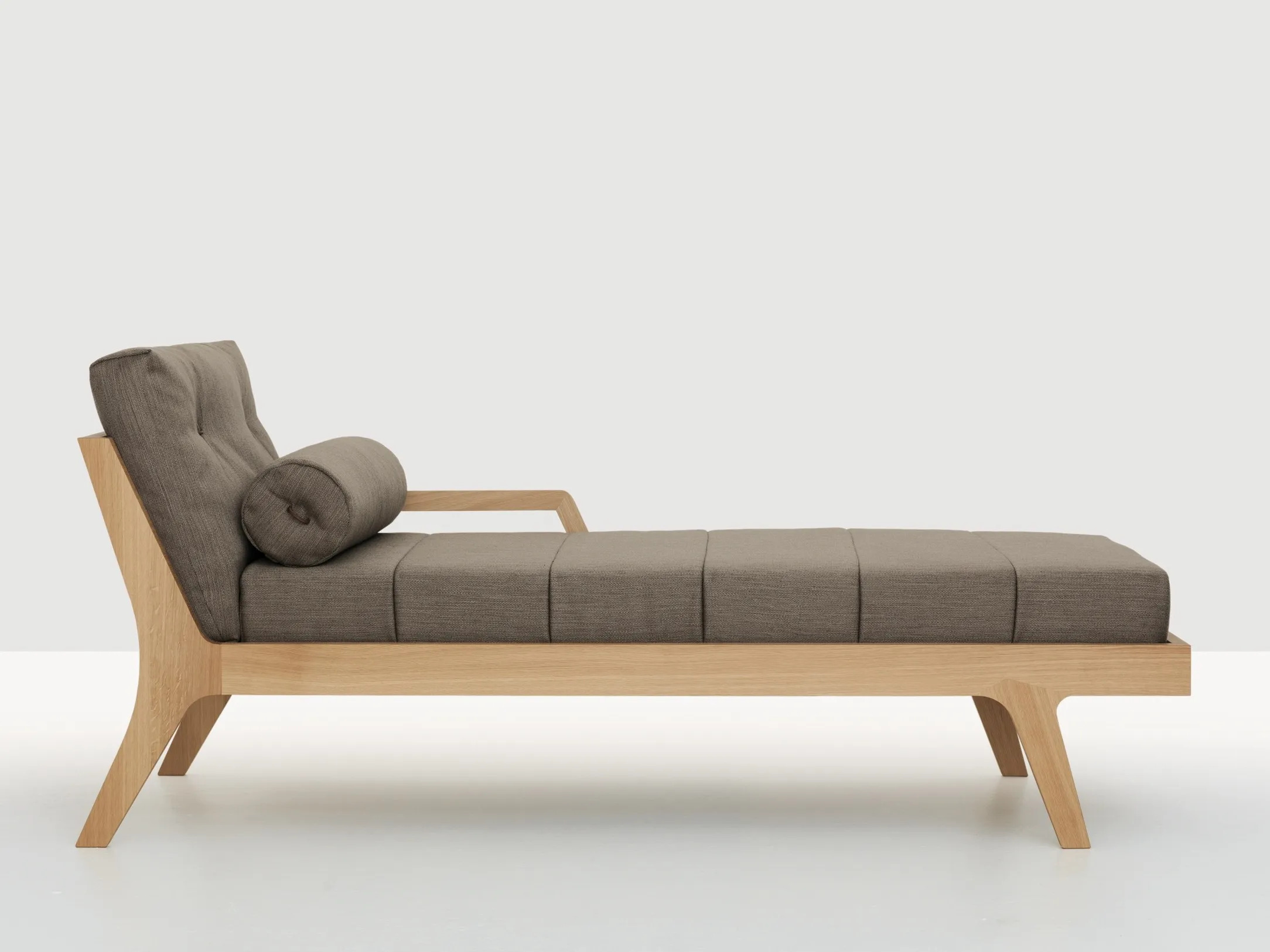 The MELLOW DAYBED offers a versatile seating solution, seamlessly transitioning between a daybed and a chaise longue, ideal for hotels, cafés, lounges, and waiting rooms. Its ergonomic design features a soft back pillow and an upholstered roll, ensuring comfort whether sitting or reclining. The daybed is characterized by its slim material profiles, fine lines, and a delicate frame, complemented by soft upholstery and distinctive bend leather cording at the back. Constructed from solid wood options like ash, oak, and walnut, it includes a lacing of leather straps in matching colors for both the back element and cushions. The upholstered headboard, filled with duck down and a foam core, provides additional stability. Available in fabric or leather, the mattress cover is removable, with vegan alternatives for leather straps upon request. The daybed includes a mattress and a slatted base system with silent rubber bearings, offering customizable options such as armrests.