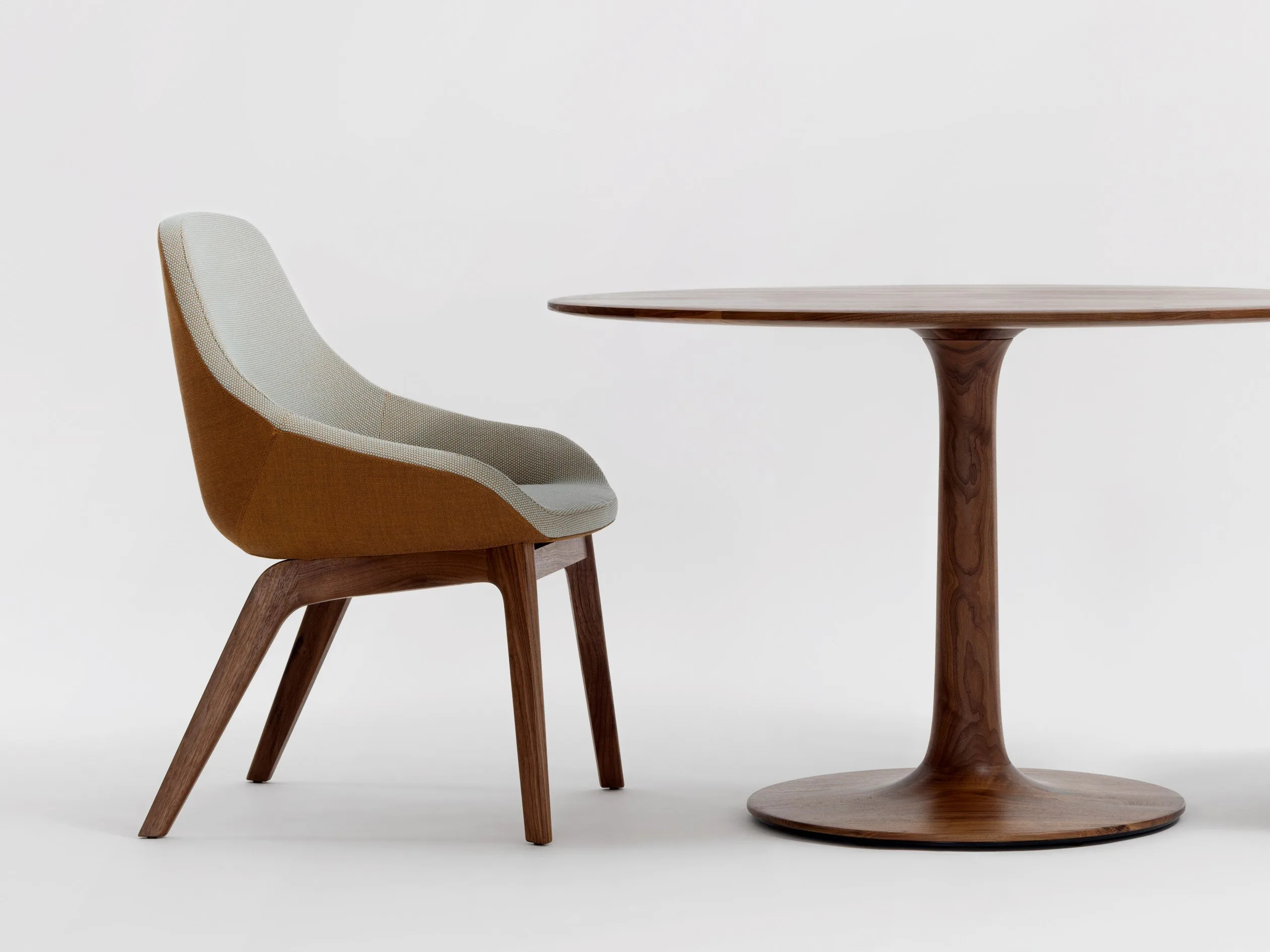MORPH DINING offers a sophisticated seating solution, ideal for restaurants, conference rooms, coworking spaces, cafés, event venues, and educational institutions. This dining chair is distinguished by its luxurious design and exceptional comfort, featuring a generously upholstered shell and gently curved armrests that facilitate easy sitting and standing. Its elegant presence suits upscale dining areas and premium conference settings. The chair's design versatility is enhanced by a combination of leather and fabric, contrasting colors, and frames available in oak, walnut, or color stains. Constructed with solid wood and upholstered with CFC/CHC-free polyurethane foam, MORPH DINING ensures durability and ergonomic support. The chair is equipped with plastic glides, with additional options available for various flooring types. It meets the rigorous standards of the CATAS Test EN 1728:2012 Level 2 for durability.
