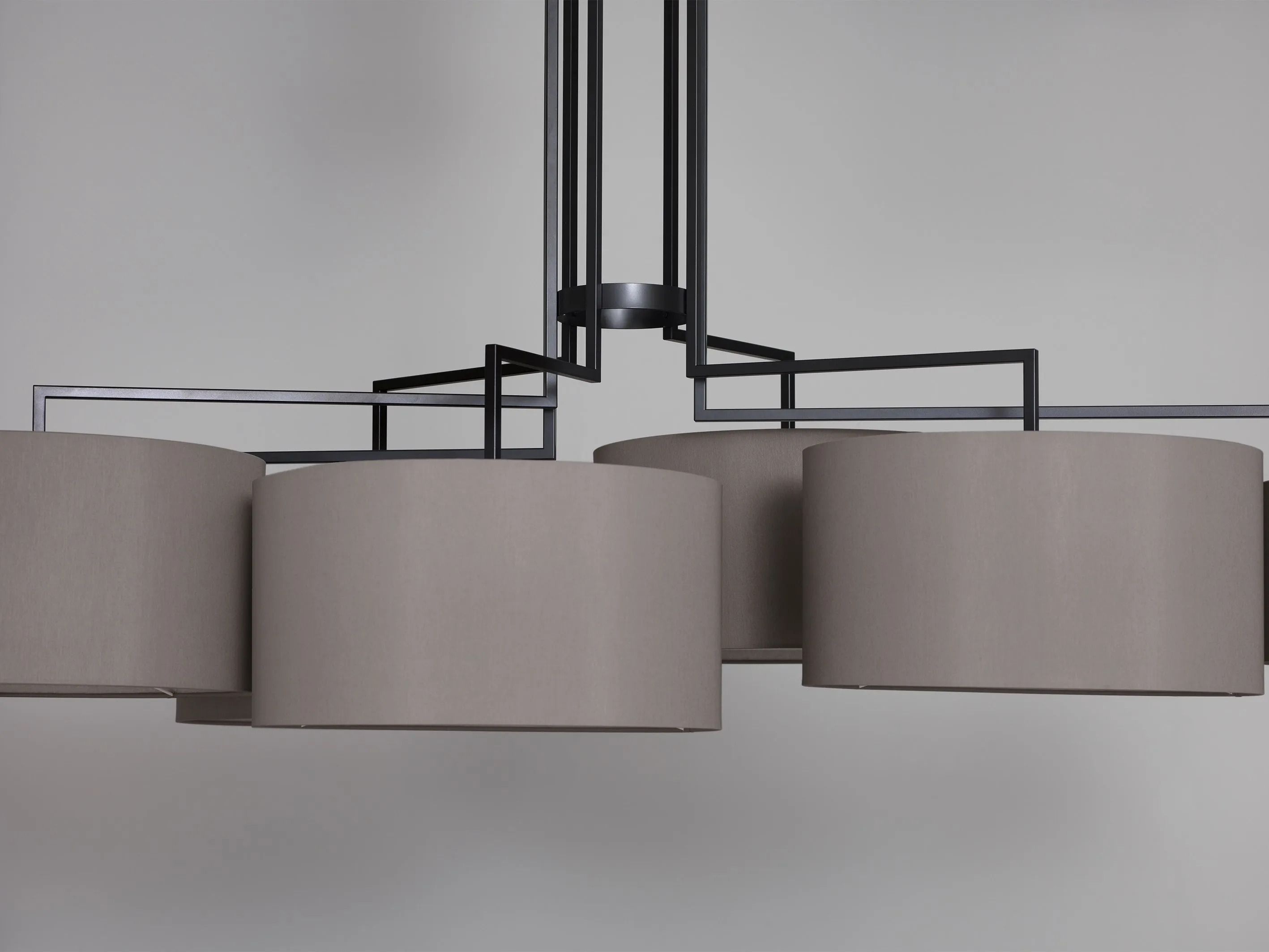 NOON 7 is designed to enhance large tables and lobbies with its elegant presence. Its design draws inspiration from the geometric abstraction of natural branch forms, offering a blend of simplicity and modern chandelier designs. Constructed with a sturdy iron frame, it features a matte black or white powder-coated finish, providing a soft, warm appearance. The textile lampshades, available in white, light grey, warm grey, and black, emit a gentle, ambient light, while the diffuser minimizes glare. This energy-efficient lighting solution is suitable for ceiling heights of 240 to 270 cm, with customization options available. Recommended for use with LED Parathom Classic P 40 DIM 4.5 W or Classic A 75 DIM 8.5 W bulbs, NOON 7 offers a sophisticated choice for hotels, offices, retail spaces, restaurants, and residential interior designers seeking modern LED interior lighting.
