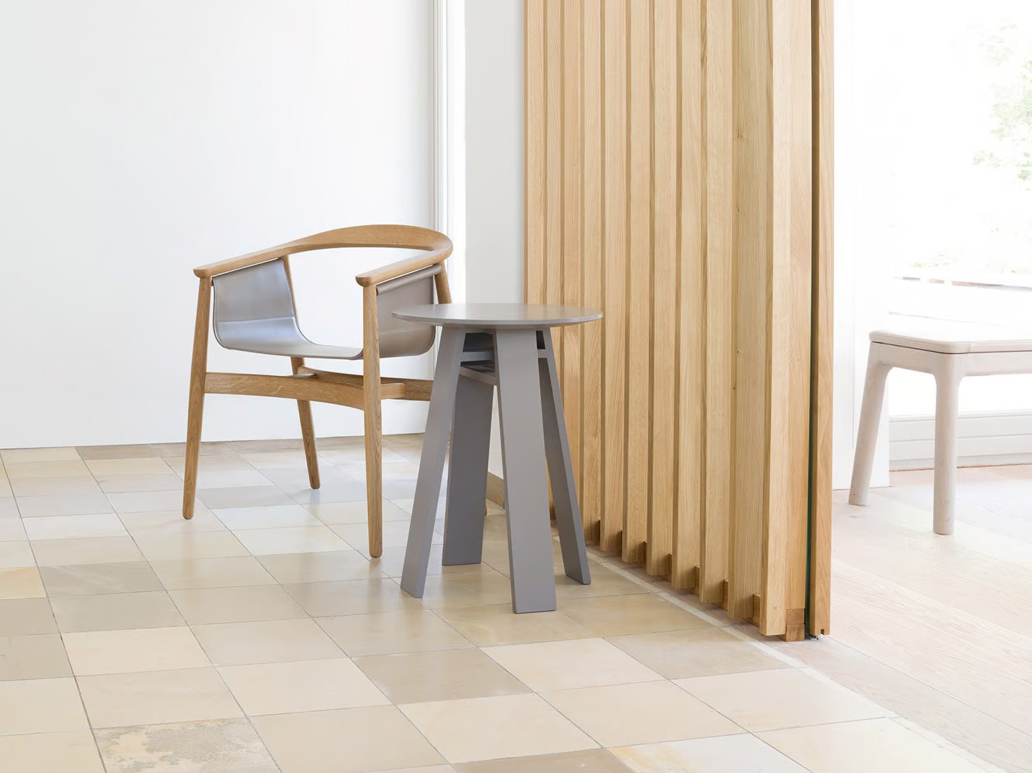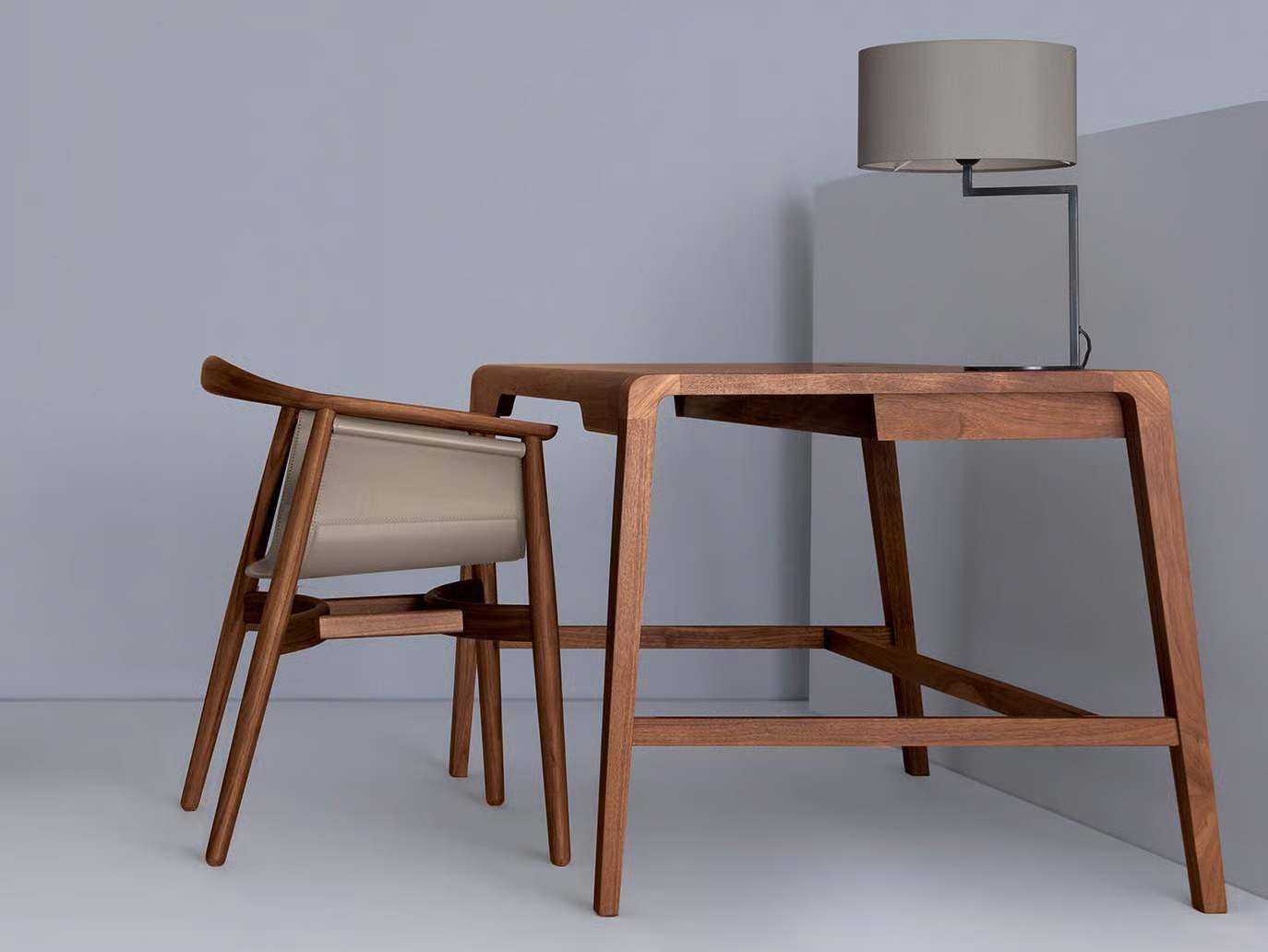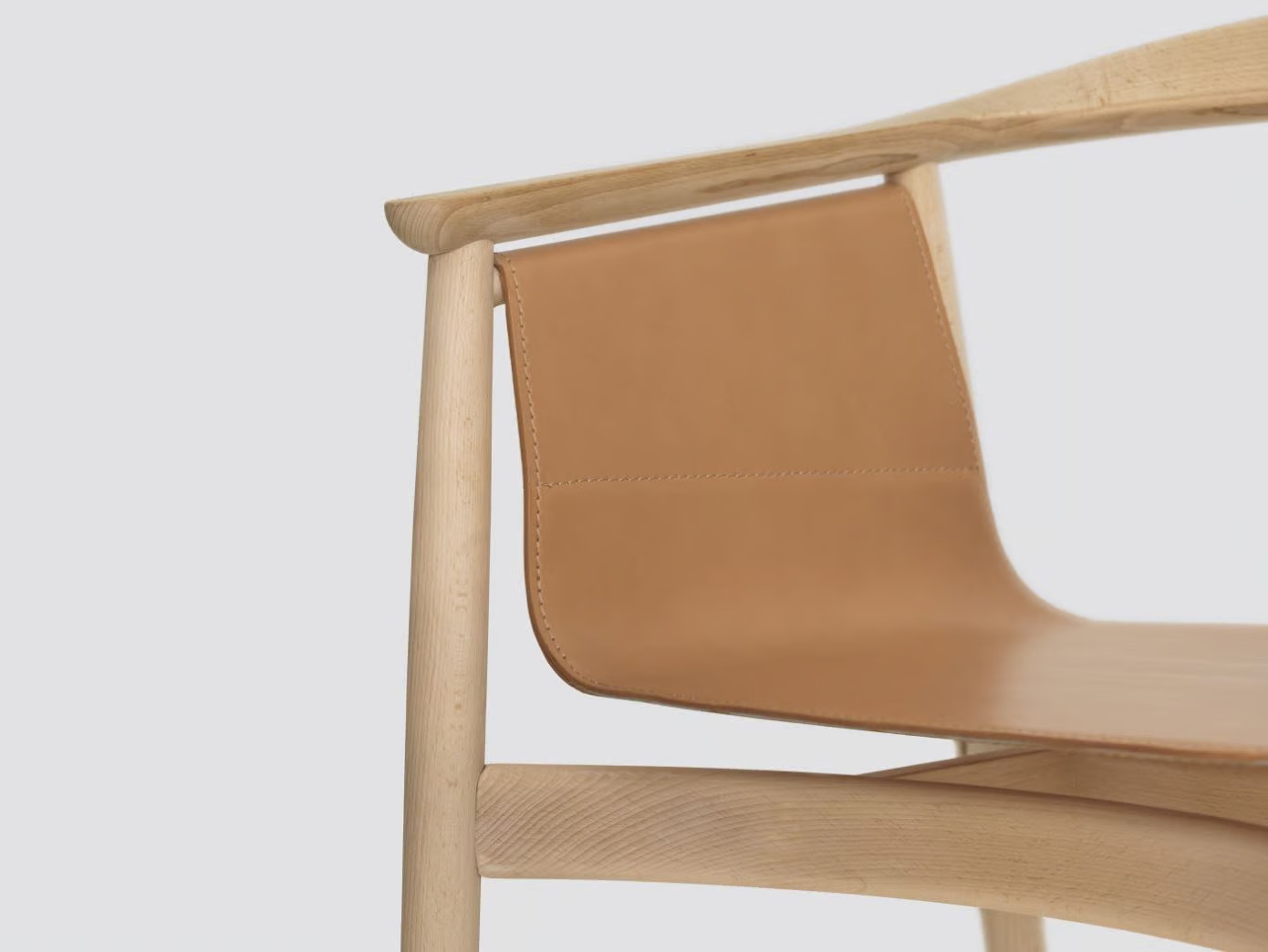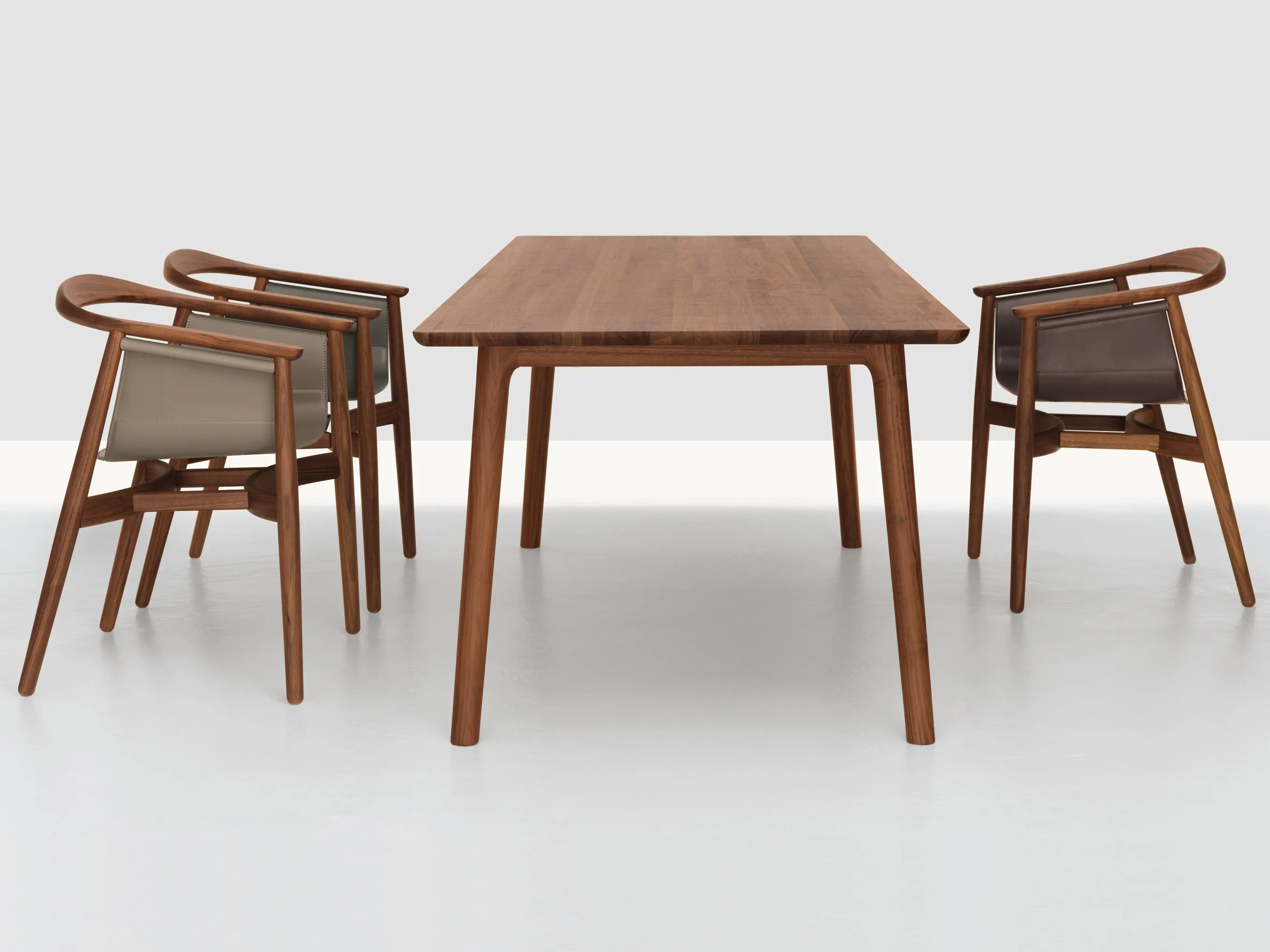 The PELLE collection combines elegance and functionality, making it ideal for restaurants, conference rooms, coworking spaces, cafés, event venues, and educational institutions. Its semi-circular back and armrest draw inspiration from Scandinavian design, while the unique freely hanging seat is supported by a round strut beneath the backrest. Crafted from solid wood, available in oak or American walnut, the frame complements the sleek leather seat, offered in various shades such as schlammgrau, asphalt, and black. The design's standout feature is the seamless integration of the back and armrest. PELLE's versatility allows it to function as a standalone piece or in groups. The surface is treated with natural oils and waxes, with options for matt lacquered finishes. It includes plastic glides, with additional options available for different flooring types. The collection meets CATAS Test EN 1728:2012 Level 2 standards for durability.