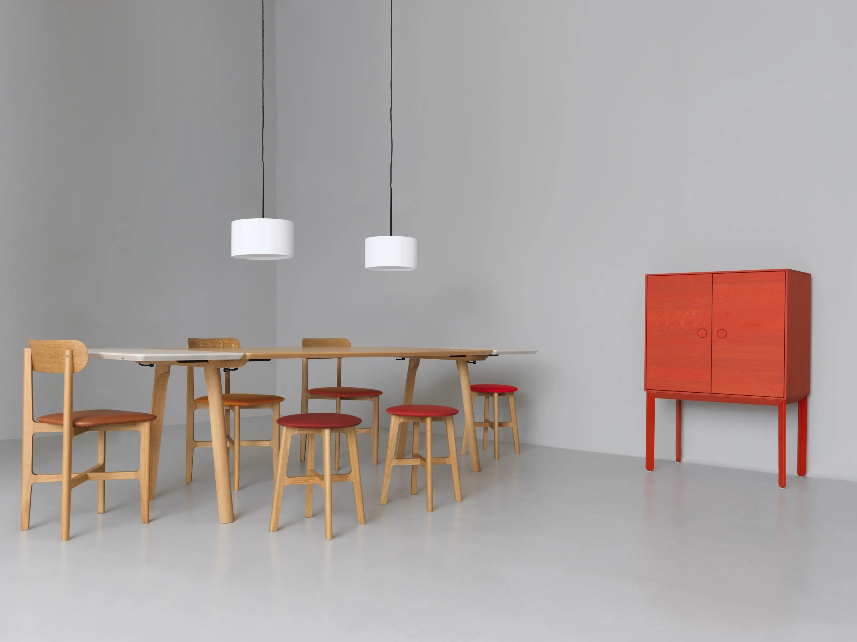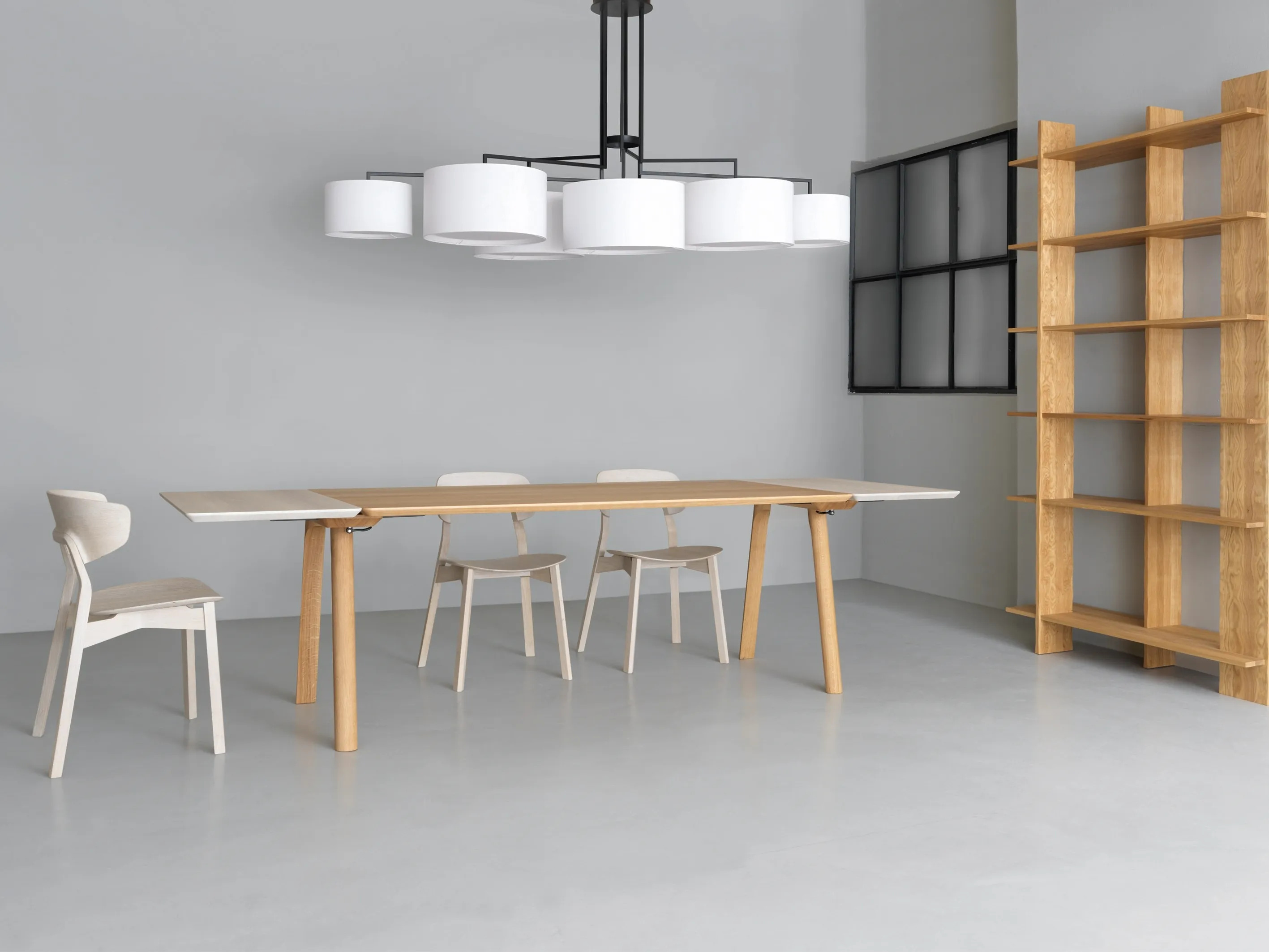 RAIL offers a versatile solution for restaurants, conference rooms, coworking spaces, cafés, event venues, and educational institutions. Its frameless tabletop design exudes a modern aesthetic, while the visible construction of the table trestles adds a unique touch. The table can be extended on both sides with an optional extension leaf, supported by repositioning the trestles to the center. Crafted from solid wood options like ash, oak, knotty oak, and American walnut, or birch multiplex with linoleum, the table is both durable and stylish. The surface is treated with natural oils and waxes, with a matt lacquered finish available for oak. For contract use, a DD-lacquer finish is recommended. The table is demountable and includes a fittings kit with a T-profile and quick release, making it a practical choice for dynamic spaces.