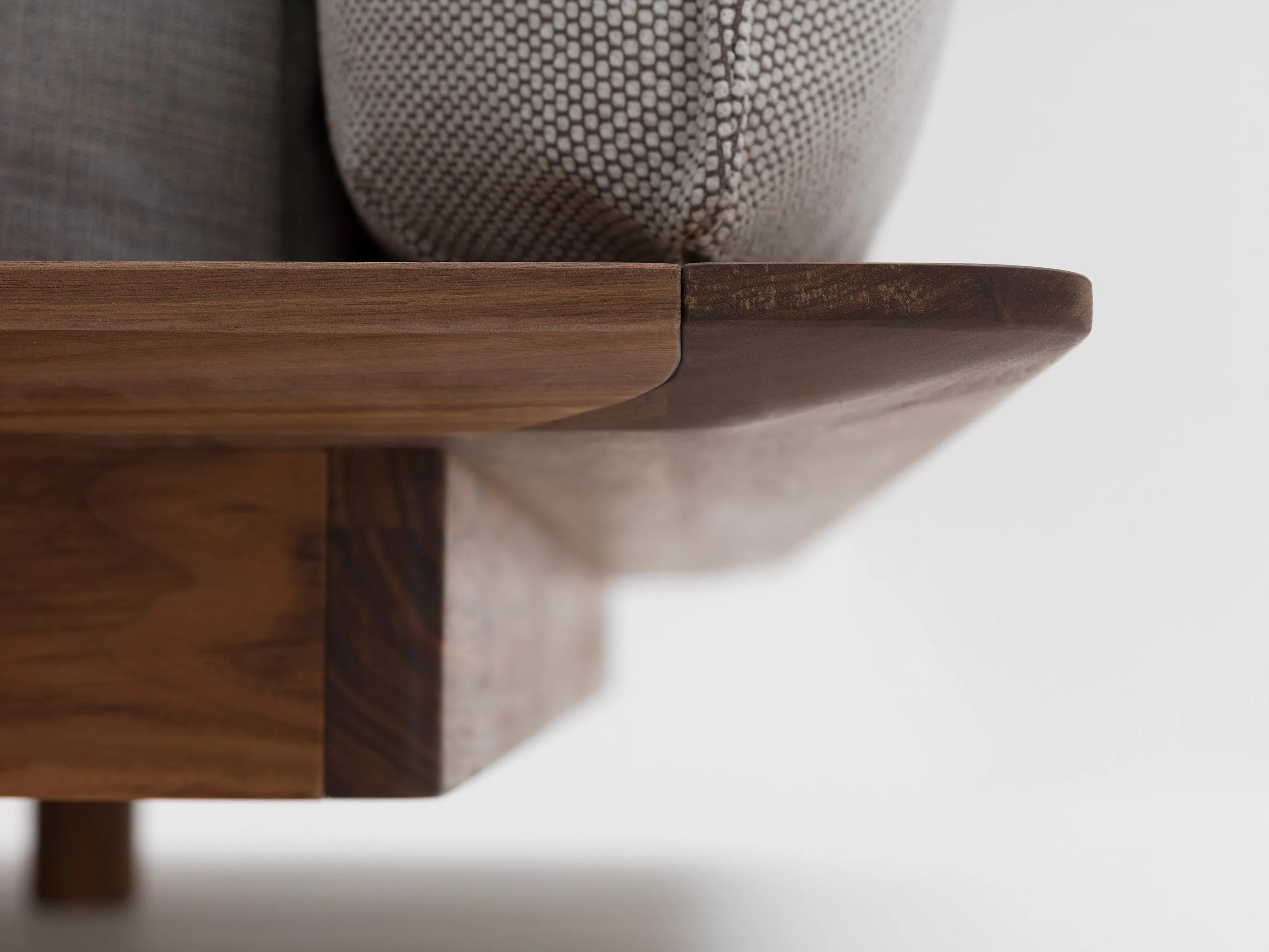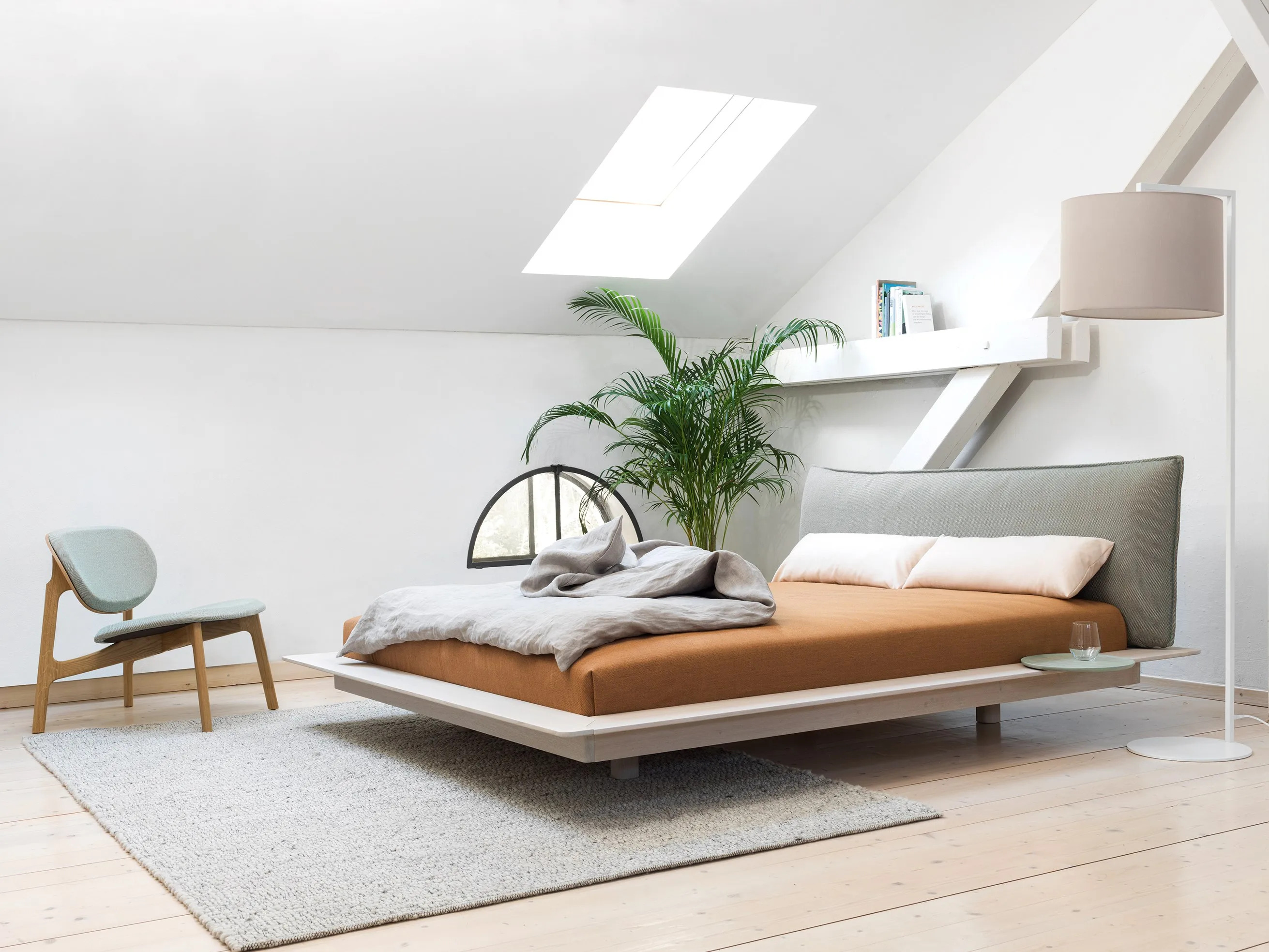 YOMA offers a unique blend of modern design and functionality, ideal for hotels, boutique inns, and family-friendly resorts. Its low frame creates a floating illusion, while the long side doubles as a shelf, featuring a distinctive wave-like wooden connection. Rounded corners enhance its soft, inviting appearance. The mattress, designed for comfort, rests slightly recessed, providing a sleek look. Adjustable back cushions allow for versatile positioning, catering to various activities such as sleeping, reading, or resting. The YOMA Plate, a freely positioned side table, adds a graphical touch to the setup. Crafted from solid wood options like ash, oak, and walnut, the bedframe and side table are treated with natural oils and waxes for durability. The integrated slatted base system and support profiles ensure stability, making YOMA a practical choice for space-saving bedroom design and multifunctional bedroom sets.