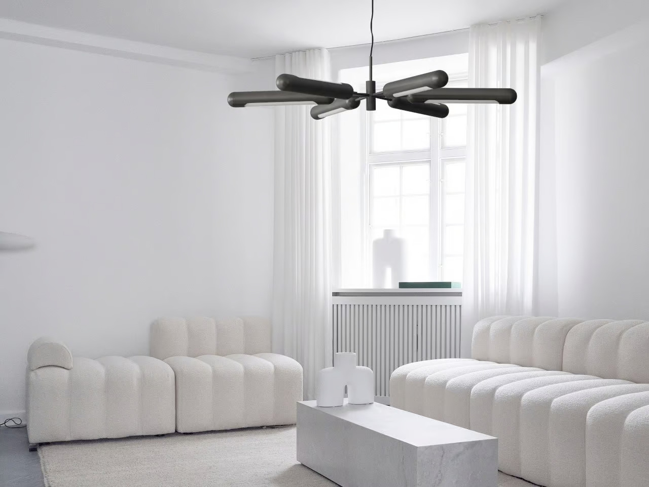A BULLET kollekció jellegzetessége a zárt, cső alakú fém lámpabúra, amely sima, faragott nyílással rendelkezik. A nyílást ívelt opálüveg fedi, amely szűri a belső fényforrás fényét. A kollekció részei a csillár, a függőlámpa és a fali lámpa, mind bronz bevonatú vasból és opálüvegből készültek, az Art Deco ihlette egyedi és szoborszerű világítási élményeket teremtve. A csillár hat állítható karja rugalmas hatszög alakban helyezkedik el, és egy bordázott középpontra van szerelve, ami csillogó és tükröződő minőséget kölcsönöz a lámpának. Két kar felfelé irányul, biztosítva a mennyezet felé irányuló fényt, míg a többi lámpabúra lefelé néz, hogy megvilágítsa a csillár alatti teret. A függőlámpa lineáris kialakítása letisztult, a 1960-as évek konyhai ipari lámpáinak tisztelgése. A lámpabúra két faragott nyílással rendelkezik, amelyeken keresztül a fehér opálüveg szűri a fényt a lámpa alatti térbe.