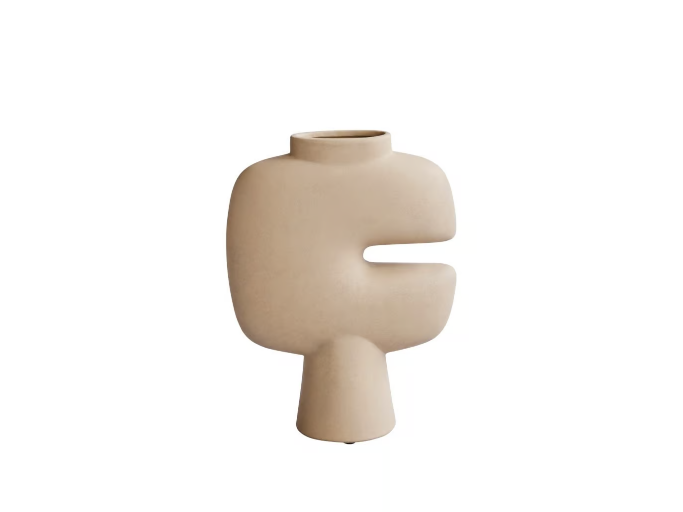 A TRIBAL MEDIO váza a törzsi maszkok archetípusának szobrászati megközelítése, amely ideális lakásdekoráció irodák, szállodák és középületek számára. A keskeny felső nyílás lehetővé teszi egy-egy virágszál elhelyezését, de önmagában is lenyűgöző művészeti tárgyként funkcionál. A nyitott szájra emlékeztető formák nyugodt, poros terrakotta és szürke árnyalatokban pompáznak. Mivel kézzel mázolt, természetes termékről van szó, a színek enyhén eltérhetnek. Bár nem teljesen vízálló, a friss virágokhoz szükséges tasakot tartalmazza. Ez a lakberendezési kiegészítő különleges hangulatot kölcsönöz bármely belső térnek.