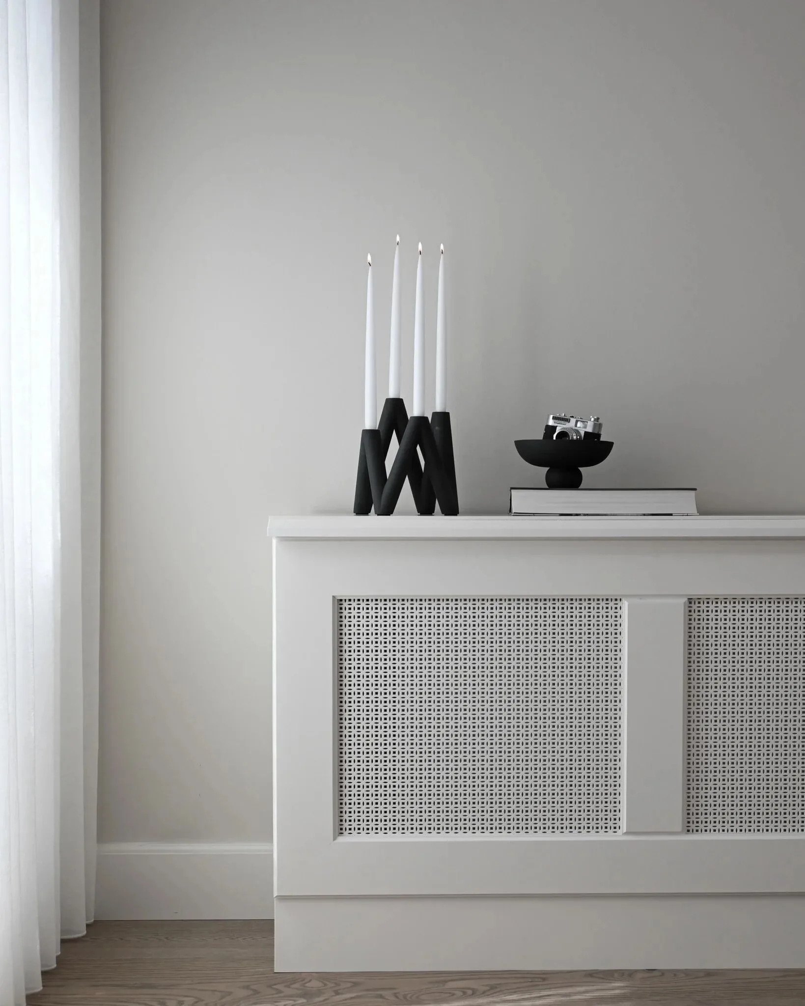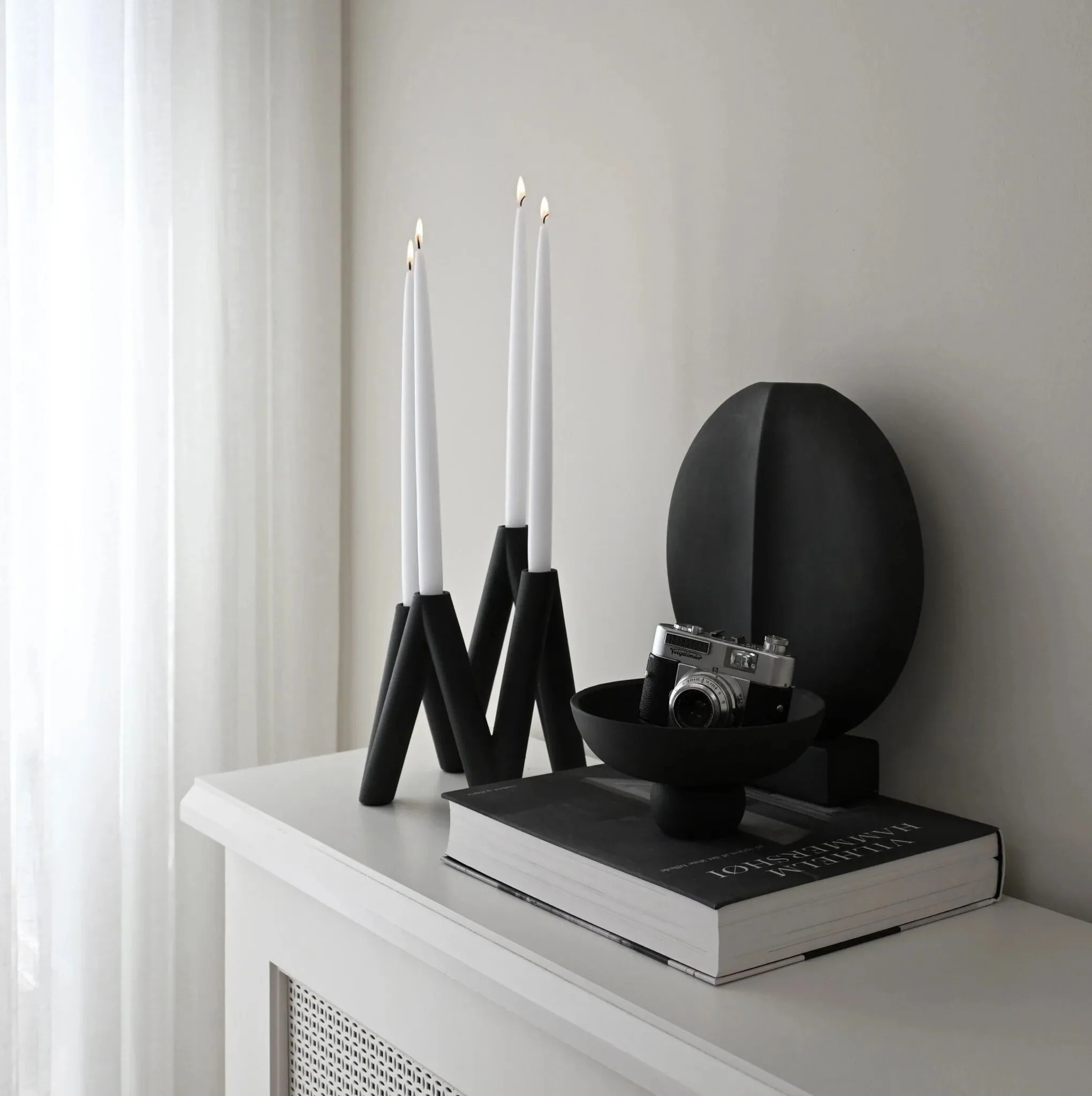 A brutalista építészet ihlette W gyertyatartó éles szögben találkozó, döntött oszlopokból áll. A különböző matematikai szögek alkalmazásával az oszlopok találkozási pontjai eltérő magasságúak, erőteljes grafikai megjelenést kölcsönözve. Két színben elérhető, és négy gyertya számára kialakított lyukakkal rendelkezik. A gyertyatartó kerámiából készült, és mivel kézzel mázolt természetes termék, a színek enyhén eltérhetnek. Ideális választás irodák, szállodák, panziók, vendéglátóhelyek, középületek és üzletek számára, ahol a lakásdekoráció és a lakberendezési kiegészítők fontos szerepet játszanak az otthoni dekorációban.