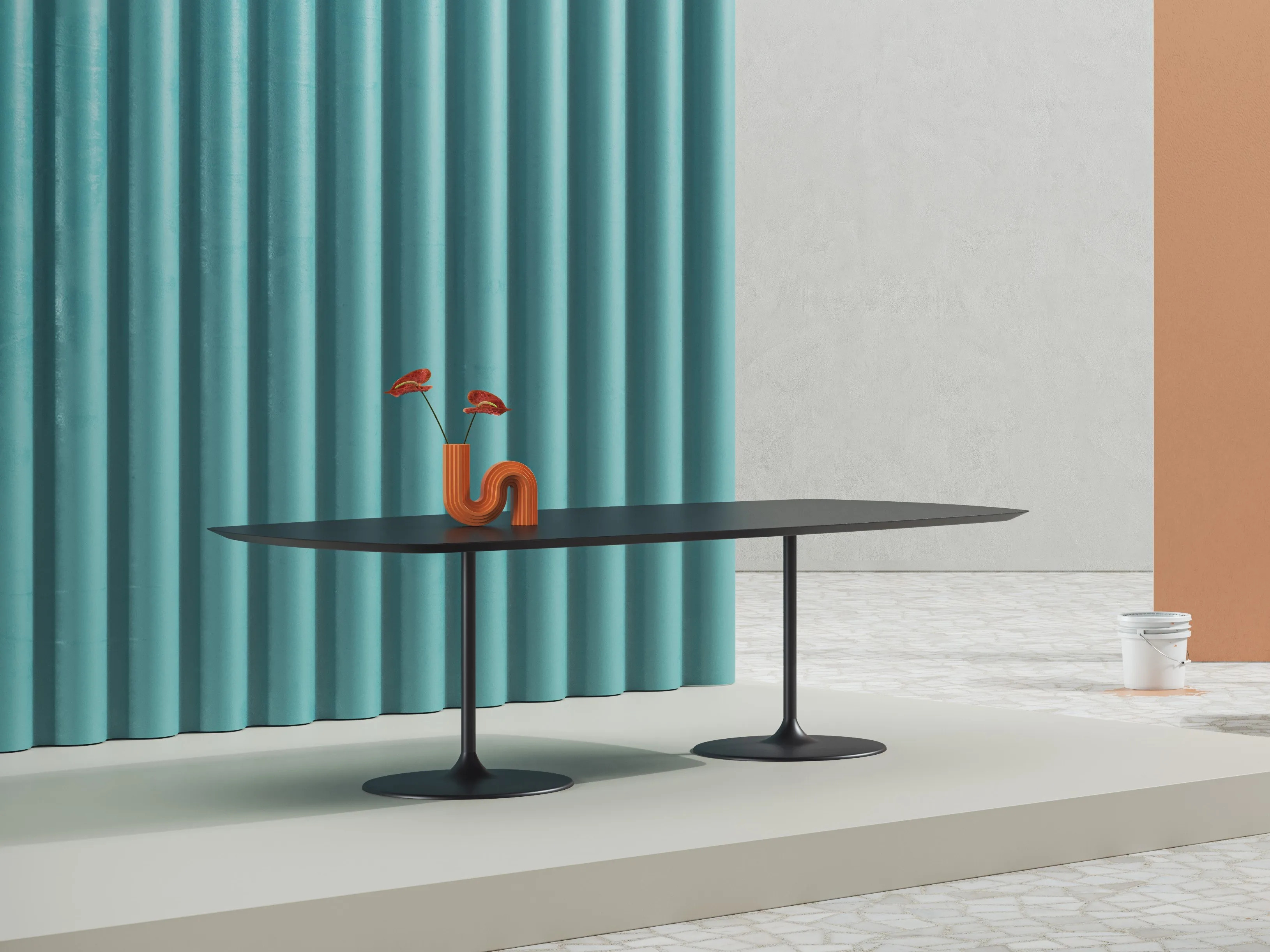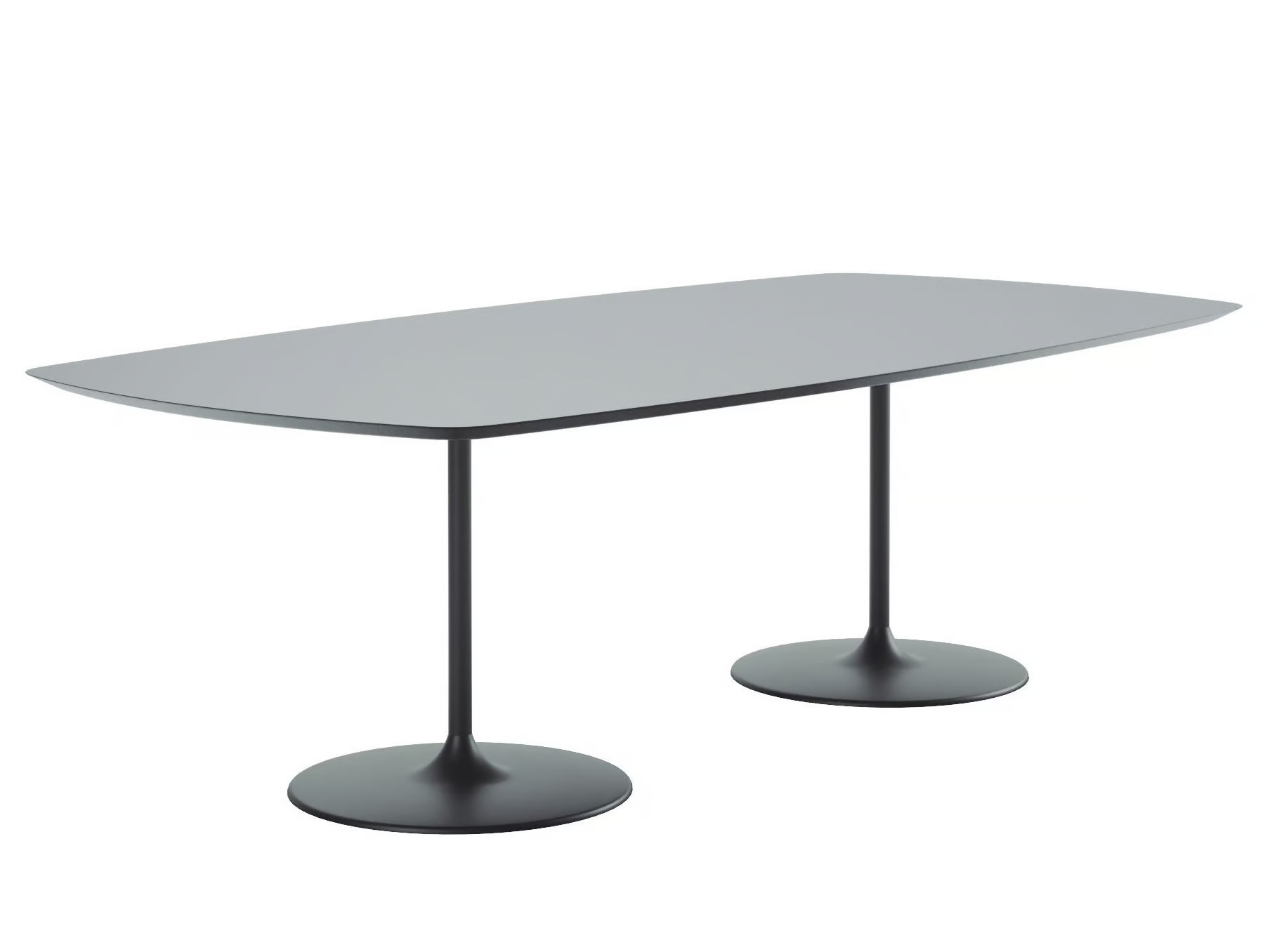 A MALÈNA egy acélból készült étkezőasztal, amely lakkozott felületekkel rendelkezik. Háromféle méretben elérhető kúpos profilú talppal. A 45°-os dőlésszögű asztallapok különböző változatokban kaphatók. Ezek a modern asztalok ideálisak irodai, éttermi vagy kávézói környezetbe. Kétféle magasságban érhetők el: 730 mm és 500 mm, a lapok mérete pedig 700-tól 3000×1300 mm-ig terjed. Az anyagok és színek tekintetében fehér vagy fekete festett acél váz választható. Az asztallapok fekete és fehér laminált kivitelben, dőlt profillal készülnek, harmonizálva a design székekkel és kávézó székekkel.
