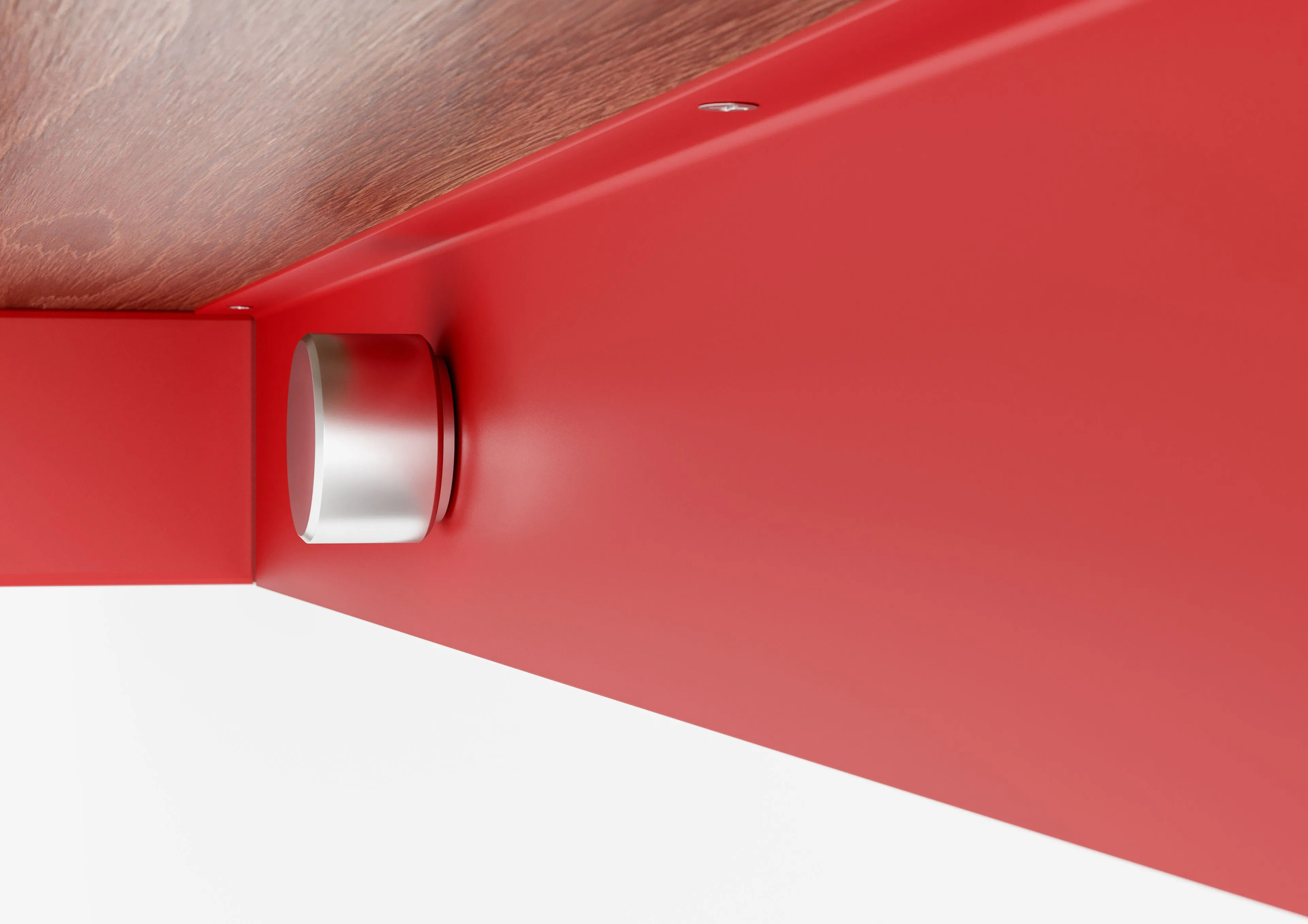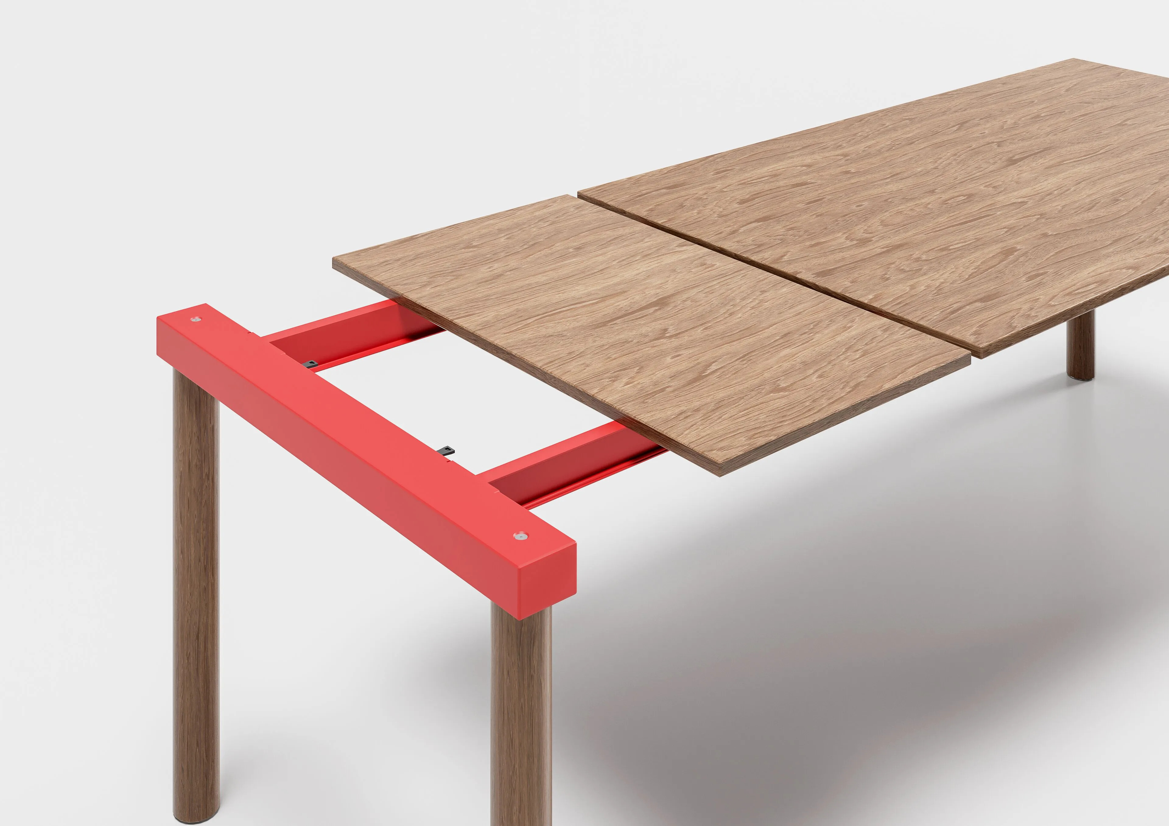 A Puntoquadro étkezőasztal egyszerű és harmonikus geometriai formákból született, amelyet a négyzetes és kerek elemek eredeti kontrasztja jellemez. A vonalakat színes hangsúlyok díszítik, amelyek a funkcionális egyszerűséget erőteljes karakterrel ruházzák fel. Az alumínium sínek, amelyek hagyományosan rejtve maradnak, itt büszkén jelennek meg piros vagy matt fekete lakkozott változatban. Teljes egészében fából készült, nagy átmérőjű lábakkal ellátott asztal, amely gazdag és esztétikailag kiegyensúlyozott megjelenést kölcsönöz a térnek. Ideális választás irodai asztalnak, modern asztalok közé, vagy kávézó székek és design székek társaságában.