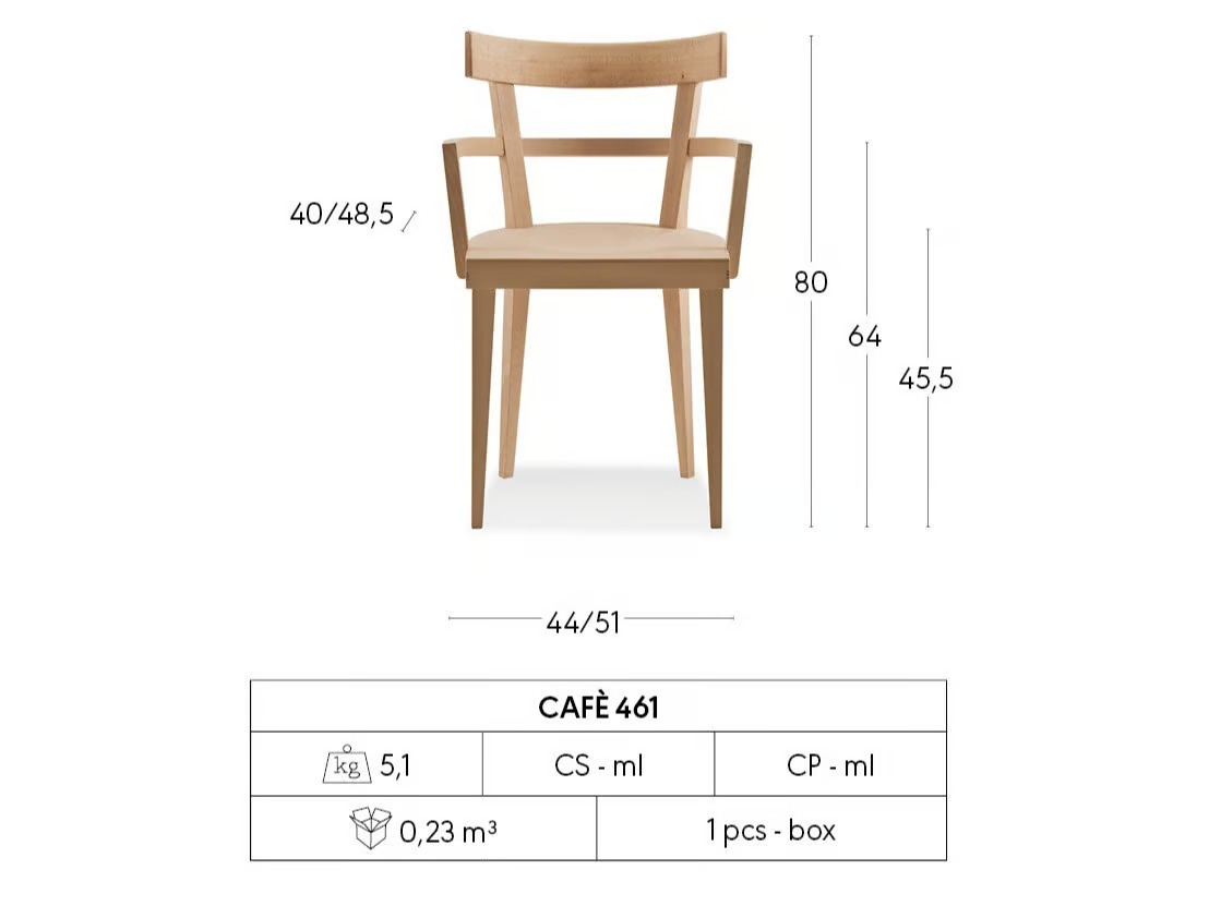 A CAFÈ 461 egy elegáns karosszék, amely tökéletes választás irodák, éttermek, kávézók, oktatási intézmények és konferenciatermek számára. A szék kiváló minőségű, pácolt vagy lakkozott bükkfából készült, és elérhető kárpitozott ülőfelülettel is. Ideális étkezőasztalokhoz és modern asztalokhoz, valamint irodai és kávézó környezetbe. A design székek kategóriájába tartozik, és harmonikusan illeszkedik különféle belső terekbe, legyen szó vendéglátóipari egységekről vagy középületekről.
