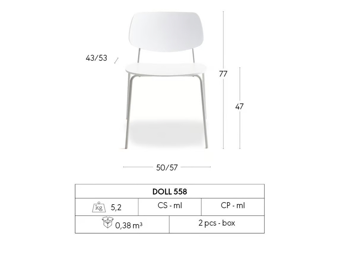 A DOLL 558 egy sokoldalú bútorkollekció, amely magában foglalja az étkezőasztalokat, design székeket, irodai asztalokat, modern asztalokat és kávézó székeket. A termékcsalád részei a székek, karosszékek, lounge székek, bárszékek és asztalok, melyek vonzó, lágy vonalvezetésükkel tűnnek ki. A székek lakkozott acélból készülnek, és egymásra rakhatók, ami praktikus megoldást kínál irodák, éttermek, kávézók, oktatási intézmények, konferenciatermek és vendéglátóipari egységek számára. Az acél anyaghasználat biztosítja a tartósságot és a stabilitást, miközben a modern formatervezés esztétikus megjelenést kölcsönöz a különböző tereknek.