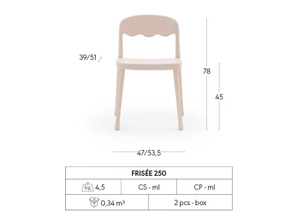 A Frisée 250 egy Cristina Celestino által tervezett szék, amely tömör bükk- vagy kőrisfából készül. A váz különböző felületekkel érhető el: fa pác, matt lakk, vagy színezett pác. Celestino tervezése kiemeli Billiani anyaghasználatát és szakértelmét, tiszta színekkel és finoman ívelt sarkokkal. A székekhez különböző méretű asztalok – két magas és két alacsony – valamint bárszékek is tartoznak, amelyek elegáns és kifinomult megjelenést biztosítanak. Ideális választás étkezőasztalokhoz, irodai asztalokhoz, modern asztalokhoz, valamint kávézó székekhez, tökéletesen illeszkedve irodák, éttermek, kávézók, oktatási intézmények és vendéglátóipari egységek környezetébe.