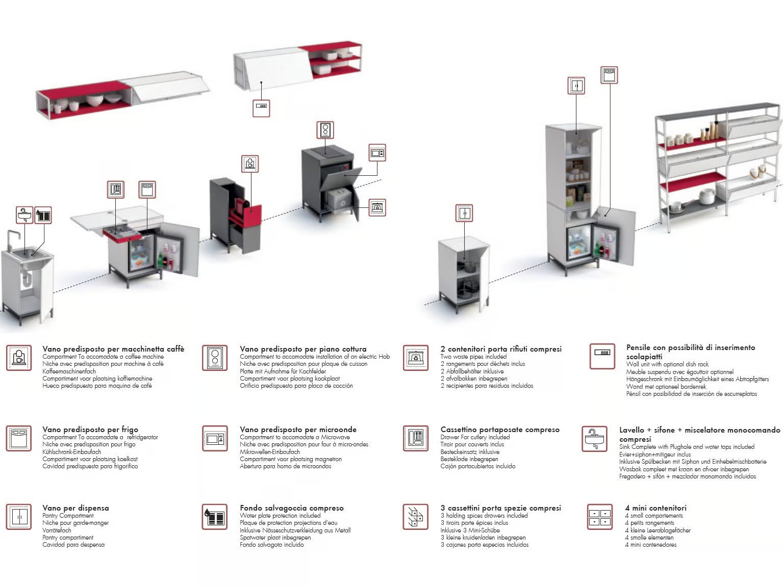 A DOMOMAG Mini konyha ideális választás éttermek, kávézók, szállodák és catering cégek számára, akik modern konyhát keresnek. Ez a konyhabútor szett különböző rekeszekkel rendelkezik, amelyek lehetővé teszik a kávéfőző, hűtőszekrény, elektromos főzőlap és mikrohullámú sütő elhelyezését. A beépített evőeszköz fiók és a kamra rekesz további tárolási lehetőségeket biztosítanak. A két hulladékcsővel ellátott rendszer megkönnyíti a hulladékkezelést. A DOMOMAG egyedi konyhabútorok jellemzői közé tartozik a teljes konfigurálhatóság, a kompakt méret, valamint a mobilitás és áthelyezhetőség, amelyet az elektromos csatlakozások tesznek teljessé.