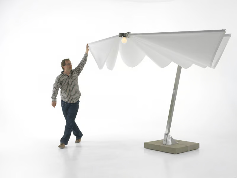 A Kosmos napernyő az Extremis innovációjának jellegzetes példája. Ventilátorszerű nyitási és zárási mechanizmusa révén könnyen kezelhető, és alacsonyra nyitható, így a padok mellé helyezve is kényelmes árnyékot biztosít. Ezáltal fokozza a meghitt hangulatot, amit a Kosmos már önmagában is nyújt. Lapos kialakítása kiváló szélállóságot garantál. A technikai elemek rejtve maradnak, így esztétikai szempontból is kiemelkedő. Két rejtett mágnes tartja nyitva, amelyek erős szél esetén elengednek, és a napernyő automatikusan bezáródik. Egy egyszerű bőrszíj biztosítja, hogy a nyitott napernyő megfelelő dőlésszöggel rendelkezzen, így a víz könnyedén lefolyik róla.
