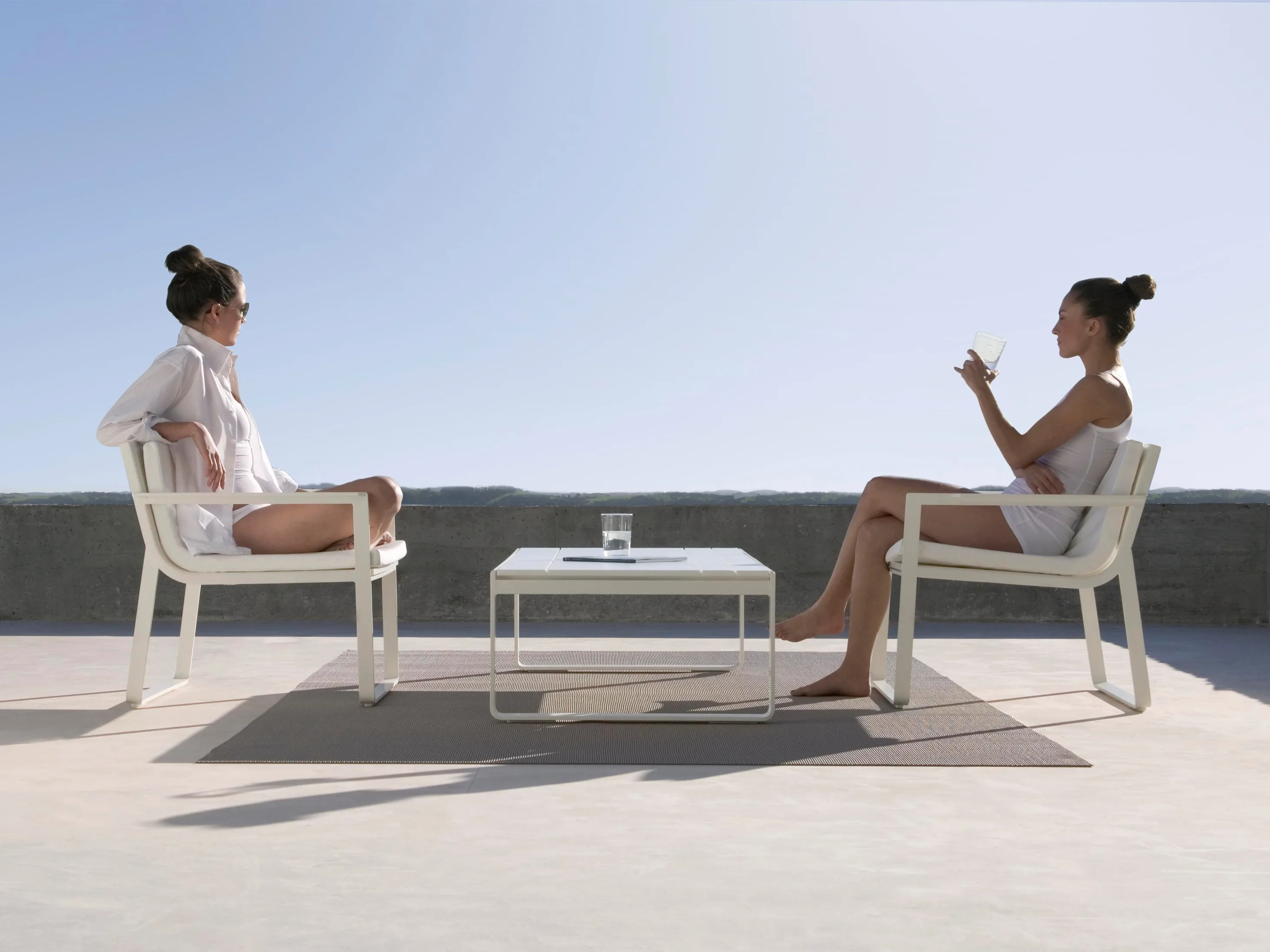 A FLAT kanapé a modern terek szögletes és lapos ortodoxiáját ötvözi az emberi test íveivel és a beltéri kanapék kényelmével. Ez a designer kanapé hegesztett, termo-lakkozott alumínium profilokból és teljesen újrahasznosítható polietilénből készül, elérhető antracit, fehér, bronz és homok színekben. A kényelmet különböző textúrájú és színű mini matracok és párnák biztosítják, amelyek a legvisszafogottabbtól a legmerészebbig testre szabhatók. A FLAT kollekció kiegészítőivel kombinálható, egyszerű dizájnja pedig lehetővé teszi, hogy számos stílushoz és környezethez illeszkedjen, legyen szó nappali bútorokról vagy irodai kanapéról. Mario Ruiz eredeti tervezése a GANDIABLASCO számára, amely a szállodai bútorok és kényelmes kanapék világában is megállja a helyét. A kollekció színmintái között megtalálható a fehér, achát szürke, cement szürke, homok, bronz, kék szürke és antracit.
